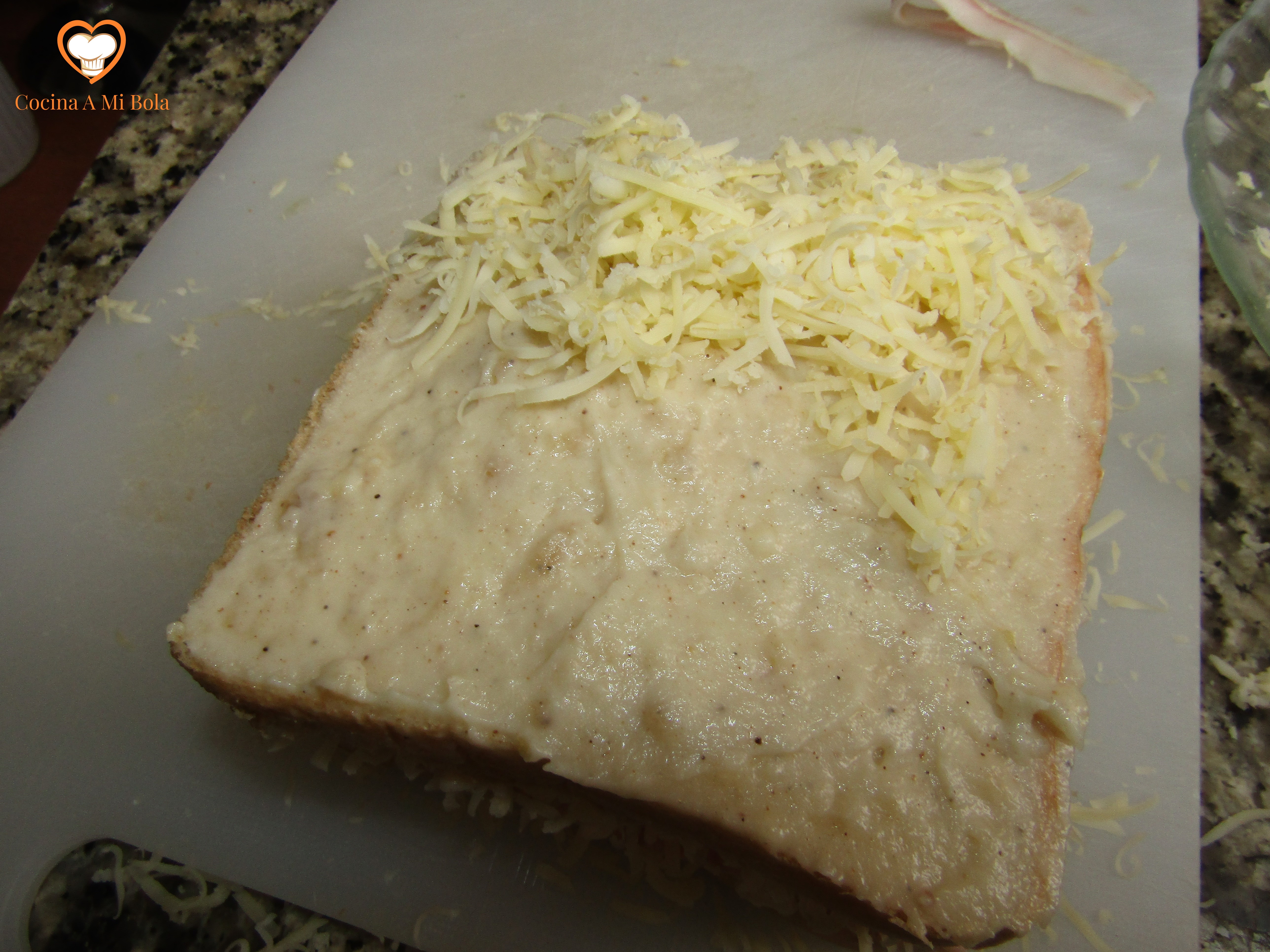 TERCERO.- Toma una rebanada de pan de molde gruesa; unta sobre ella una capa fina de salsa bechamel y cúbrela ahora con el queso recién rallado. Presiona suavemente con la palma de la mano o con una paleta para compactar.