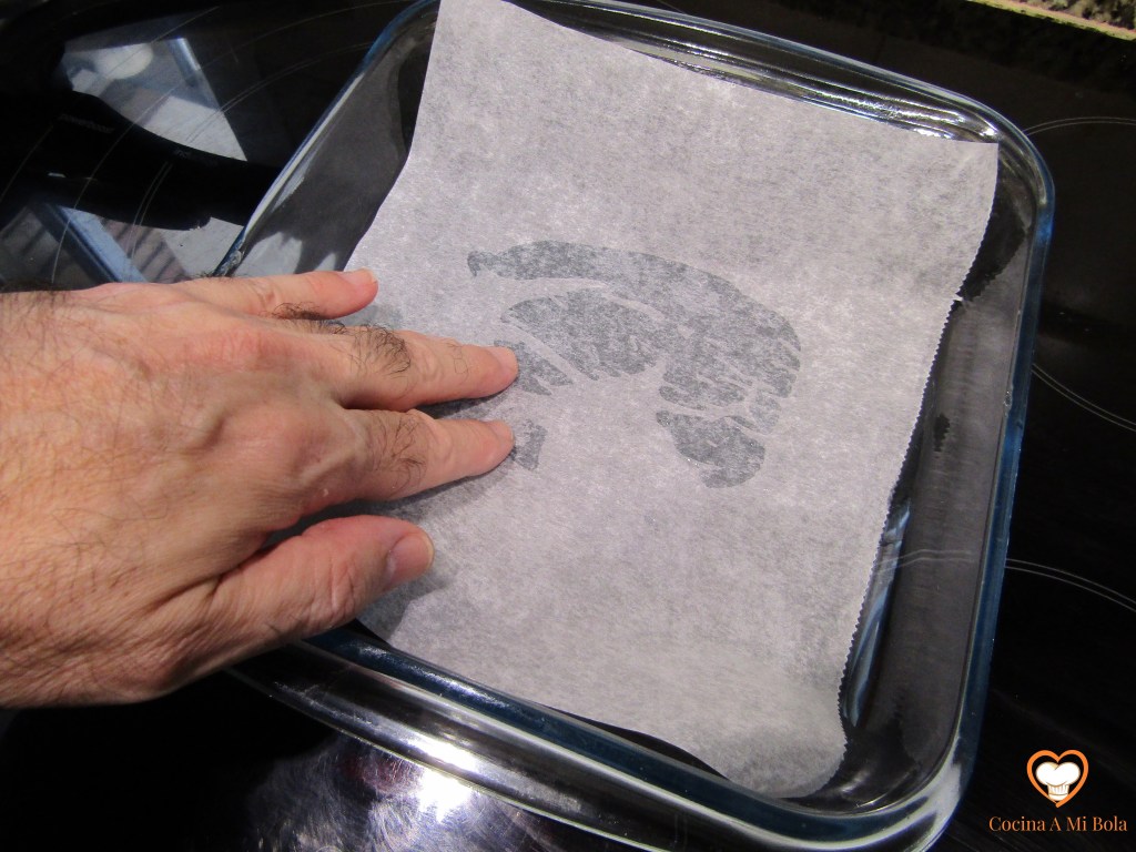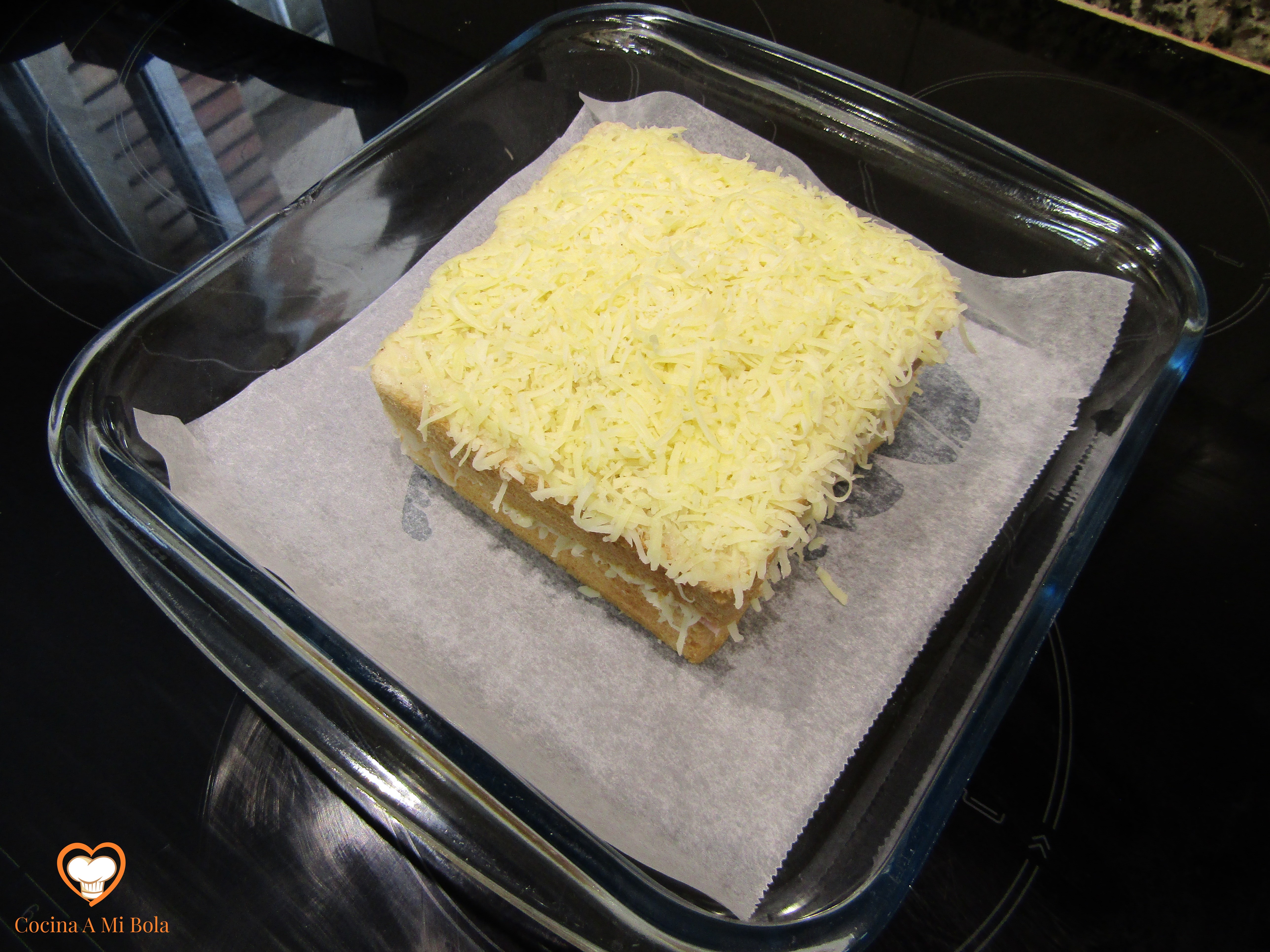 OCTAVO.- Usa una fuente o un plato aptos para horno; humedécelo ligerísimamente y pon sobre él un papel de hornear. Verás que al empapar el papel no se moverá y ya podrás colocar ahí el Croque Monsieur.