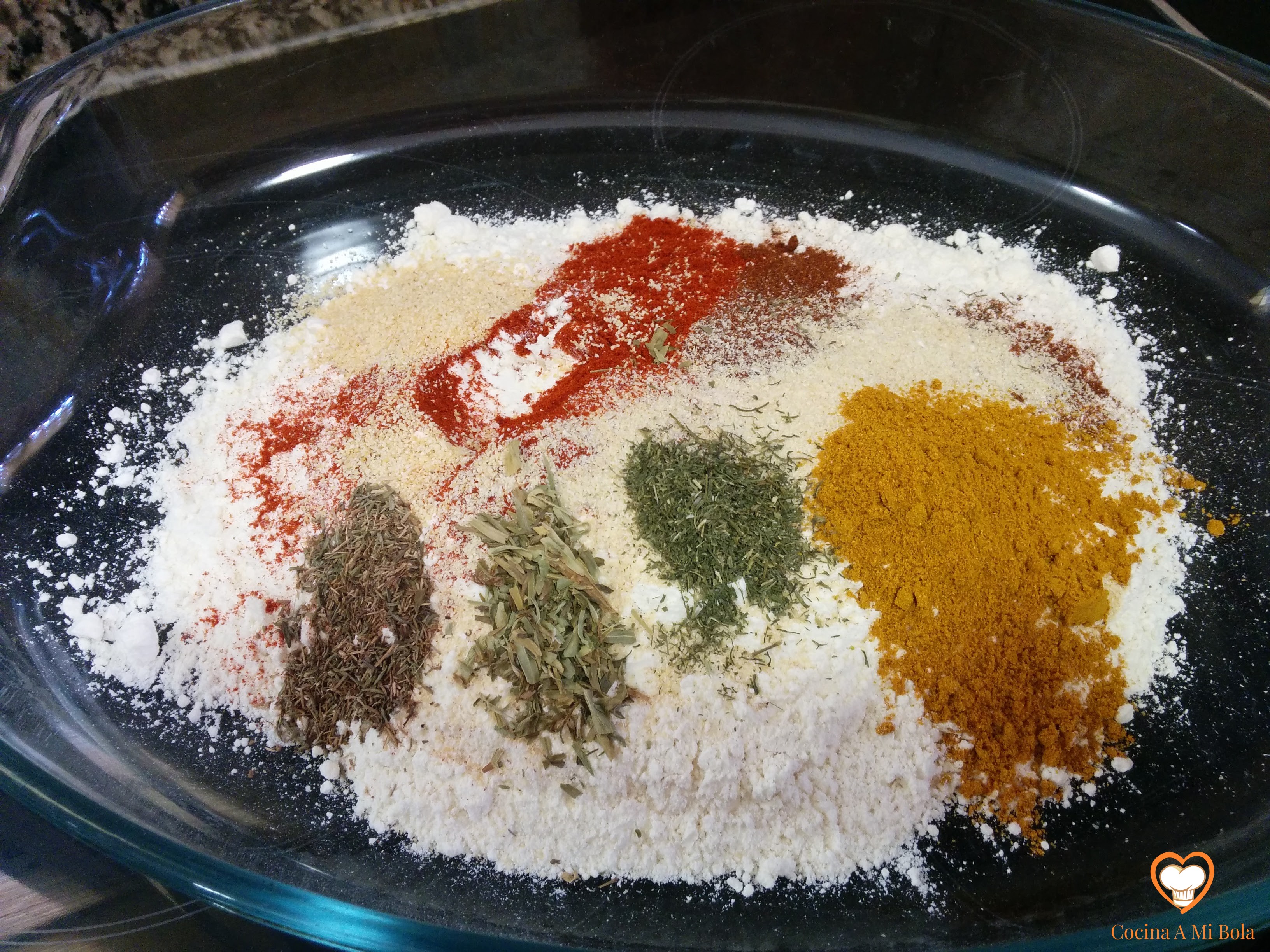 TERCERO.- Añade todas las especias y mezcla muy bien. He de insistir en que lo mezcles todo bien porque las harinas tienden a apelmazarse e impiden esta amalgama uniforme de especias que pretendemos.
