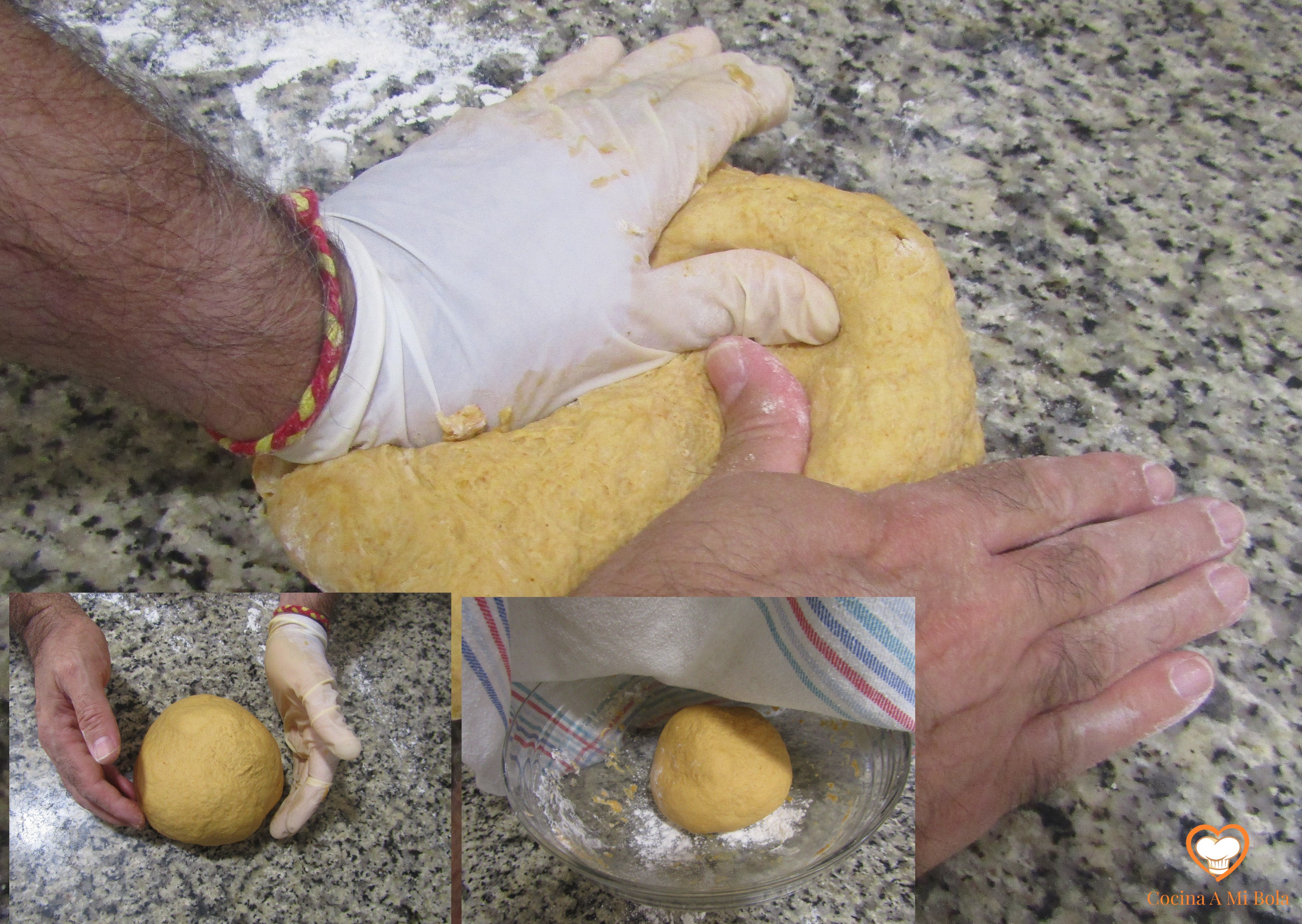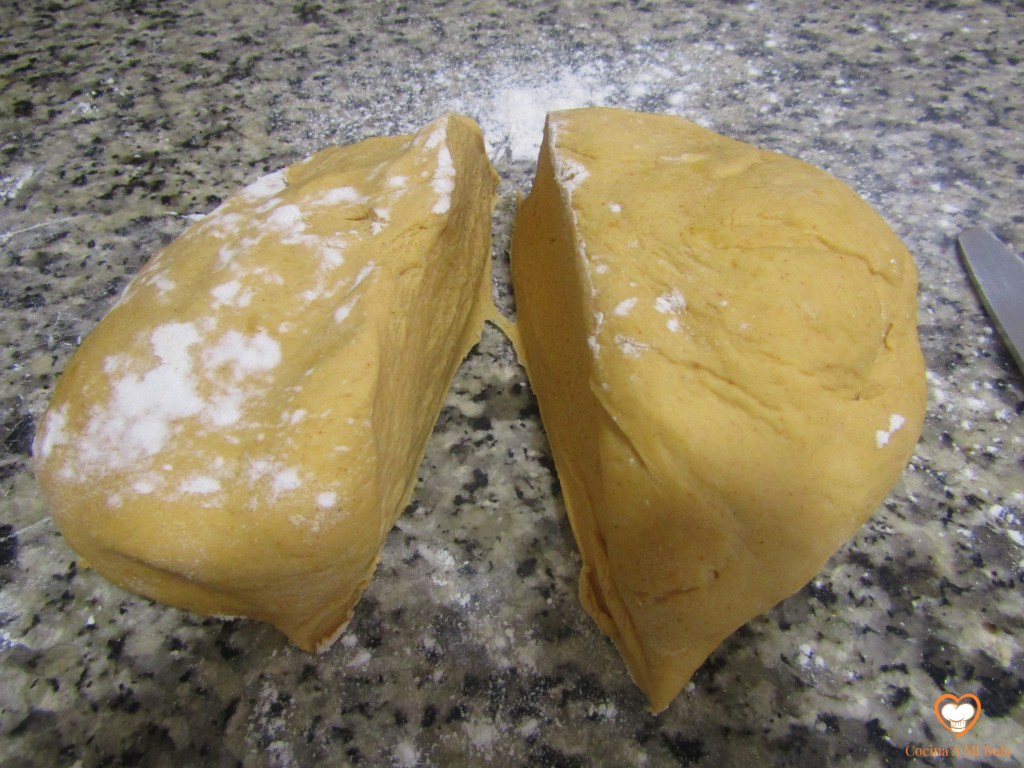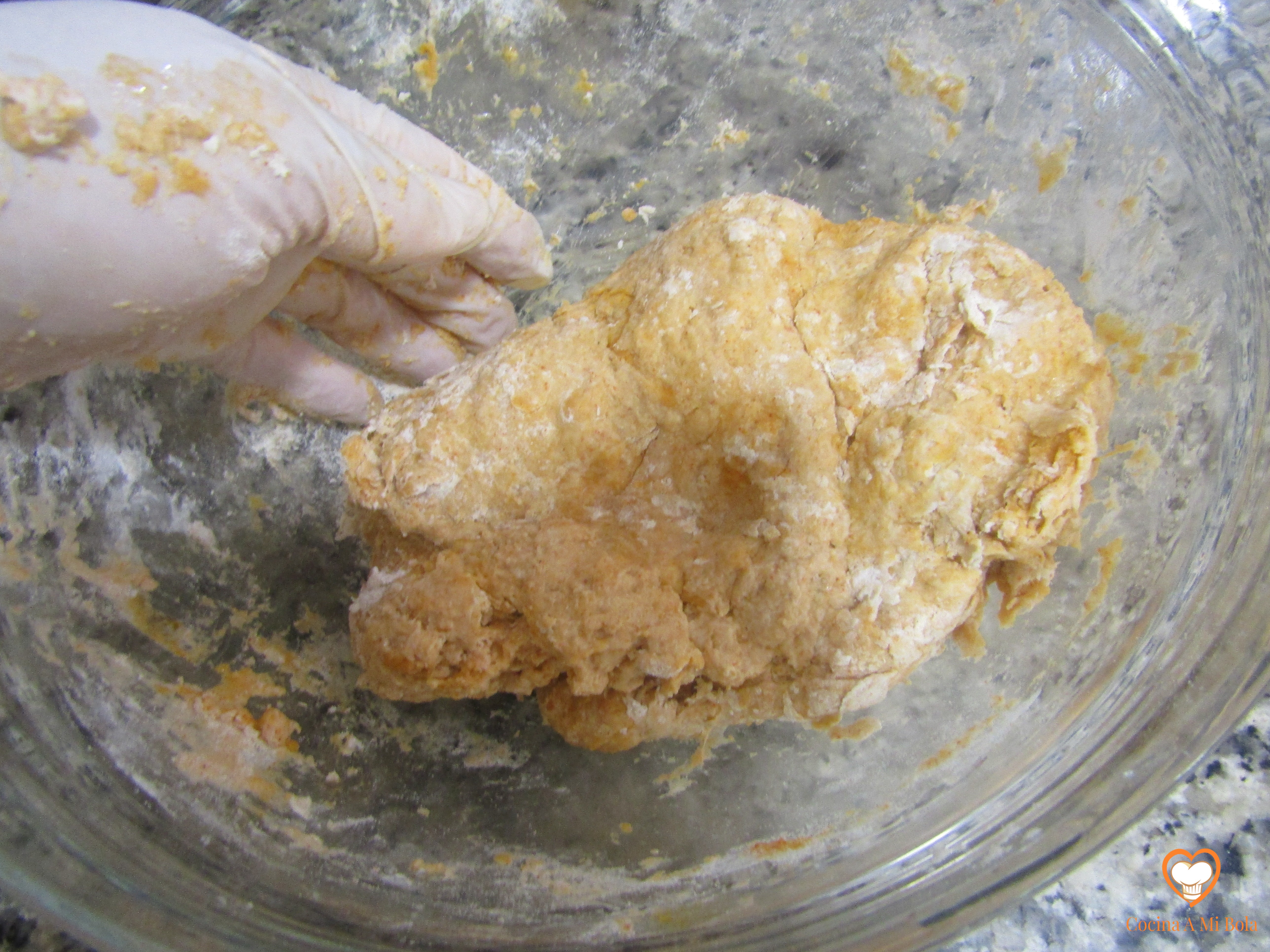 CUARTO.- Echa el agua muy poco a poco y mezcla bien hasta que consigamos una pasta bastante densa y sin grumos de color anaranjado. Repásala por todas partes con los dedos para cerciorarte que no hay grumos.