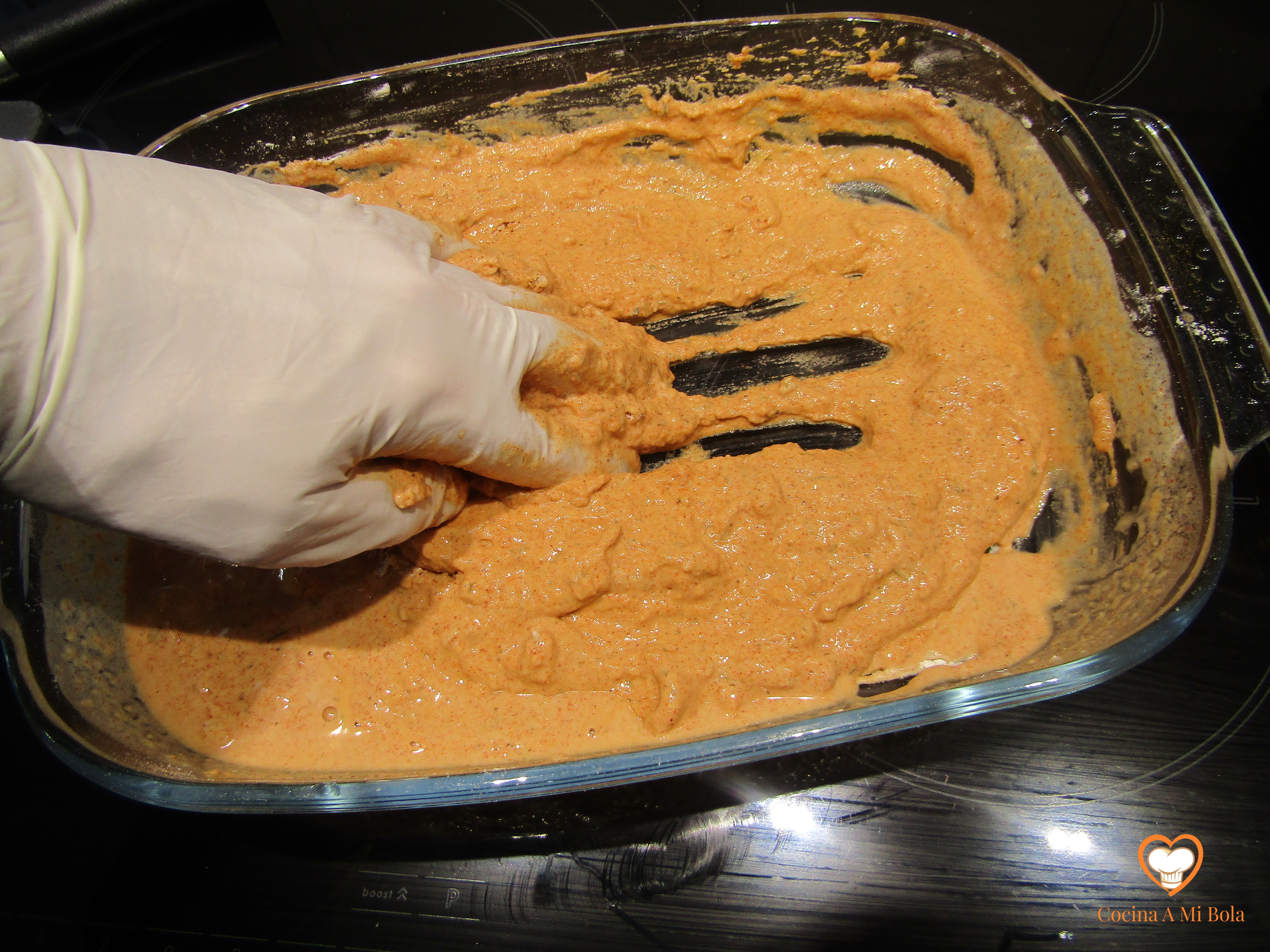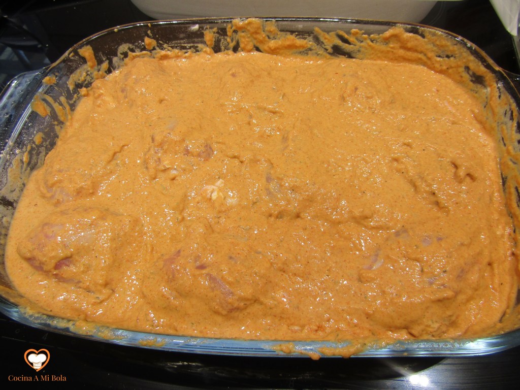 QUINTO.- Embadurna los muslos uno a uno y procura que queden sumergidos bajo esta pasta de aliño. Cubre la fuente con film de cocina y mételo en la nevera unas 8 ó 10 horitas.