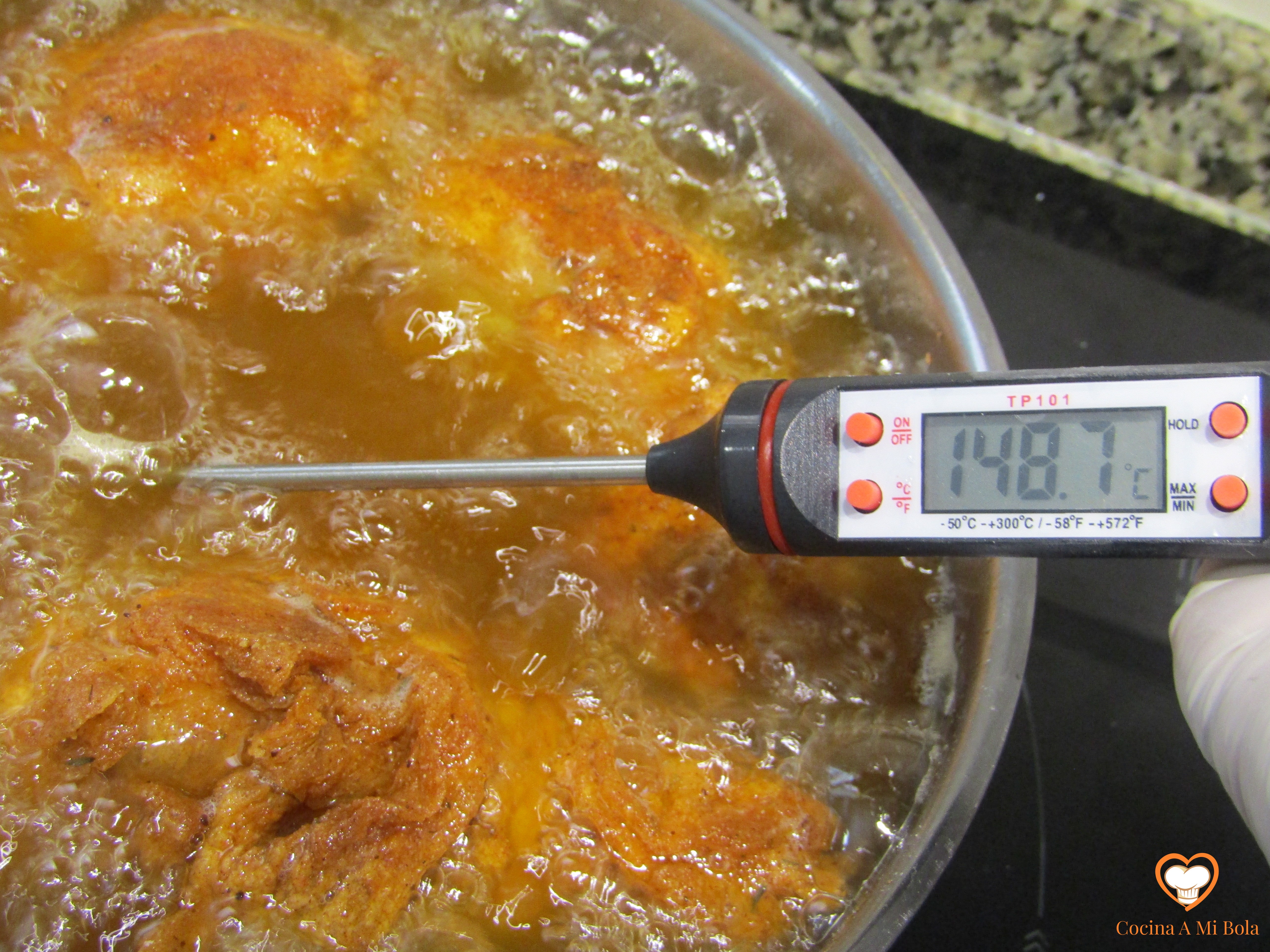 NOVENO.- Tras unos 3 minutos, dales la vuelta con cuidado para que no se nos caiga el rebozado y tenlos otros 3 minutos, tras lo cual bajamos el fuego hasta que la temperatura quede en torno a los 145ºC a 150ºC y así los tendremos durante unos 10 minutos más dándoles la vuelta cada par de minutos. El muslo es una pieza que tarda bastante en hacerse en su zona próxima al hueso, así que te sugiero que abras el primero y juzgues si necesita más tiempo aún, o tal vez menos.