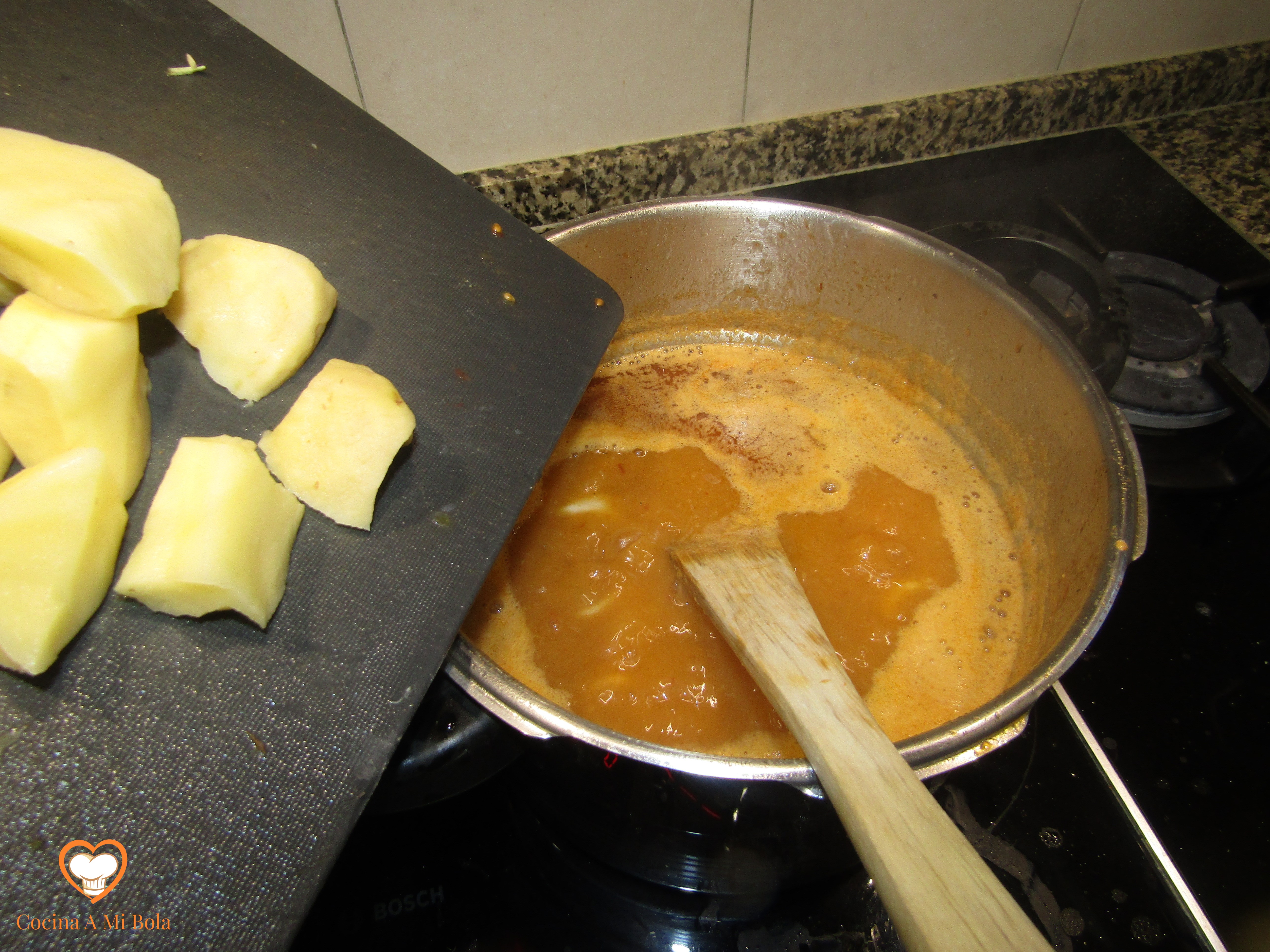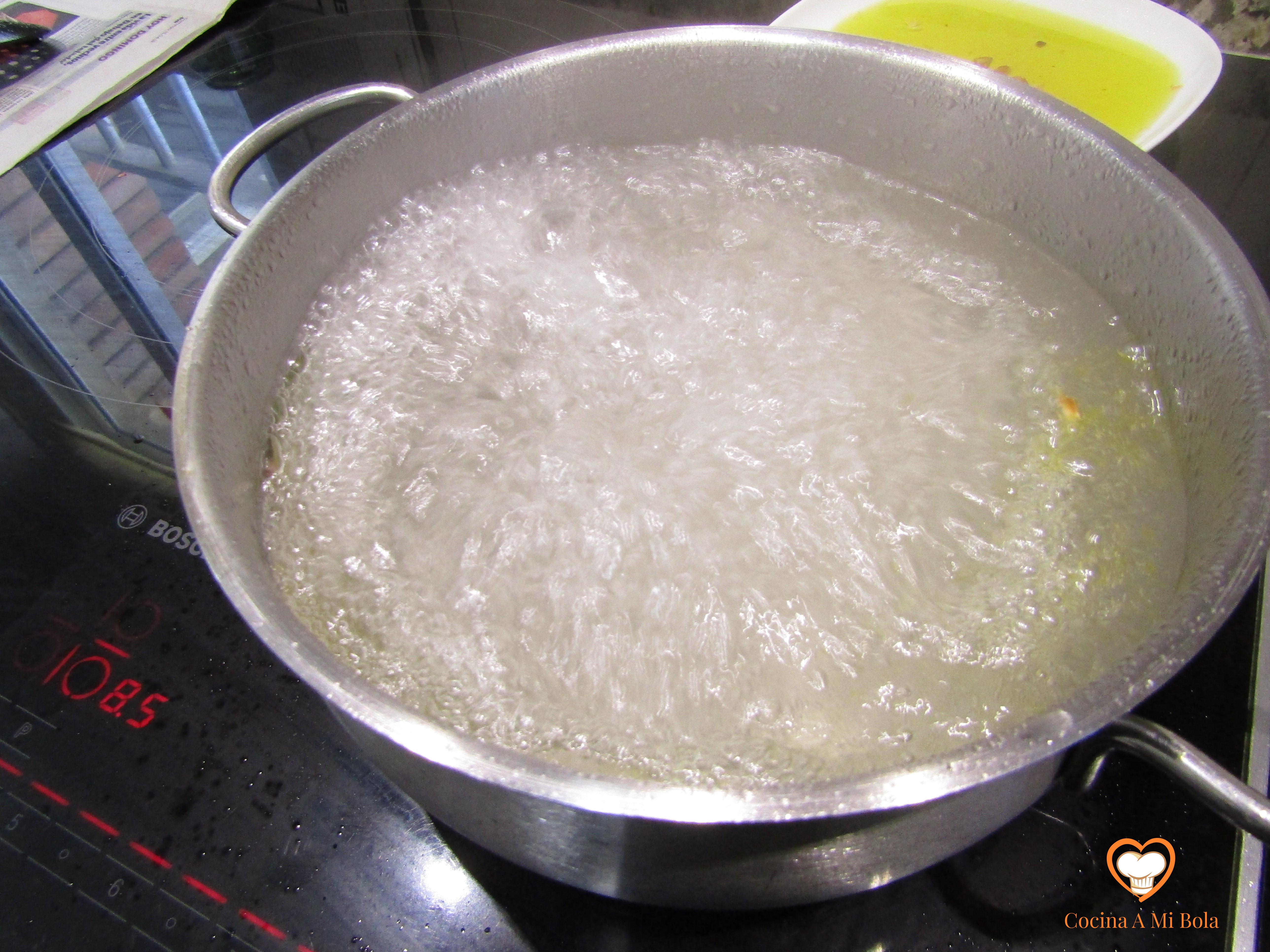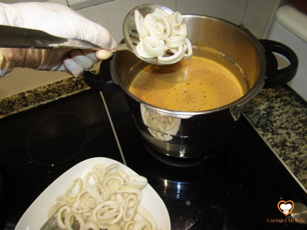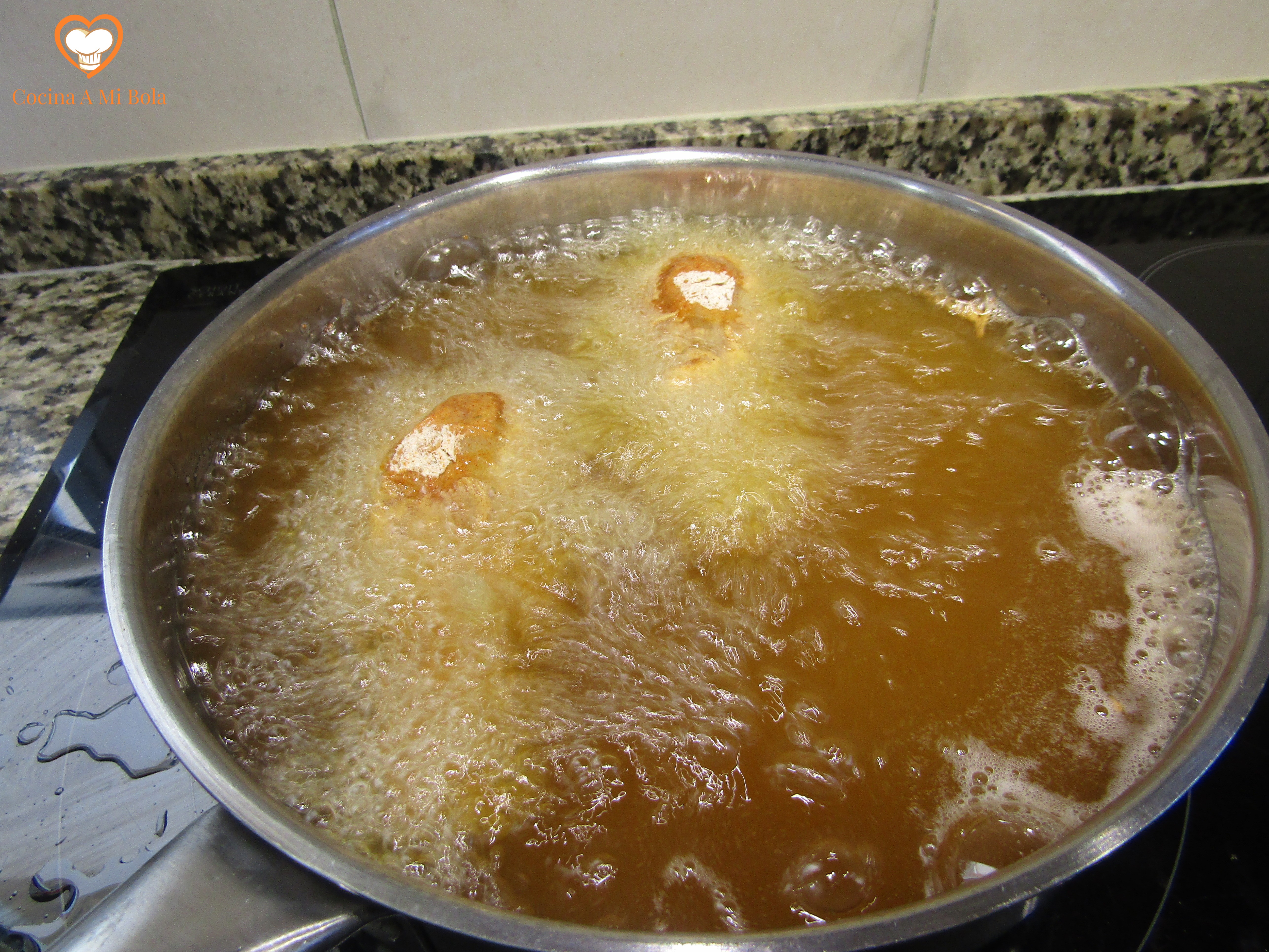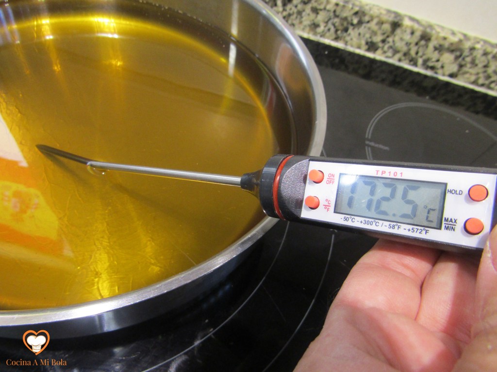 SÉPTIMO.- Si tienes freidora, será más sencillo ya que podremos subir o bajar la temperatura del aceite con el termostato, y si lo haces en sartén, te recomiendo que uses un termómetro para orientarte. No son caros en absoluto y ayuda a hacer mejores frituras. Vamos con la sartén convencional y pon aceite de girasol en cantidad suficiente para que cubra algo más de la mitad de la pieza, como mínimo. Usamos aceite de girasol porque considero un verdadero desperdicio utilizar el de oliva para una fritura tan especiada.
