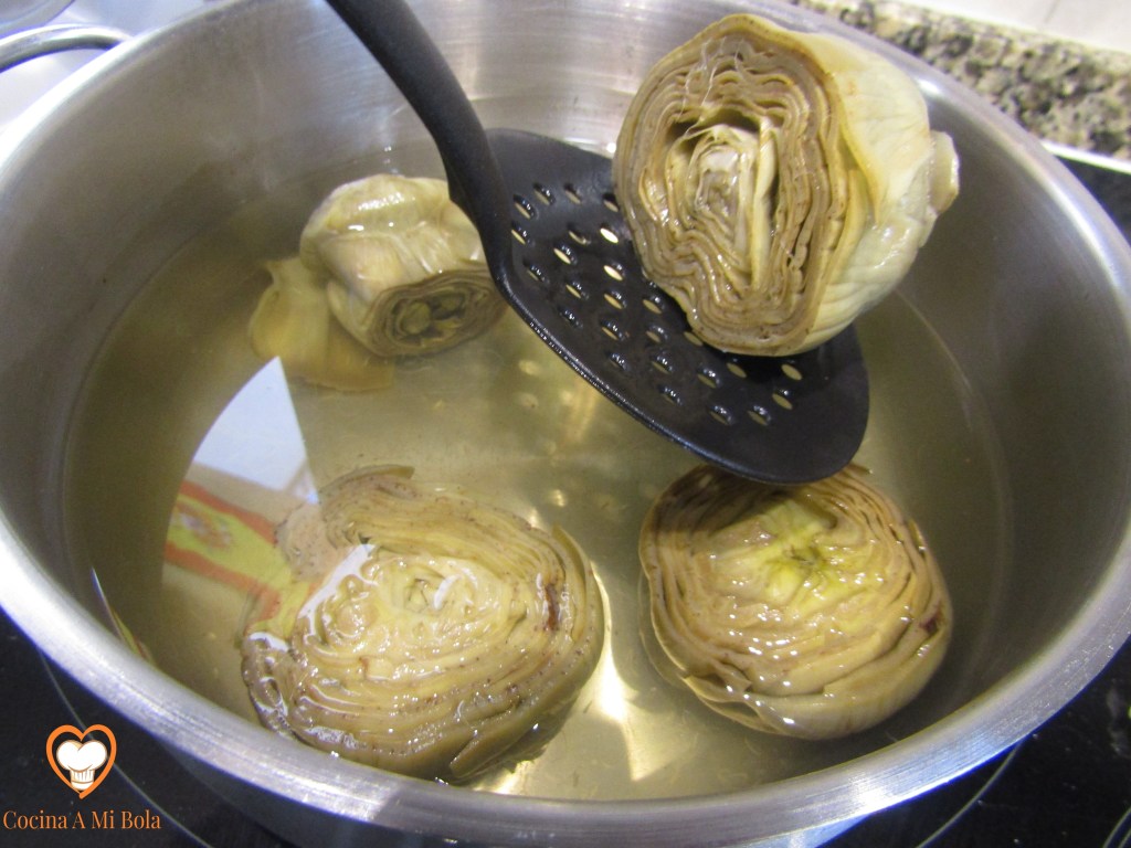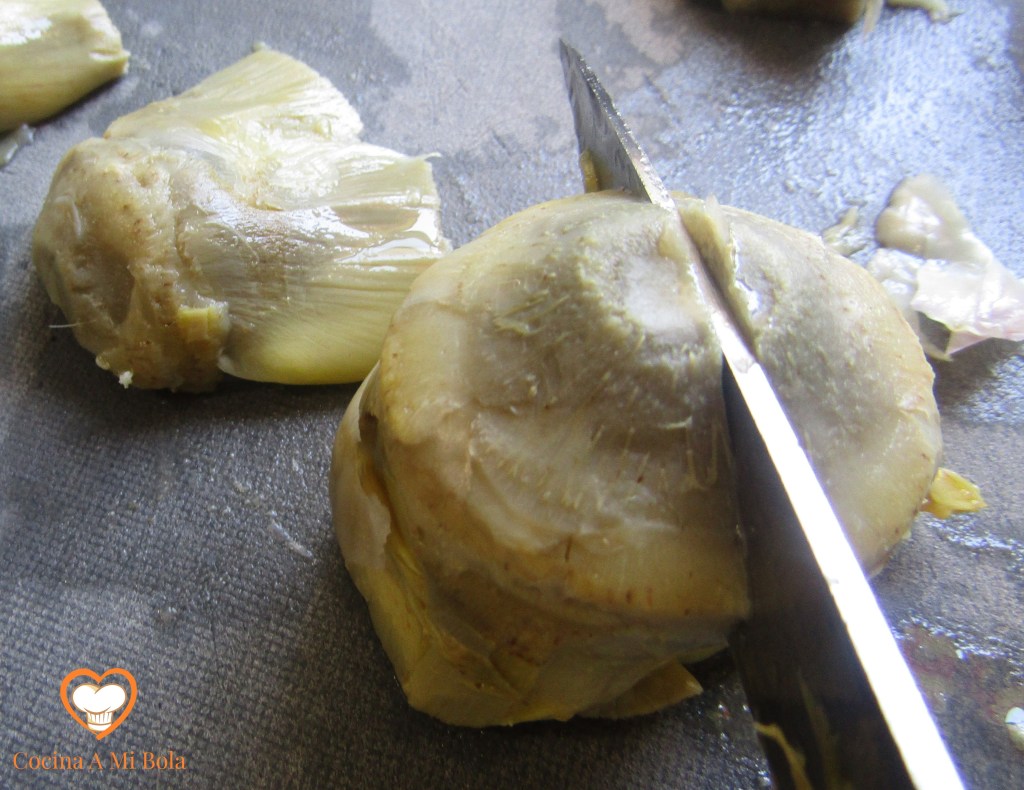 SEGUNDO.- Limpiamos las alcachofas quitando todas las hojas exteriores hasta quedarnos con el corazón, de color amarillo, tal y como hago en la receta “alcachofas con jamón”,  solo que eliminaremos también el tallo.