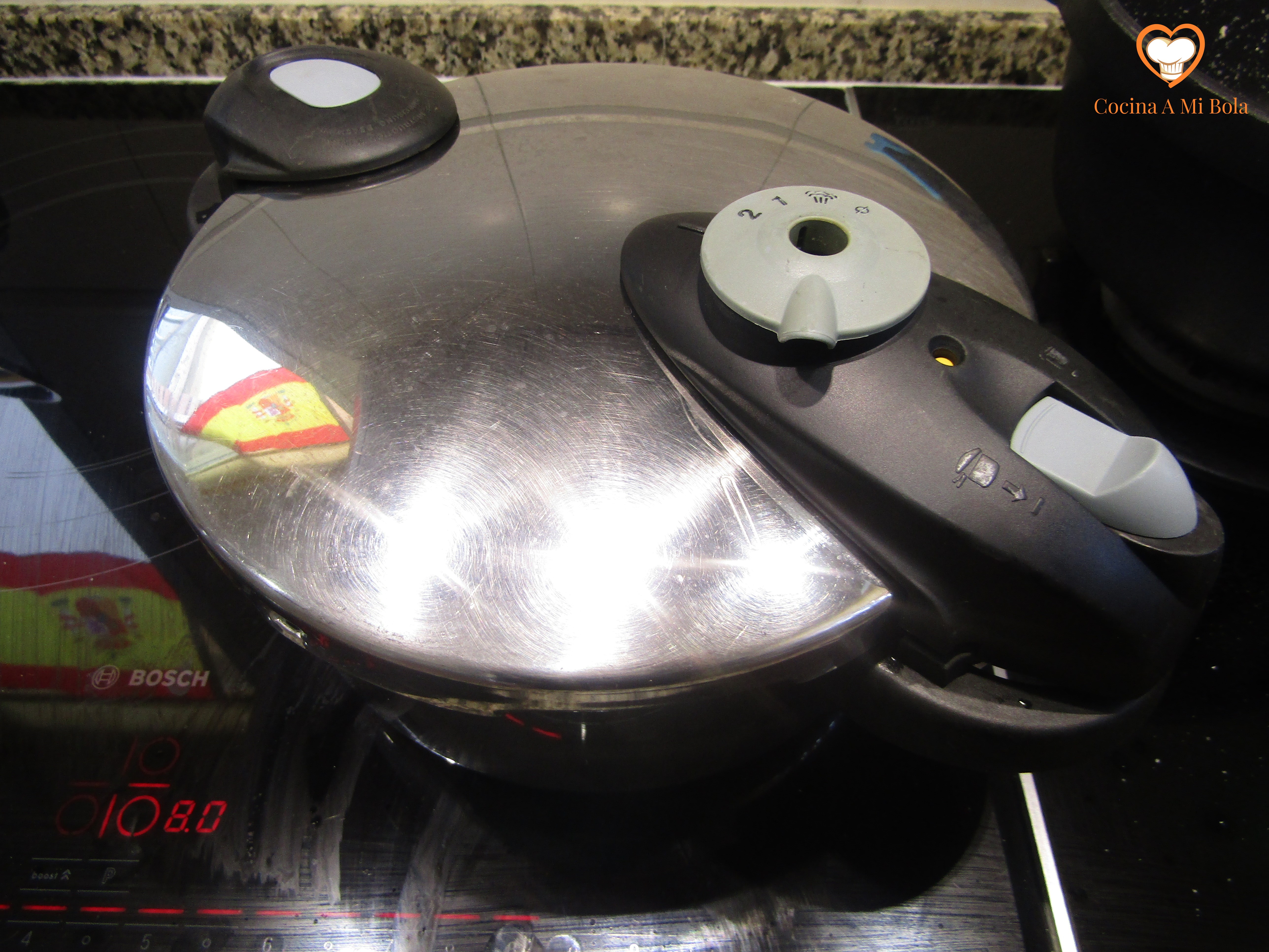 PRIMERO.- Pon agua en la olla express (rápida) de forma que no llegue a cubrir la alcachofa una vez pelada y cortado el tallo y la corona. Pon sal.
