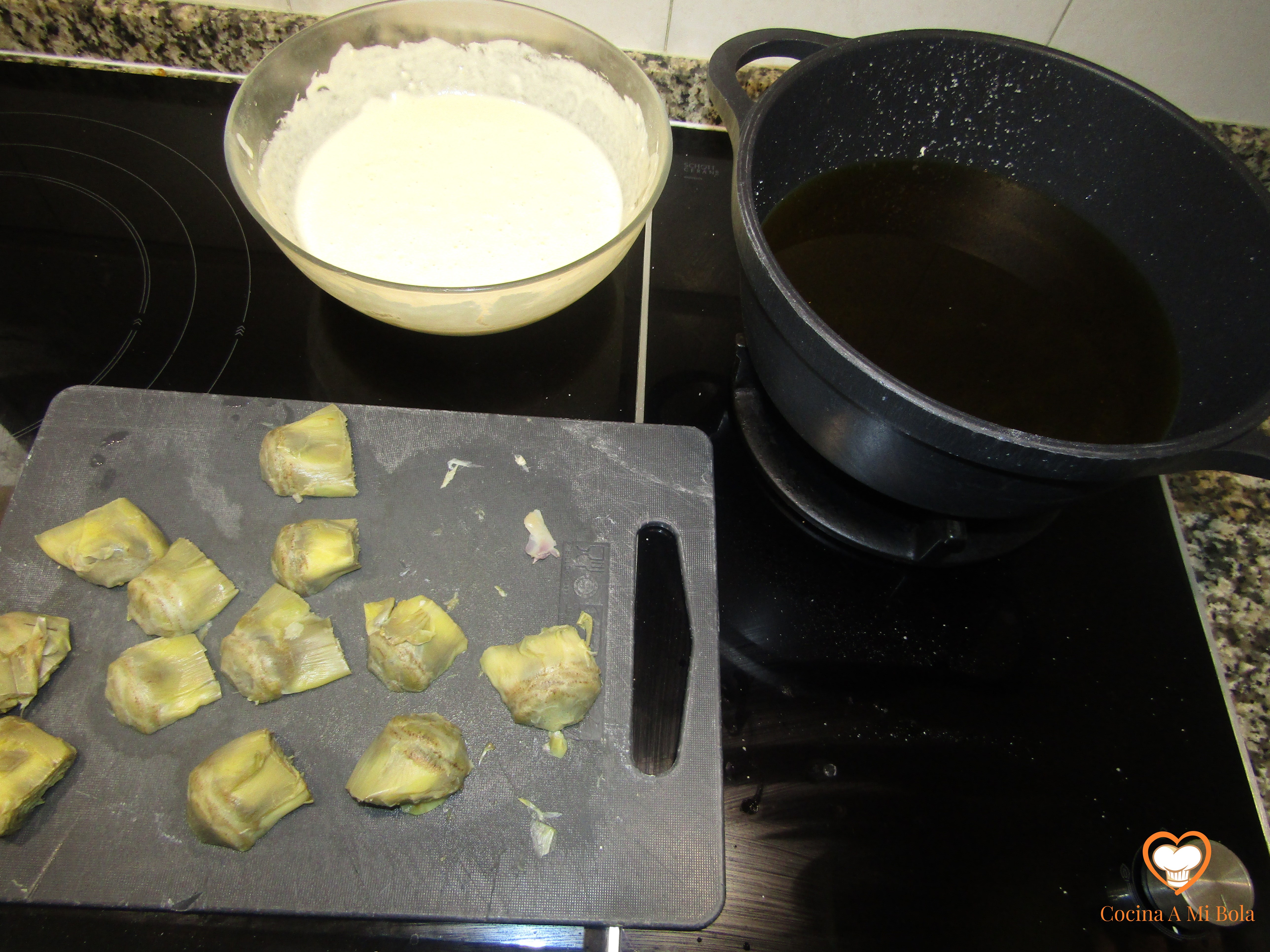 INGREDIENTES: 2 alcachofas por persona, zumo de un limón, harina de tempura, sal, pimienta negra molida, agua muy fría y aceite de oliva.