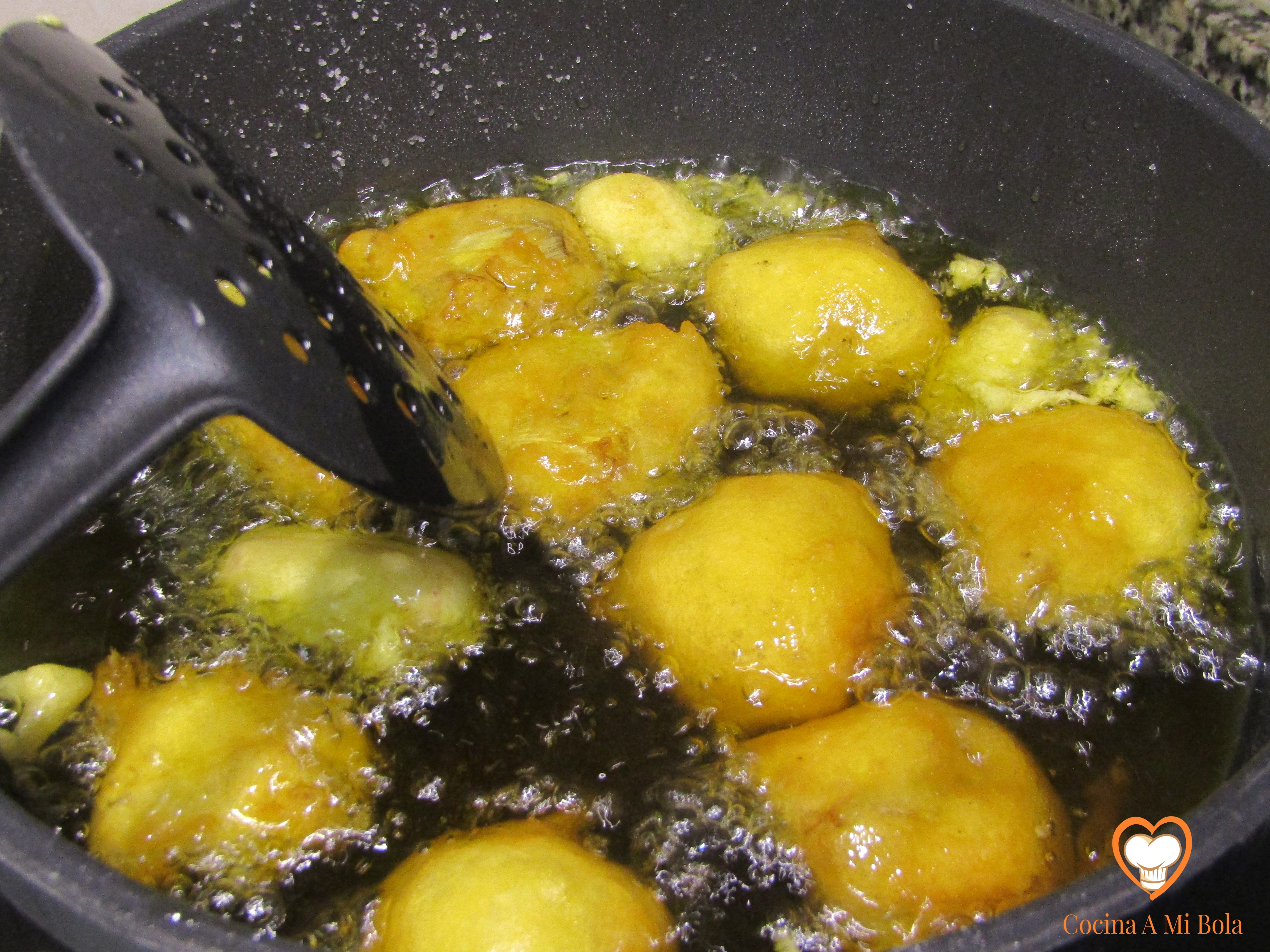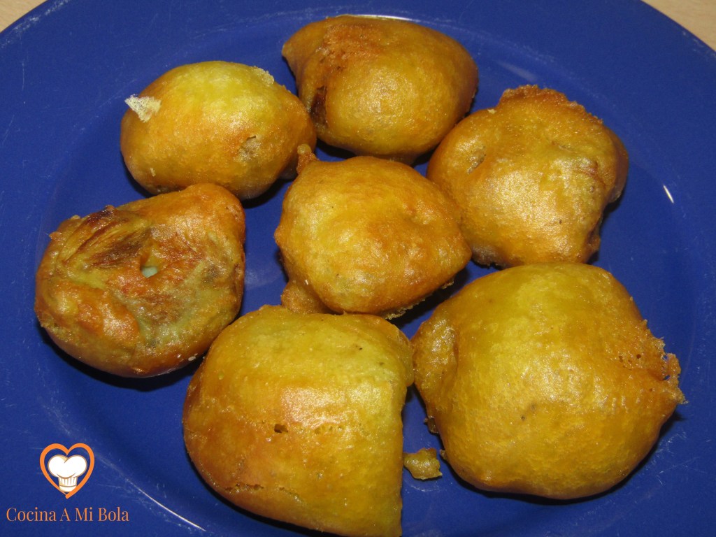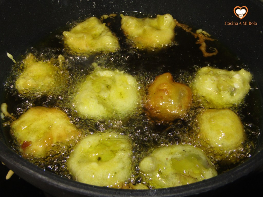 OCTAVO.- Y ahora echa las medias alcachofas en la tempura y tómalas con un tenedor (recogidas, no pinchadas.) Y si no, con una cuchara procurando escurrir el sobrante de masa.  Y a la sartén de una en una y sin poner demasiadas para que no se venga abajo la temperatura del aceite. Cuando se doren por un lado, las vas dando la vuelta sin preocuparte demasiado ya que ya están cocinadas, así que es cuestión de que queden crujientes y no grasientas.