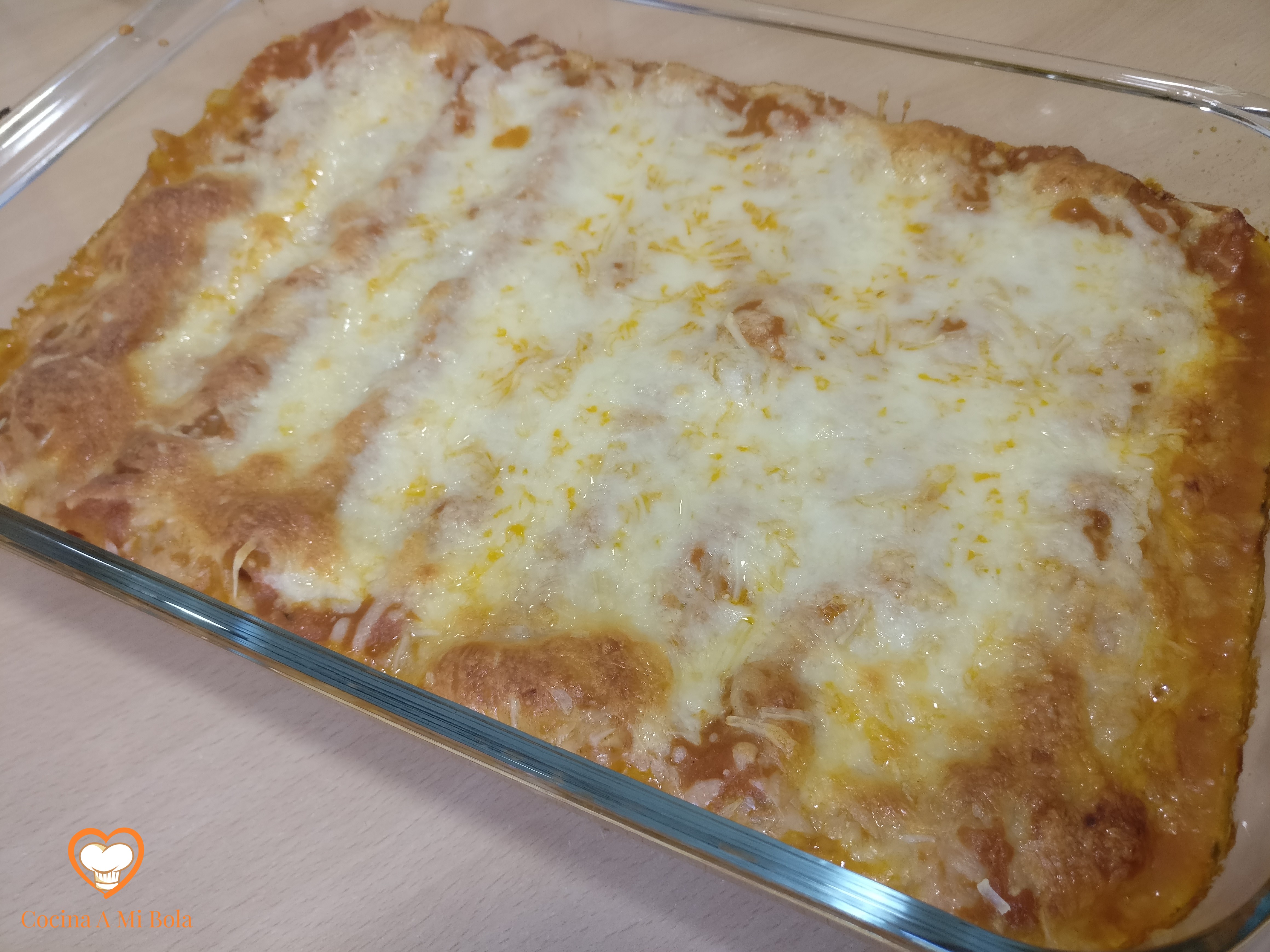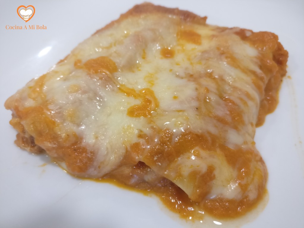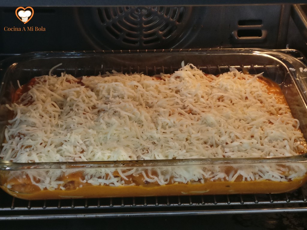 OCTAVO.- Hornea durante unos 25 a 30 minutos. Como sabes, el relleno del canelón y la salsa están más que cocinados. Este tiempo de horno es el que marca el fabricante para que la pasta se hidrate.