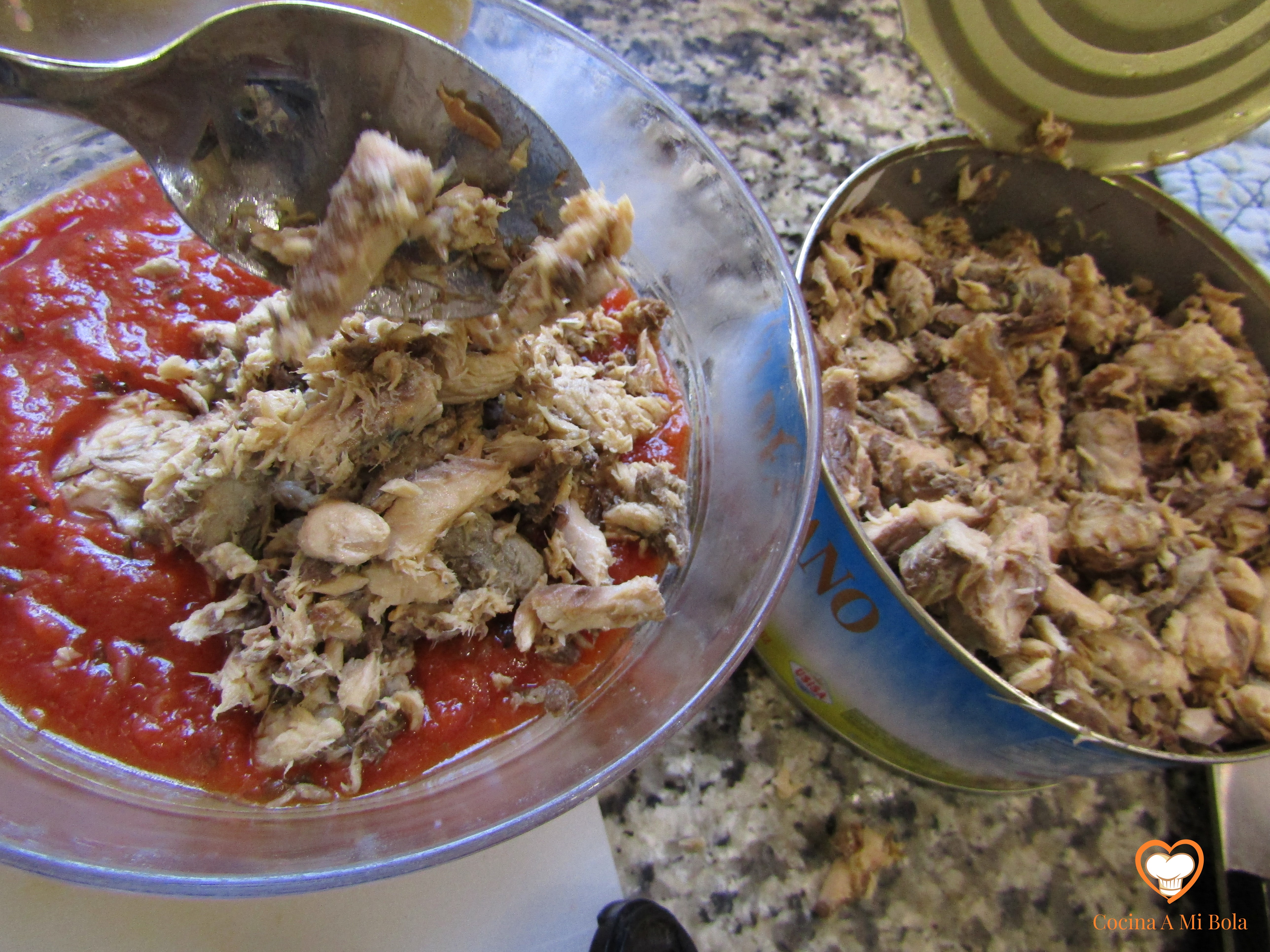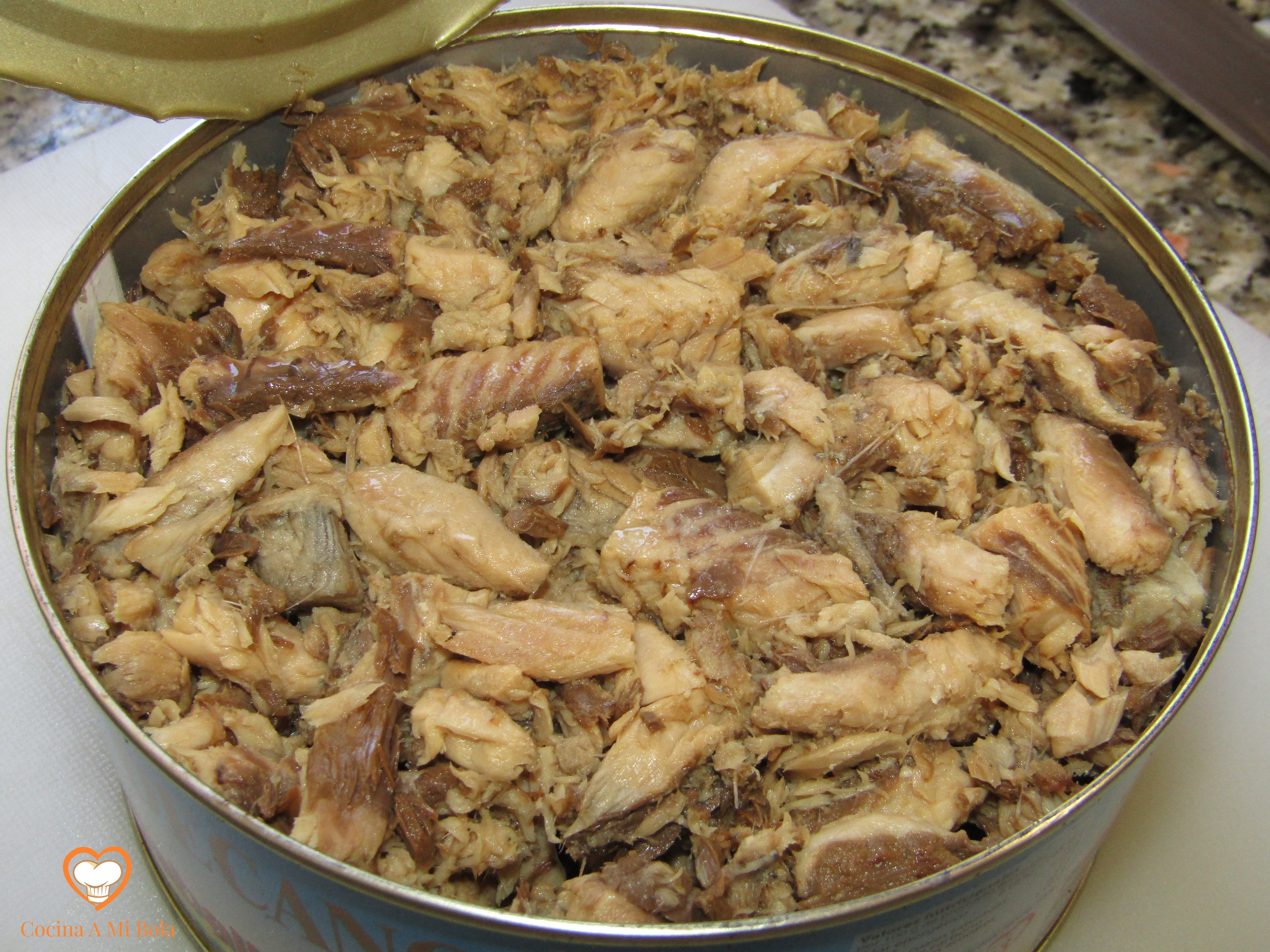 PREVIO.- Para elaborar este plato, yo compro una lata redonda de caballa en aceite en trozos de unos 800 gramos de peso total. Está muy bien de precio y es de muy buena calidad. Pero si no la encuentras, usa cualquier lata de caballa en aceite y sólo tendrás que trocear un poco los lomos. Otra opción muy asequible son las sardinas, que darán un sabor muy similar. En todo caso, abre ahora la lata y ponla sobre un recipiente para que escurra bien el aceite o separa 300 gr y ponlos a escurrir en un colador.