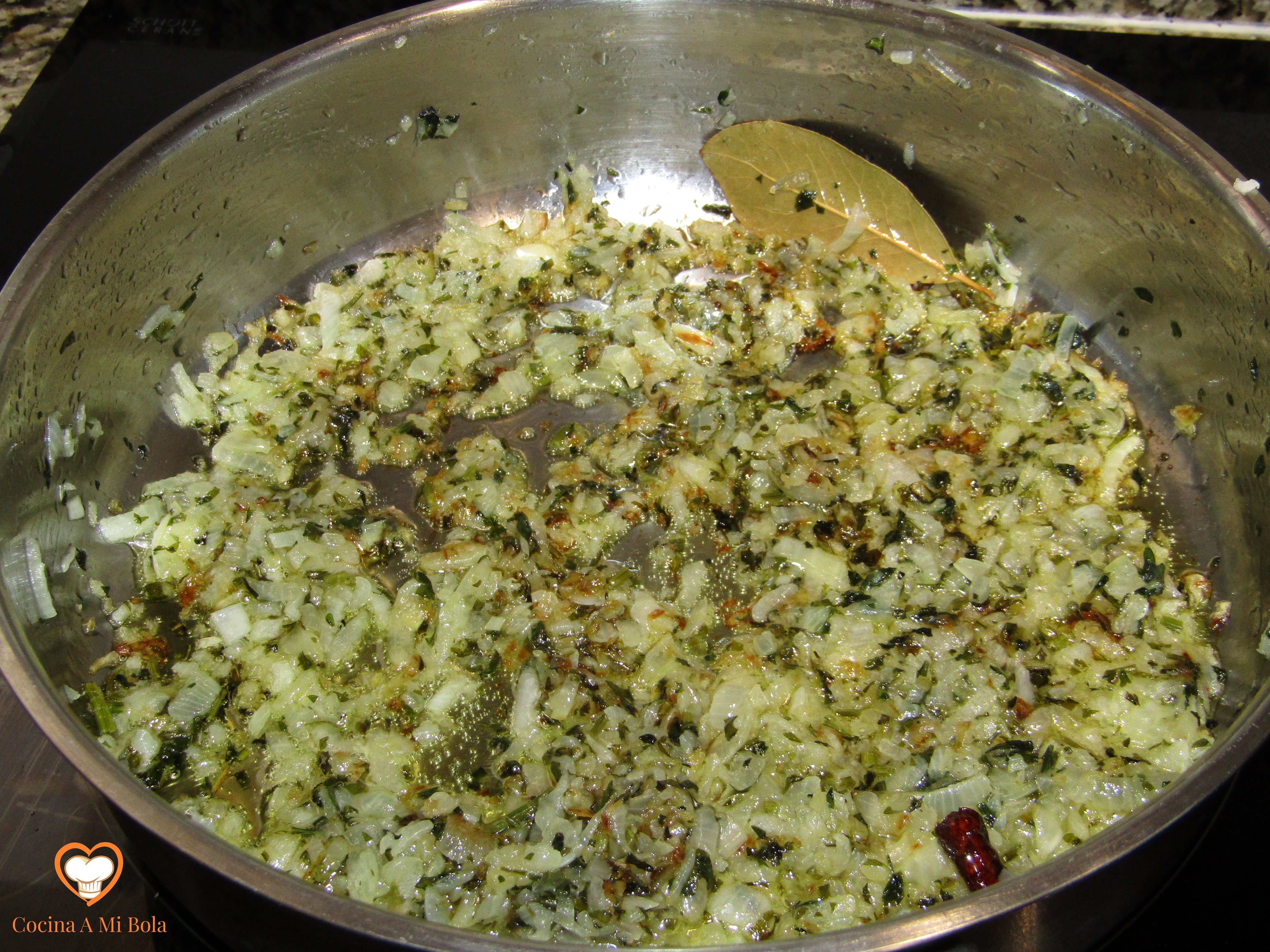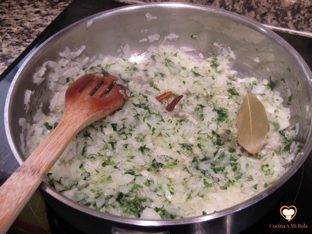 PRIMERO.- Ahora, vamos a picar la cebolla y los ajos muy finos y ponerlo todo a pochar en una sartén honda con aceite de oliva, una hoja de laurel y dos cayenas. Temperatura suave. Al cabo de un par de minutos, echar una cucharada sopera de perejil fresco picado. Remover con frecuencia para que no se queme.