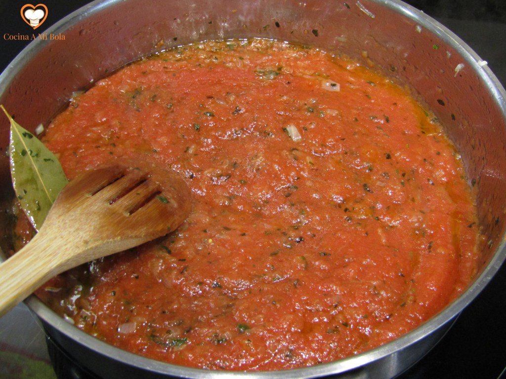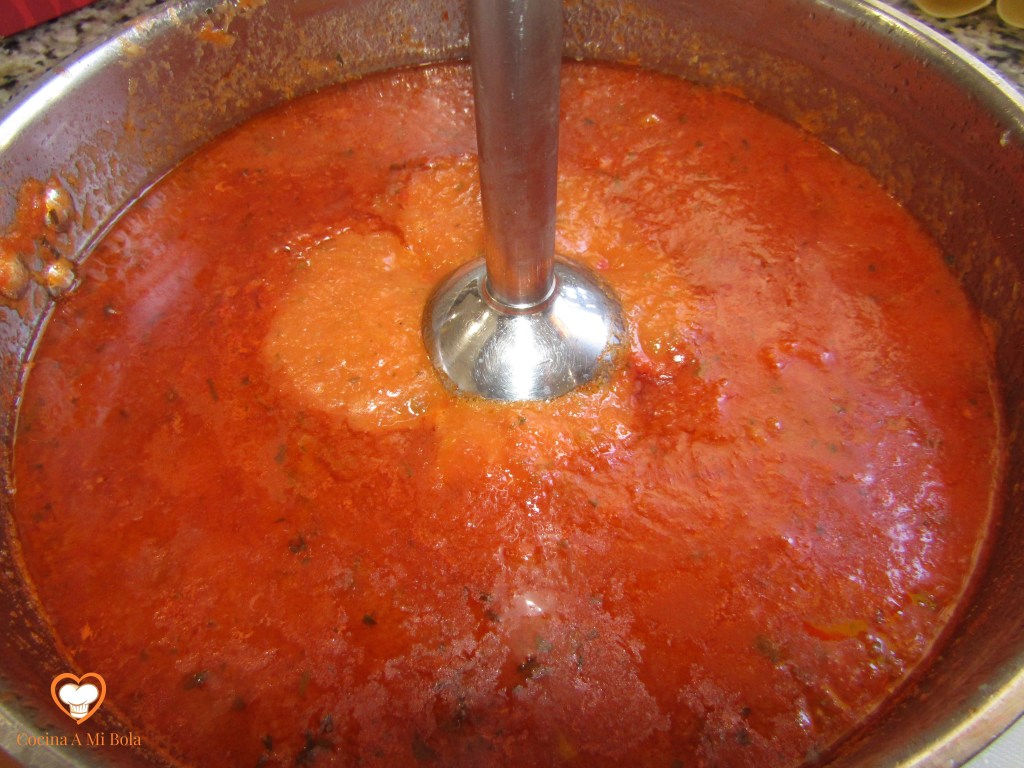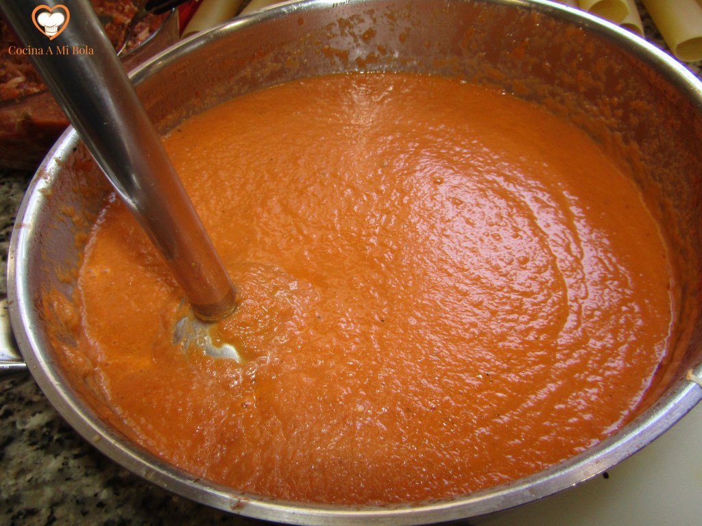 SEXTO.- Rescata el laurel, retira la sartén del fuego y bate bien su contenido con la batidora de mano o en el robot. Y ya tenemos la salsa con la que naparemos los canelones. Debería tener el espesor adecuado para ello, pero si te ha quedado muy líquida, espésala un poco con un Roux directamente y en caliente o con un poco de Maizena (echas media cucharadita en un vasito con agua fría, lo remueves bien hasta que se haya disuelto y lo incorporas a la salsa dejándolo hervir un minutillo).
