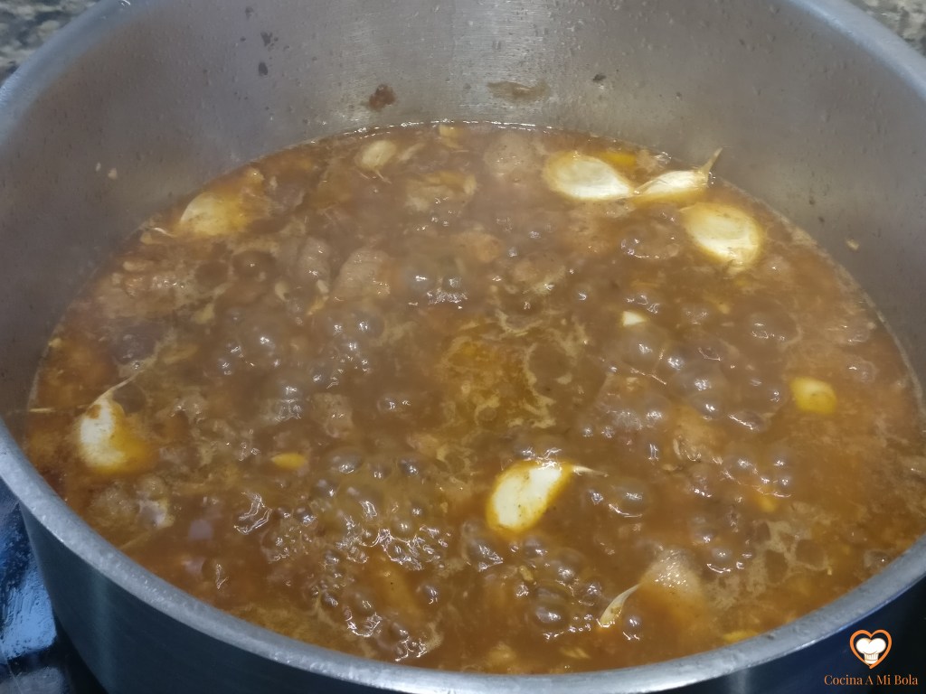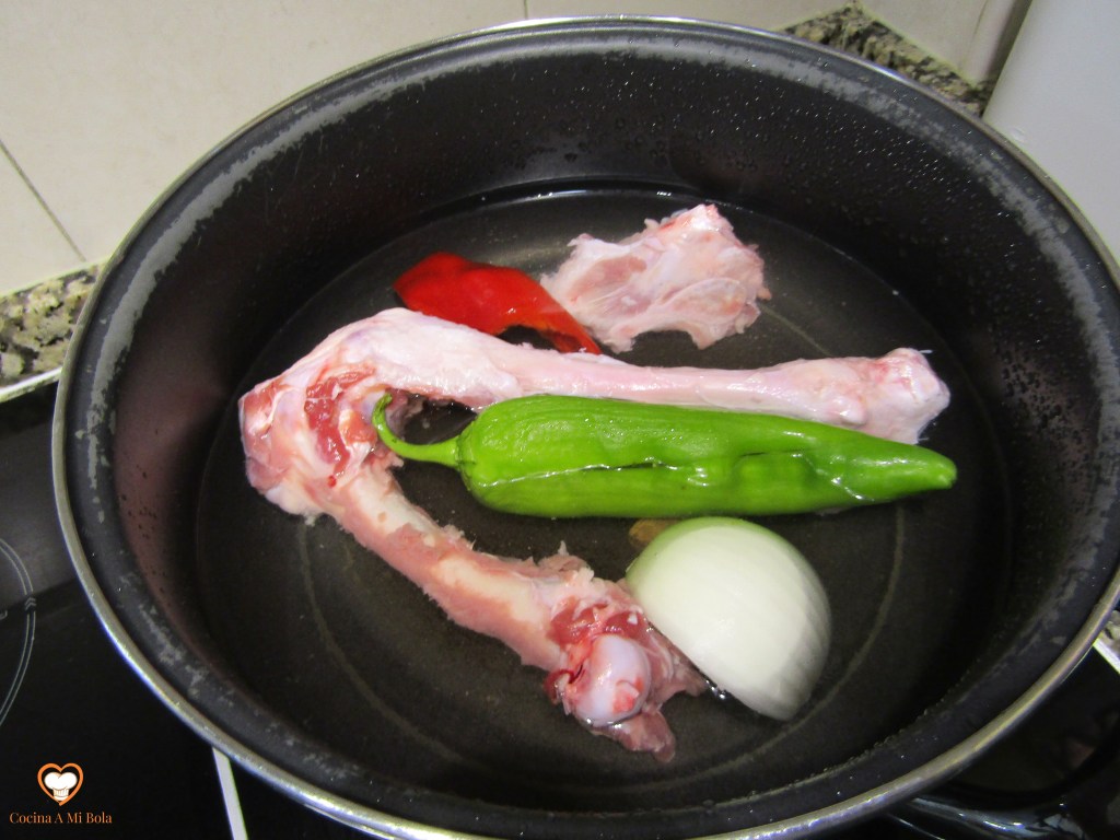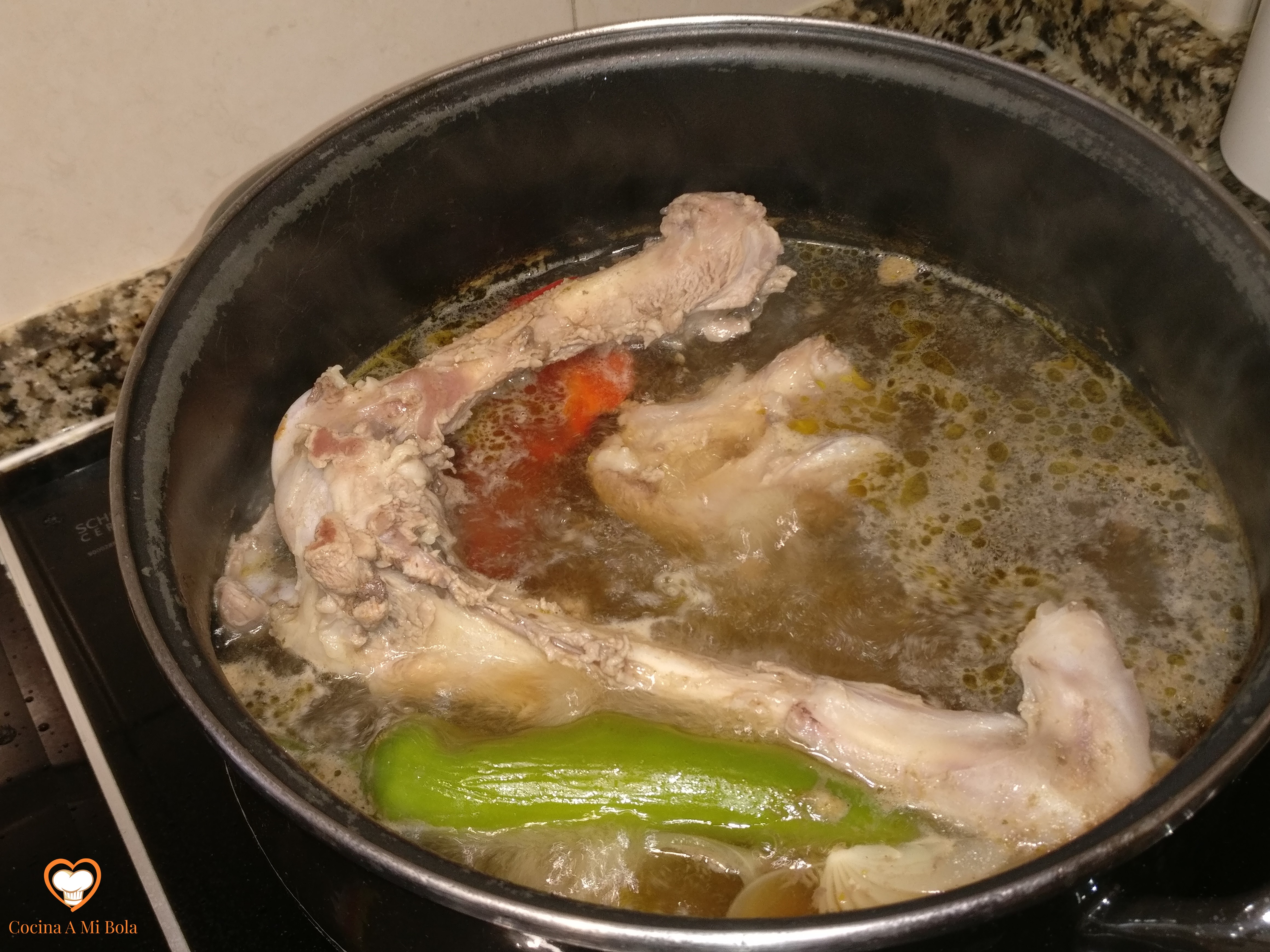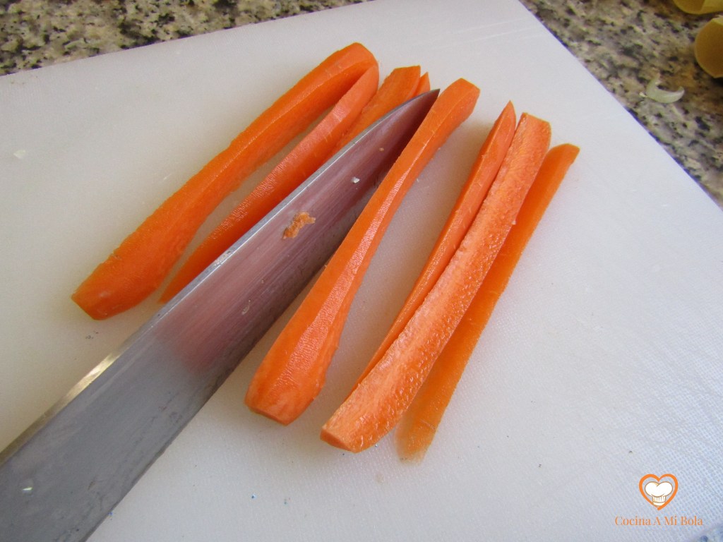 TERCERO.- Trabajando en paralelo, necesitamos un fumet de pescado así que si guardas en el congelador alguna raspa o cabeza, es el momento de ponerla a hervir unos 20 minutos con una zanahoria. Cuela e incorpora la zanahoria picada. 200 cc de caldo serán suficientes. Si no dispones de tiempo o de pescado, usa un caldo envasado de buena calidad y le añades una zanahoria muy picada y unas tres o cuatro cucharadas del aceite de la lata de caballa y tenlo hirviendo unos minutillos hasta que la zanahoria esté tierna. Reservar.