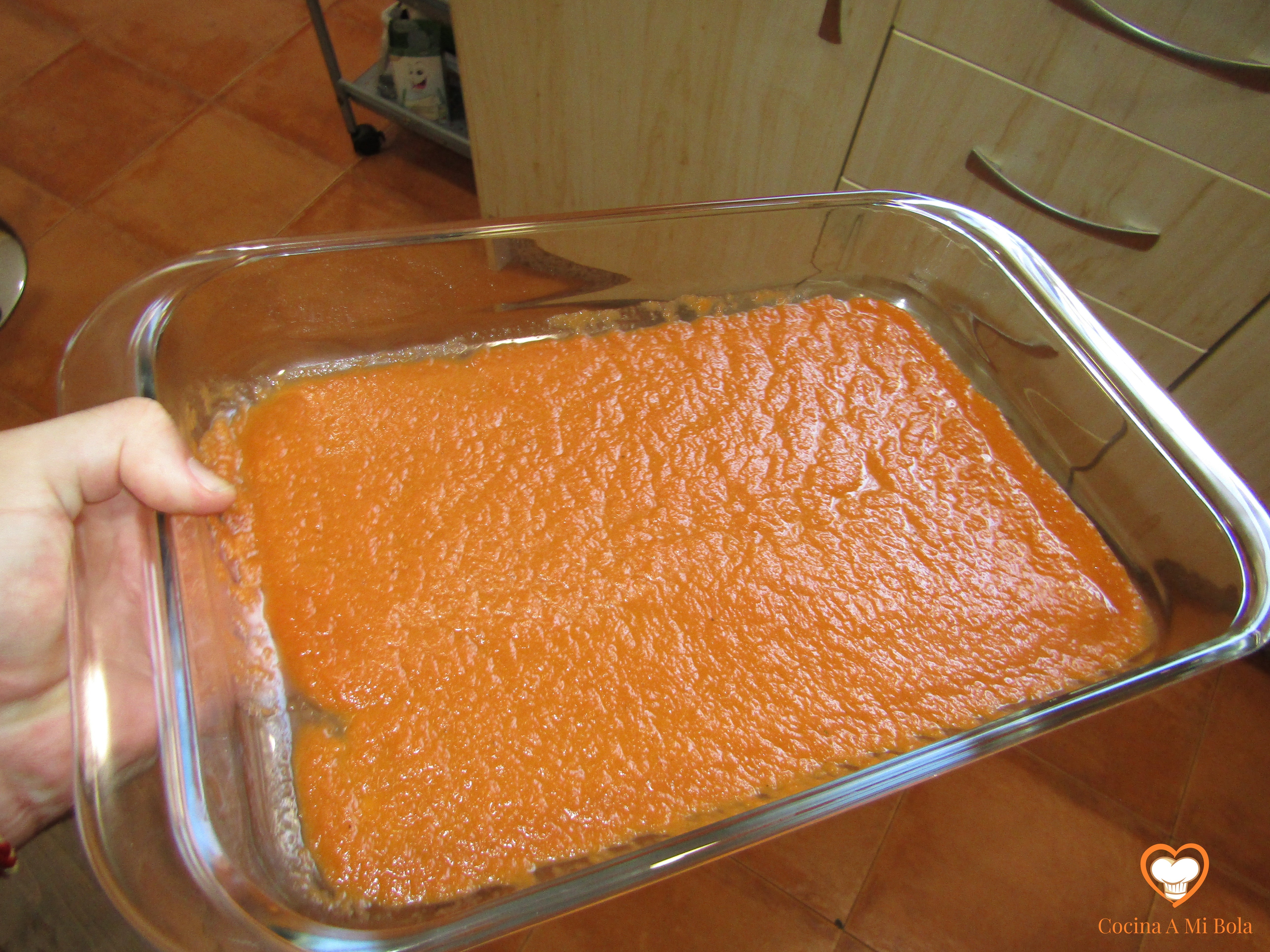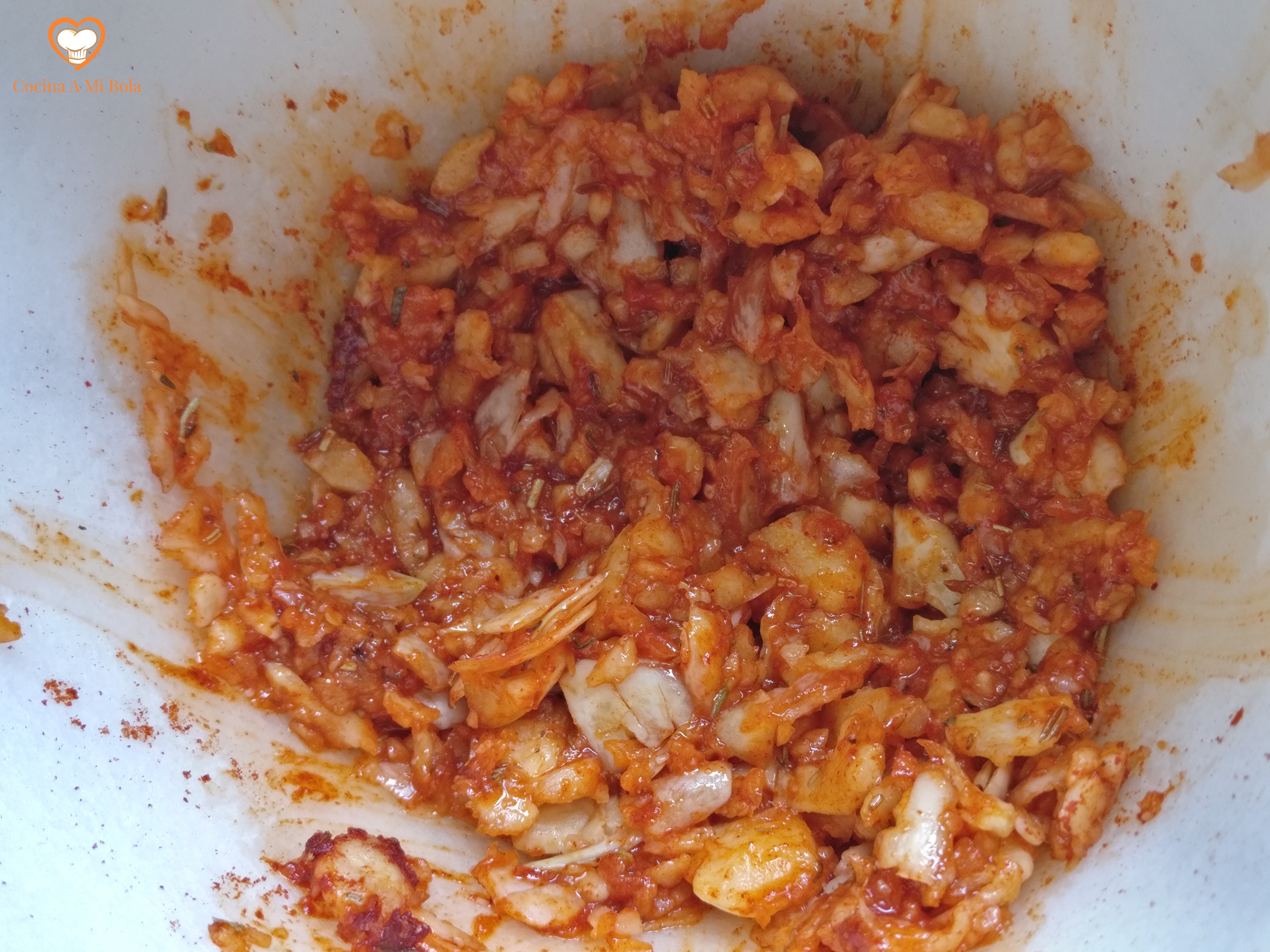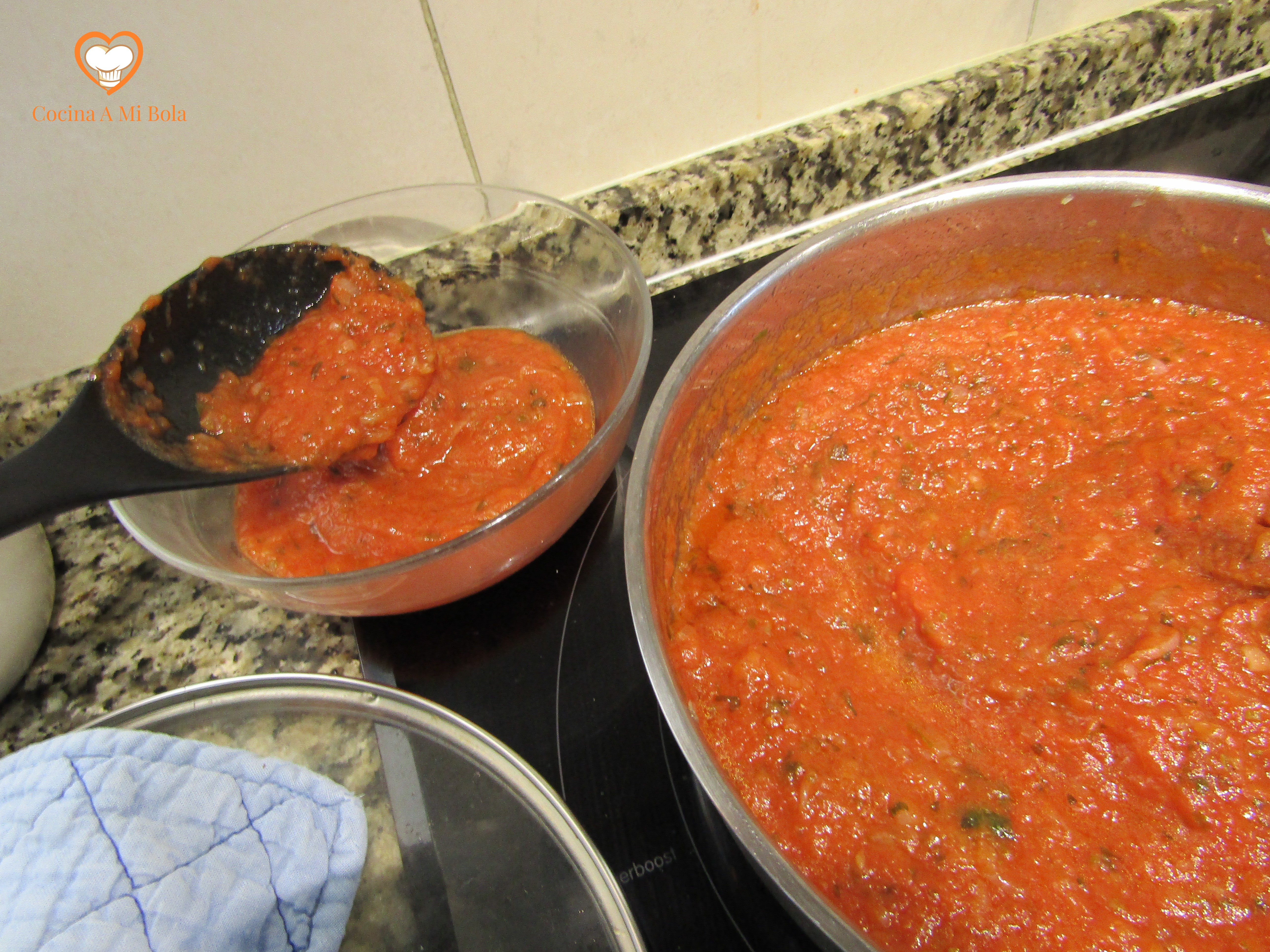 CUARTO.- Cuando el tomate esté blandito y bien pochado o cuando veas que el triturado está guisado (pruébalo), separa en un bol un tercio del total. aproximadamente y añade sobre él la caballa. Mezcla bien y deja templar. Si ahora te sobra un ratillo, devuelve el aceite escurrido a la caballa sobrante y guárdalo en la nevera para otros usos. Queríamos eliminarlo sólo de la caballa del guiso.