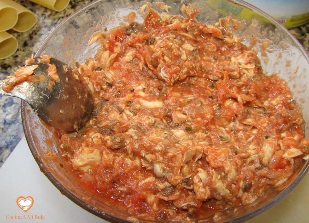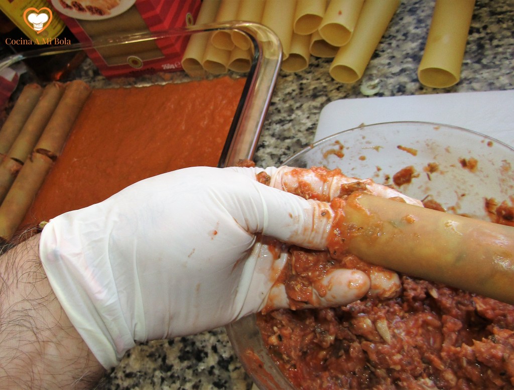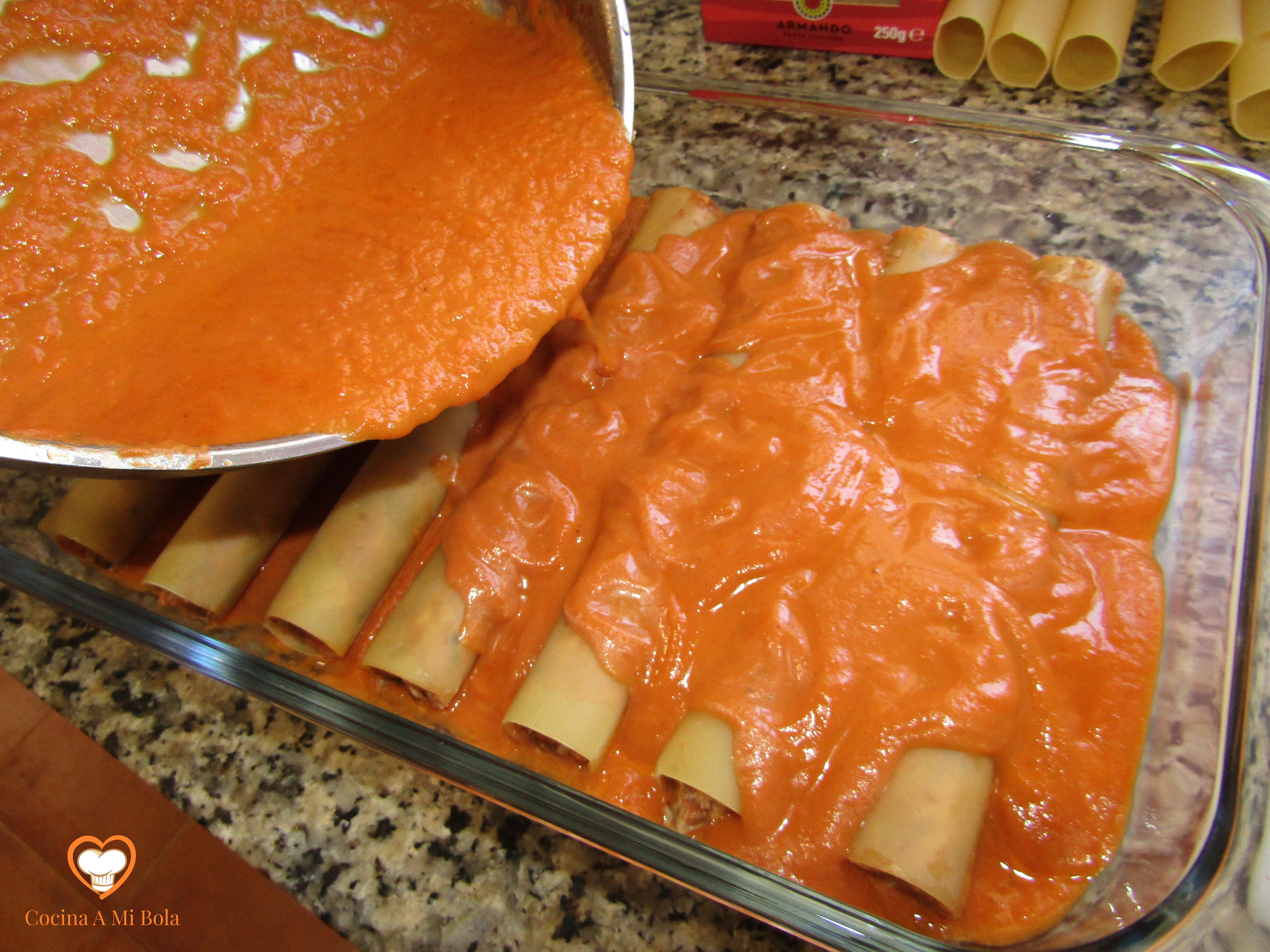 SÉPTIMO.- Estos canelones precocidos tienen la enorme ventaja de que ya vienen en forma de tubo, con lo que los rellenaremos enseguida. Pon una pequeña capa de salsa sobre la base de una fuente para horno. Rellena los canelones con la mezcla de guiso de tomate y caballa, colócalos ordenadamente sobre la fuente y cúbrelos con el resto de la salsa. Enciende el horno a 170ºC y, mientras se calienta, echa por encima la mozzarella rallada.