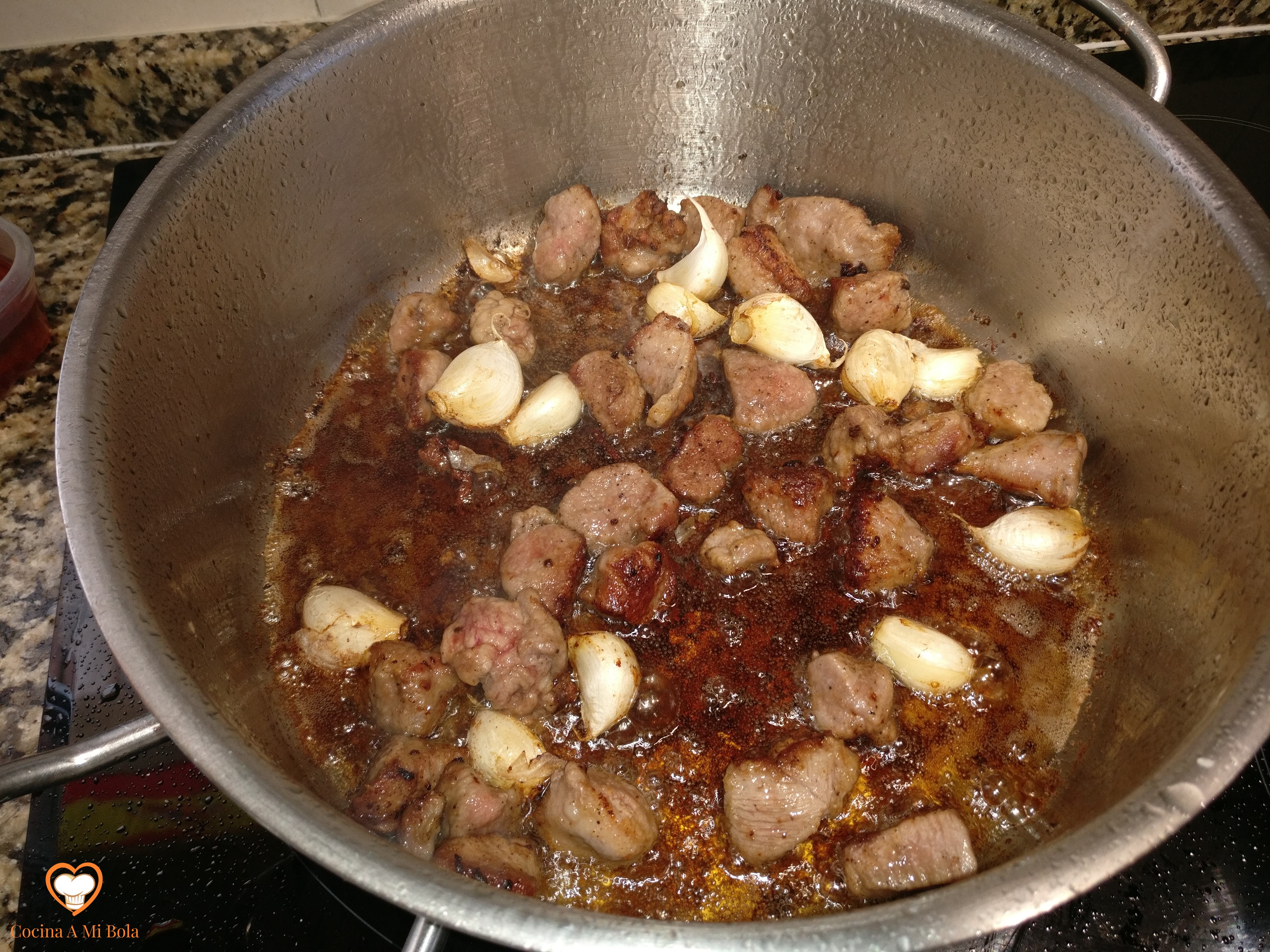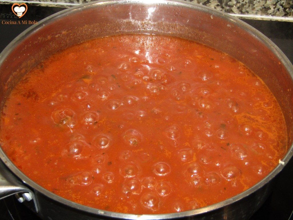Si no tuvieras tomates maduros o anduvieras corto de tiempo, puedes echar una lata de tomate natural triturado. Salpimentar ligeramente, remover y tapar, porque el tomate hierve con burbujas muy gruesas que al reventar, salpica bastante y puedes quemarte. Remueve de vez en cuando.