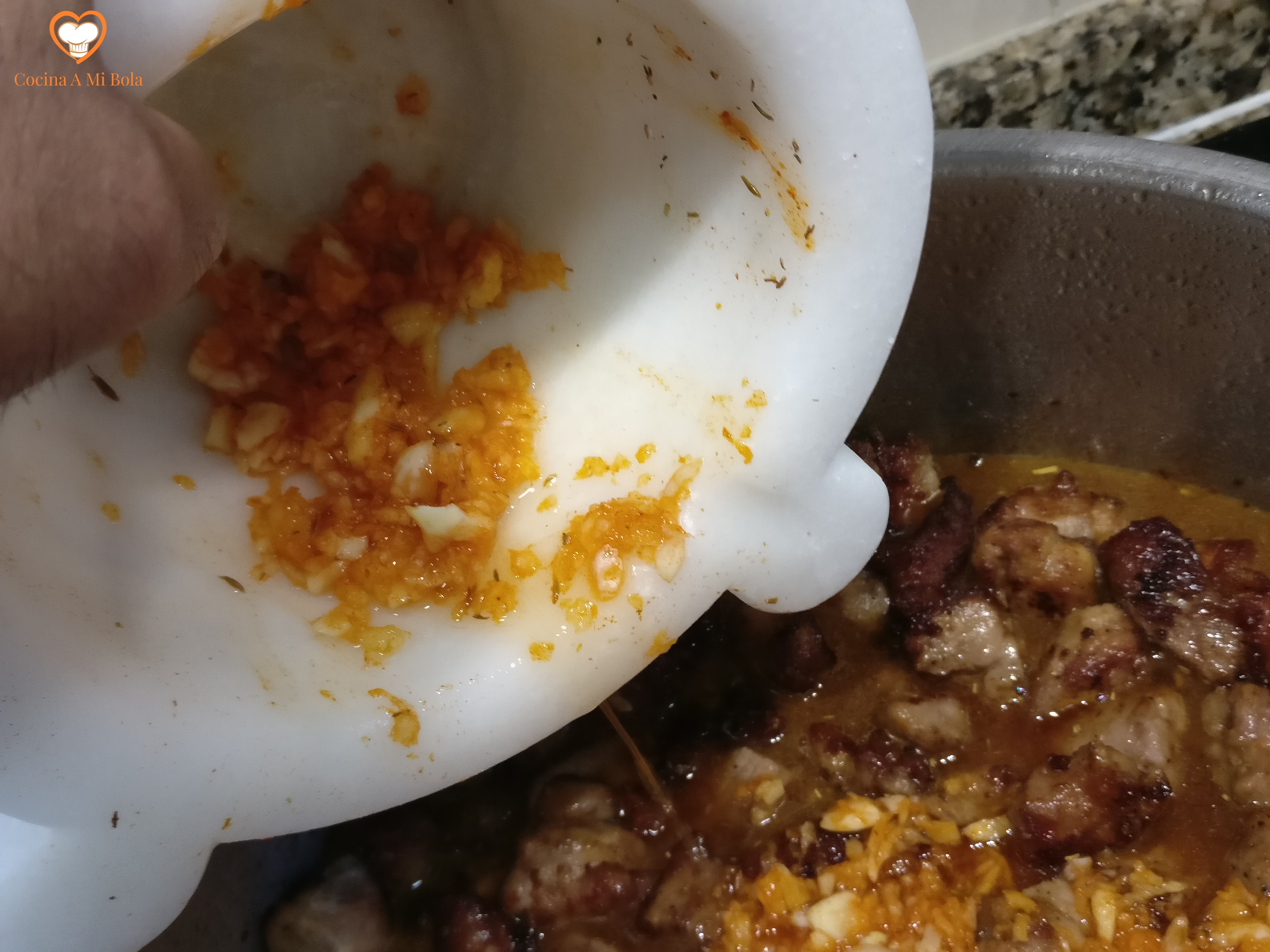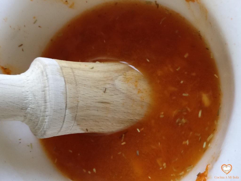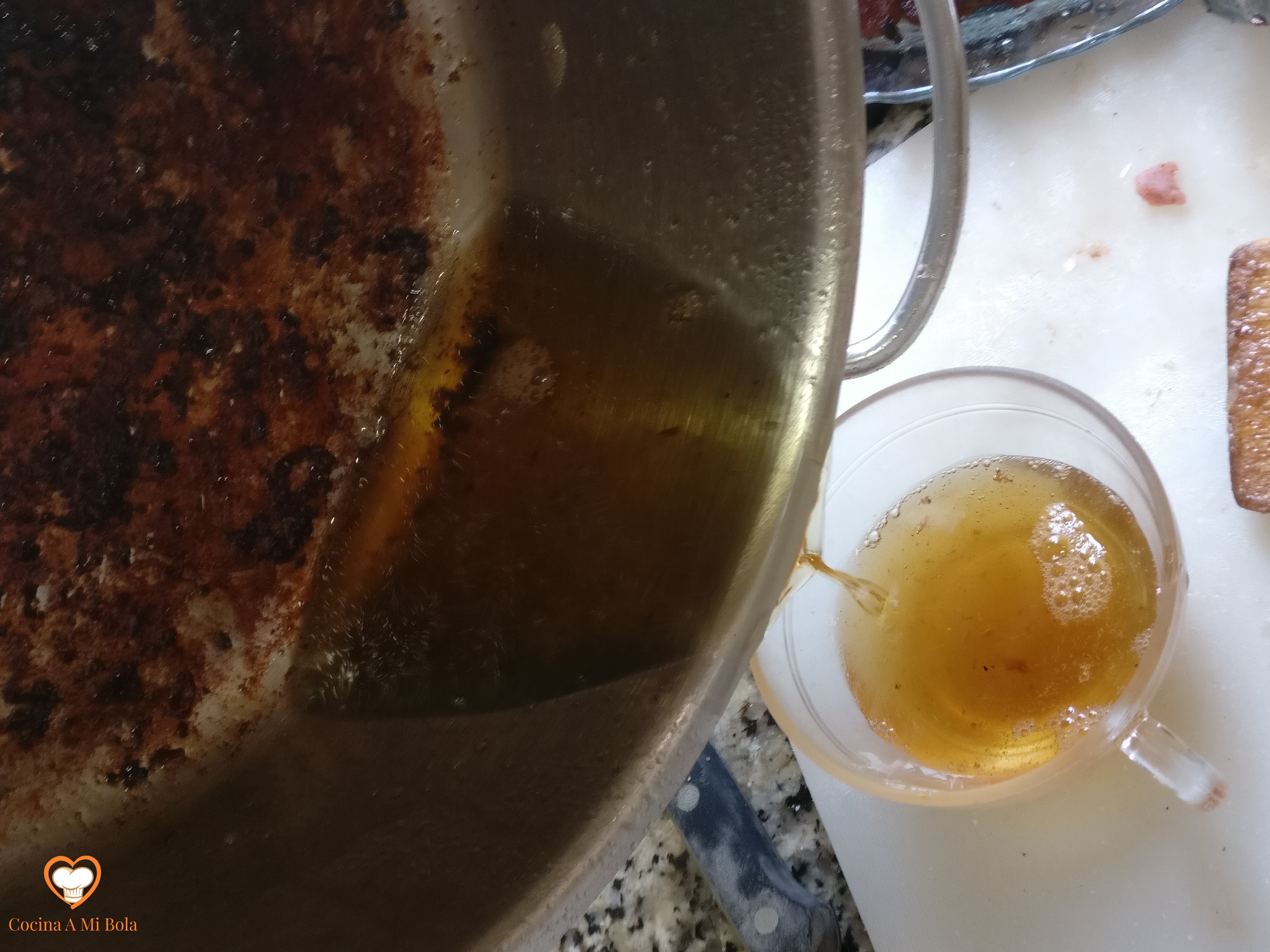 QUINTO.- Echamos ahora el brandy al tomate de la sartén principal y rehogamos durante unos tres minutos hasta que evapore el alcohol, para -a continuación- incorporar el caldo de pescado y zanahoria. Déjalo rehogar otro par de minutos.