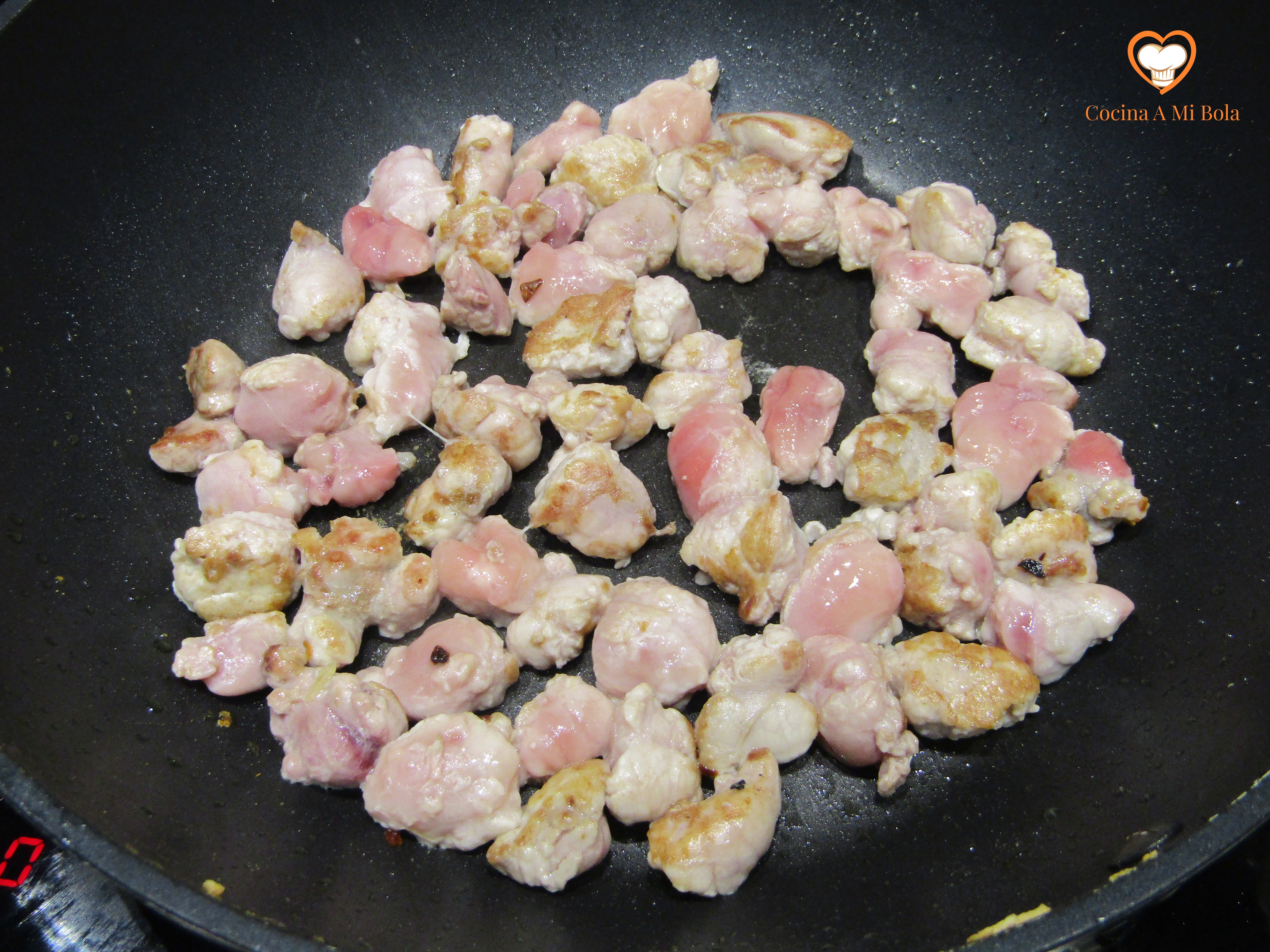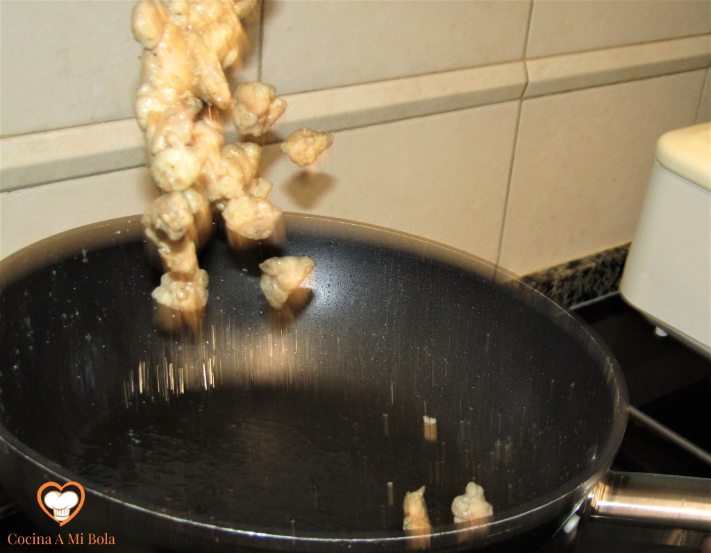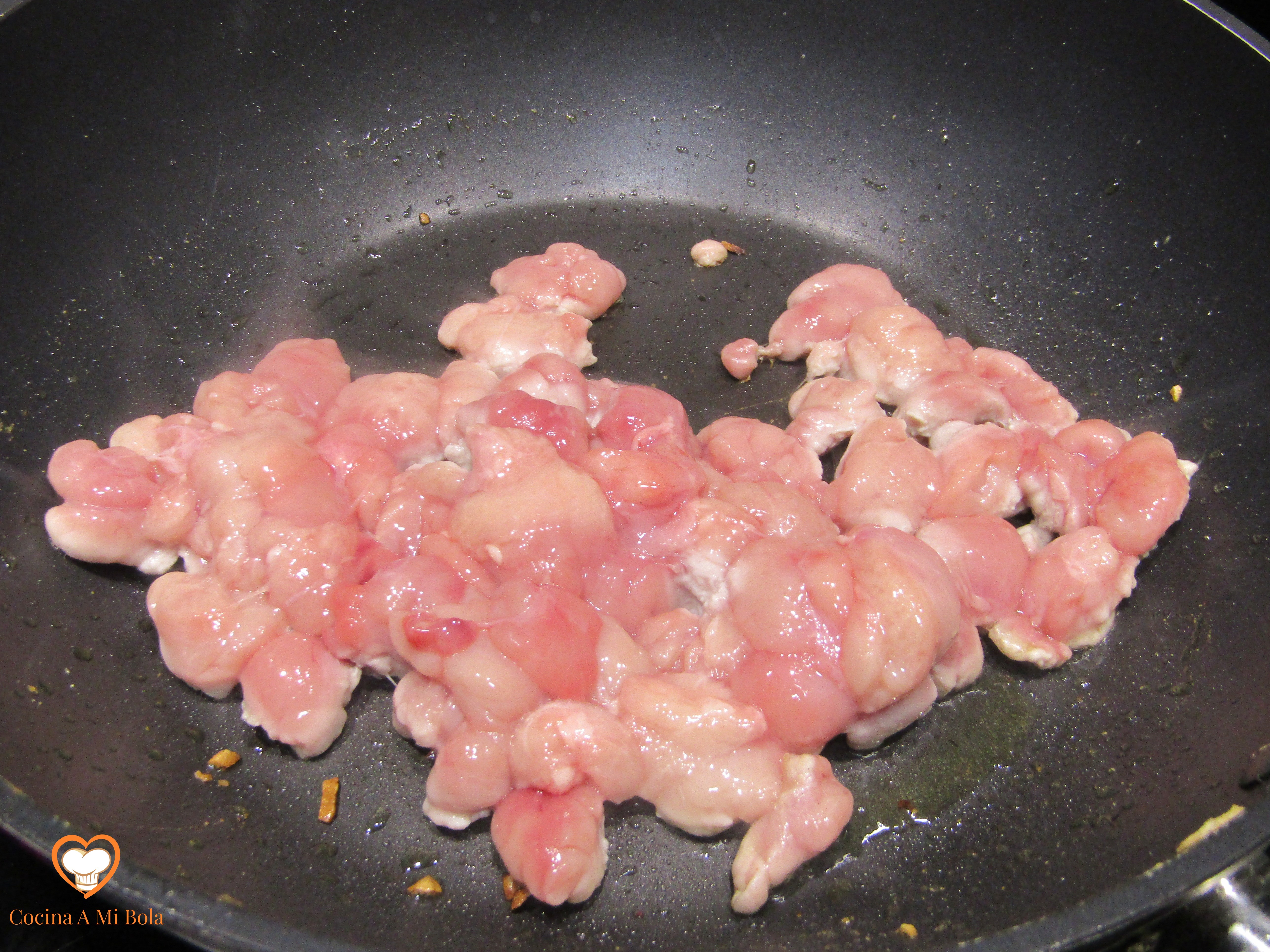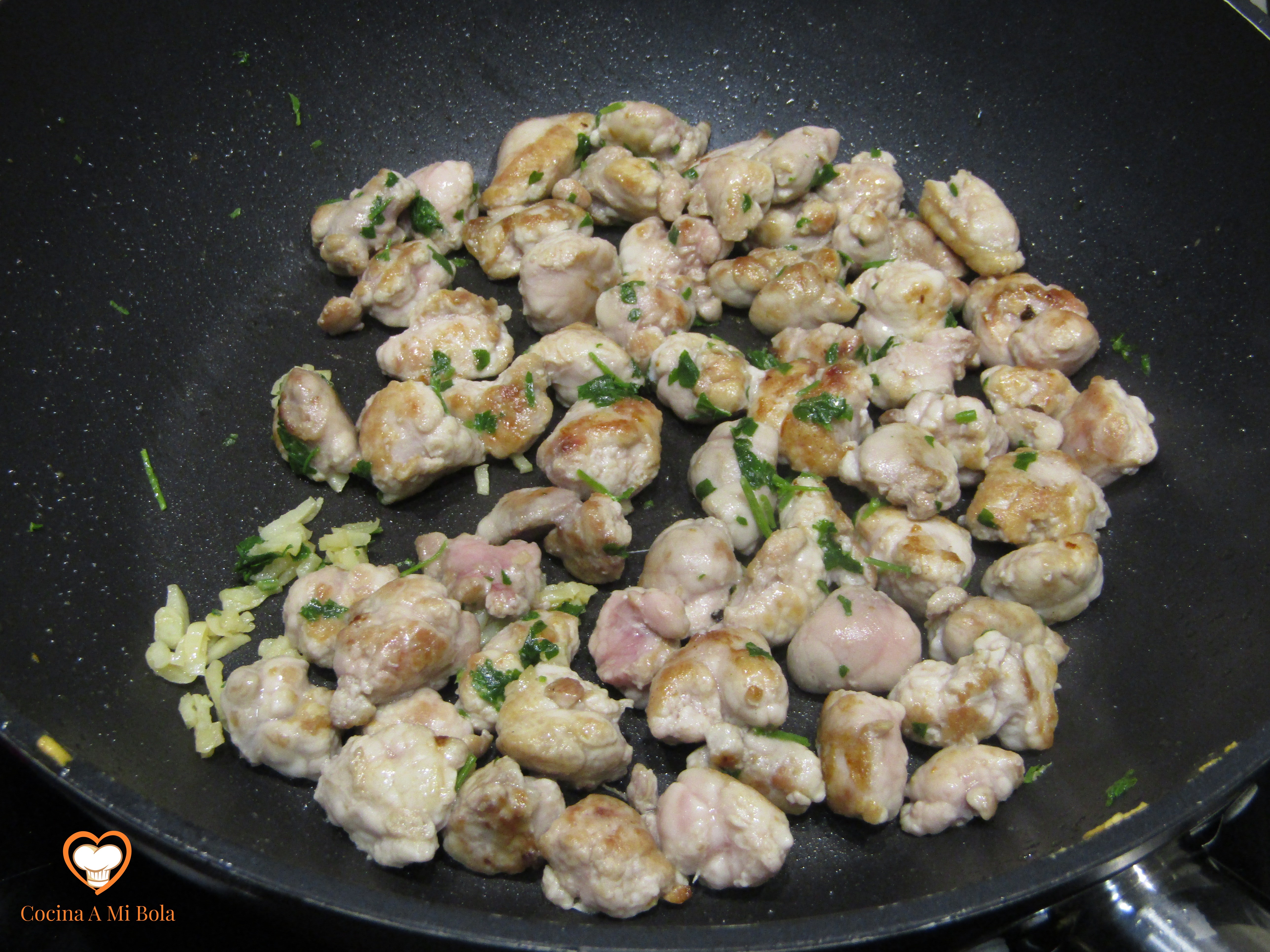 QUINTO.- Vamos ahora con las mollejas. En una sartén pon a calentar aceite de oliva virgen extra. Basta con que cubra el fondo y cuando esté bien caliente, echas las mollejas y saltéalas hasta que se doren. Echa los ajos y el perejil; mezcla bien.