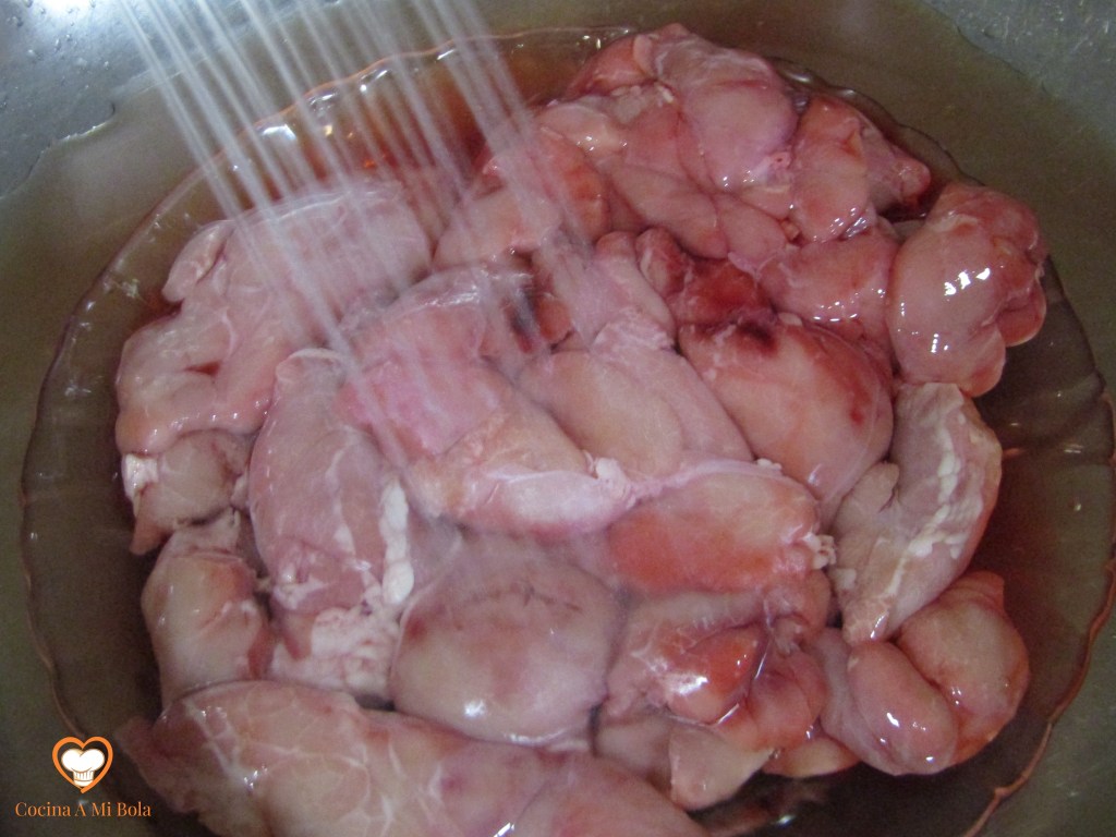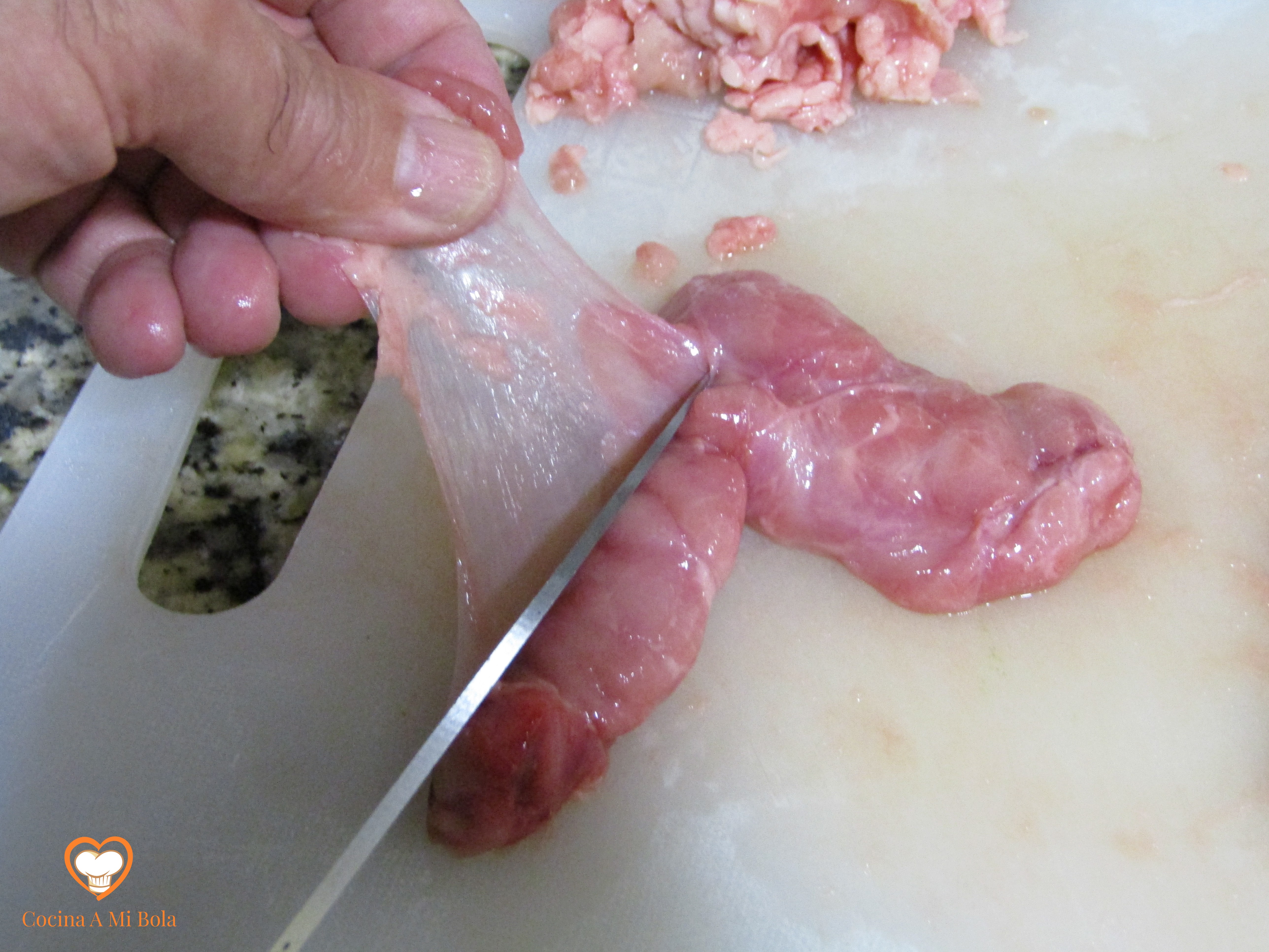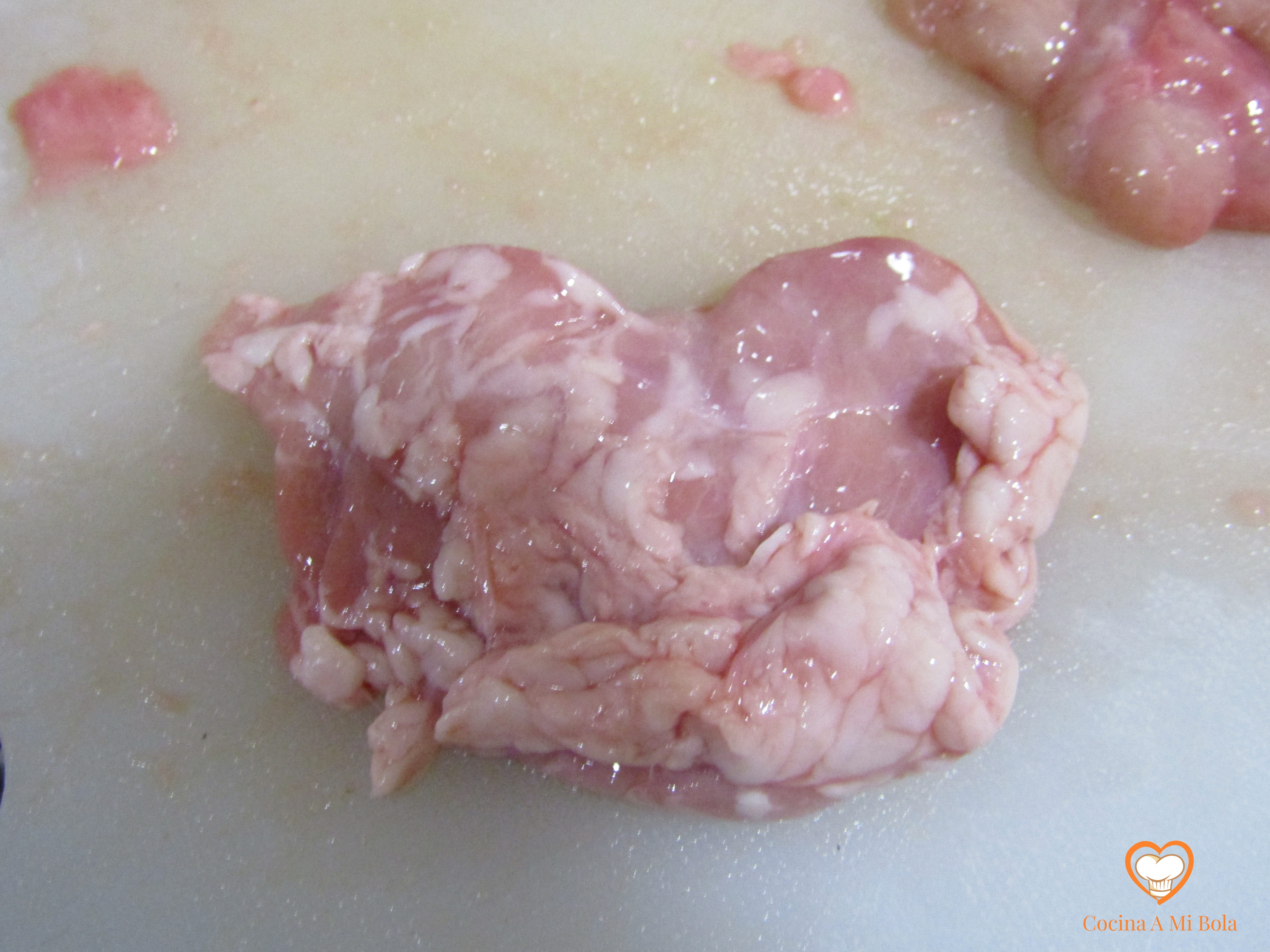 SEGUNDO.- El siguiente paso es algo más molesto, pero es importante para que tengan una textura suave. Hay que quitarles la grasa adherida y una pequeña piel transparente que las envuelve. Para ello utiliza un cuchillo largo y bien afilado. Estira con los dedos de esta telilla fina, posa el cuchillo en la tabla presionando lateralmente hacia la molleja mientras tiras de ella con la otra mano. El filo del cuchillo irá cortándola poco a poco y saldrá casi entera sin necesidad de hacer movimiento de corte o vaivén.
