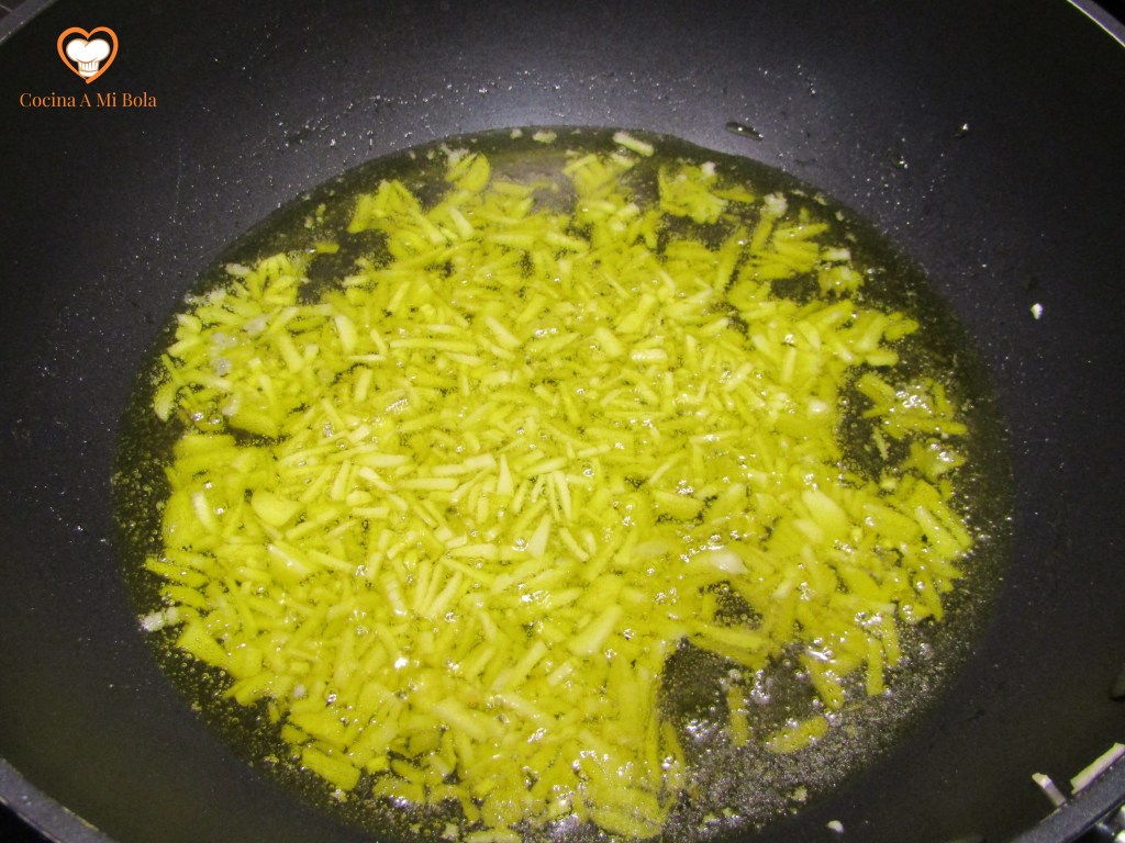 CUARTO.- Pica finos los ajos y ponlos a dorar muy despacito en una sartén con aceite de oliva virgen extra. No pongas mucha potencia ya que deben hacerse despacio y sin arrebatar el aceite pues perdería muchas de sus propiedades y lo que es peor, su sabor característico. Por otra parte, es una gran ocasión para hacer un AOVE al aroma de ajo para utilizar en otras ocasiones, pero como te digo, no debe alcanzar altas temperaturas.