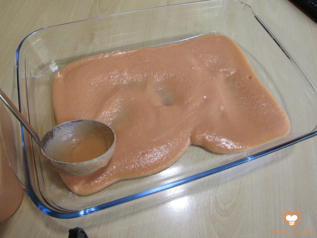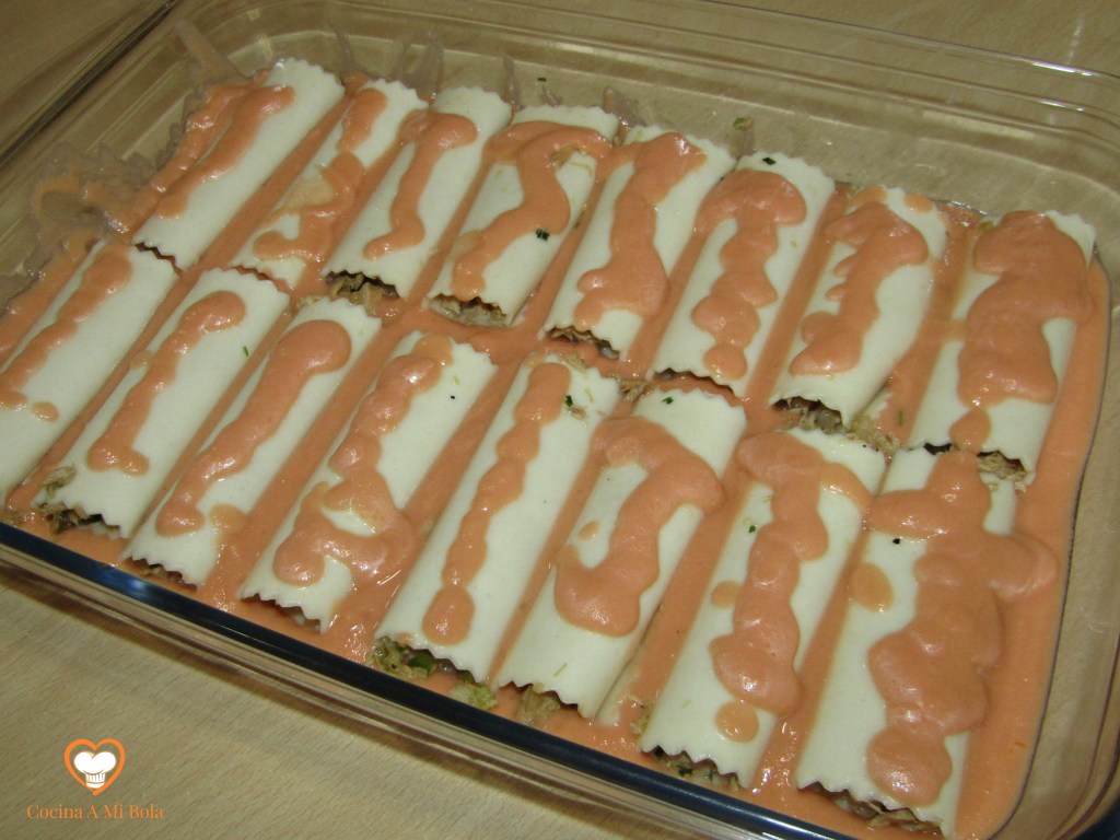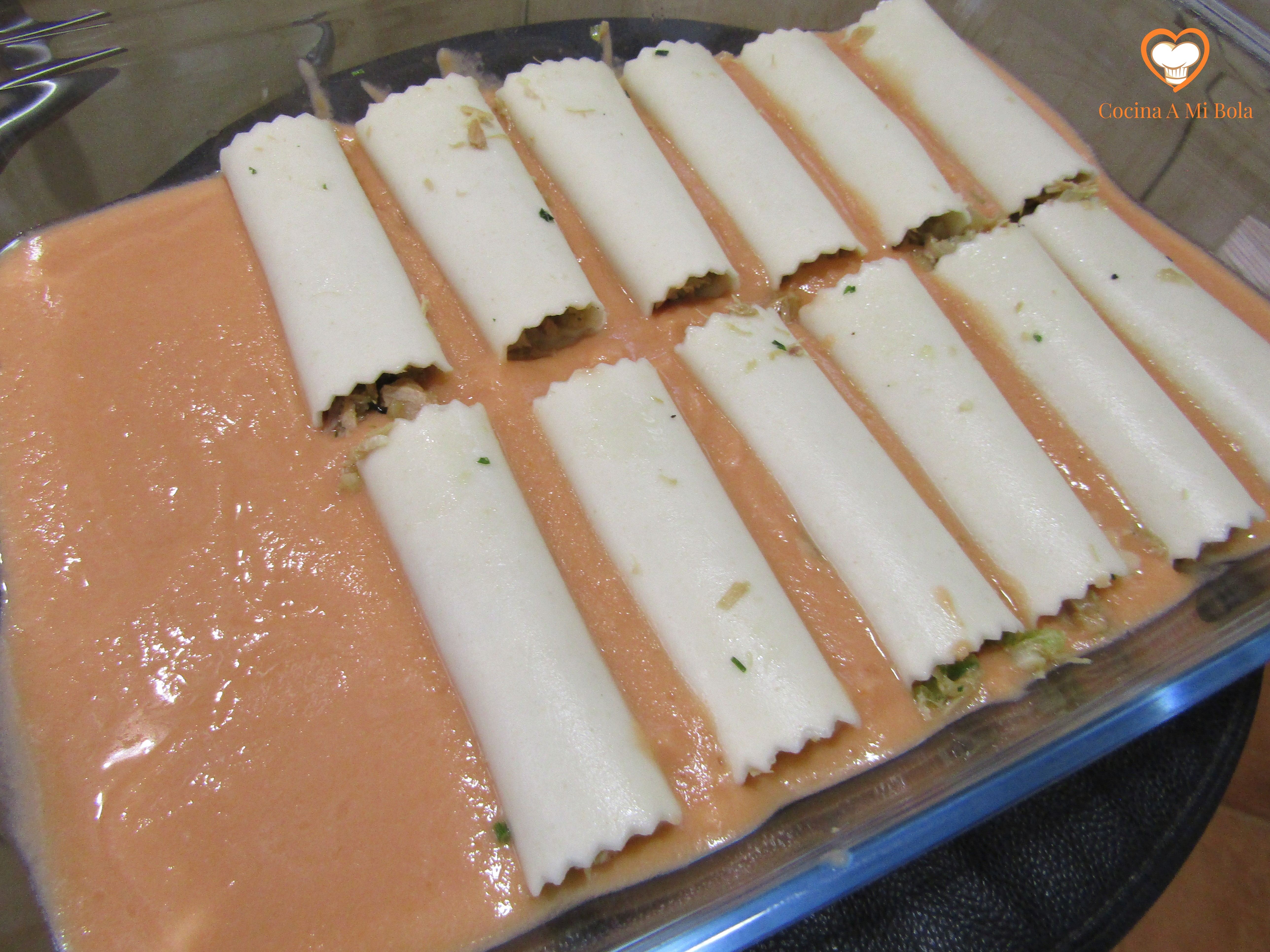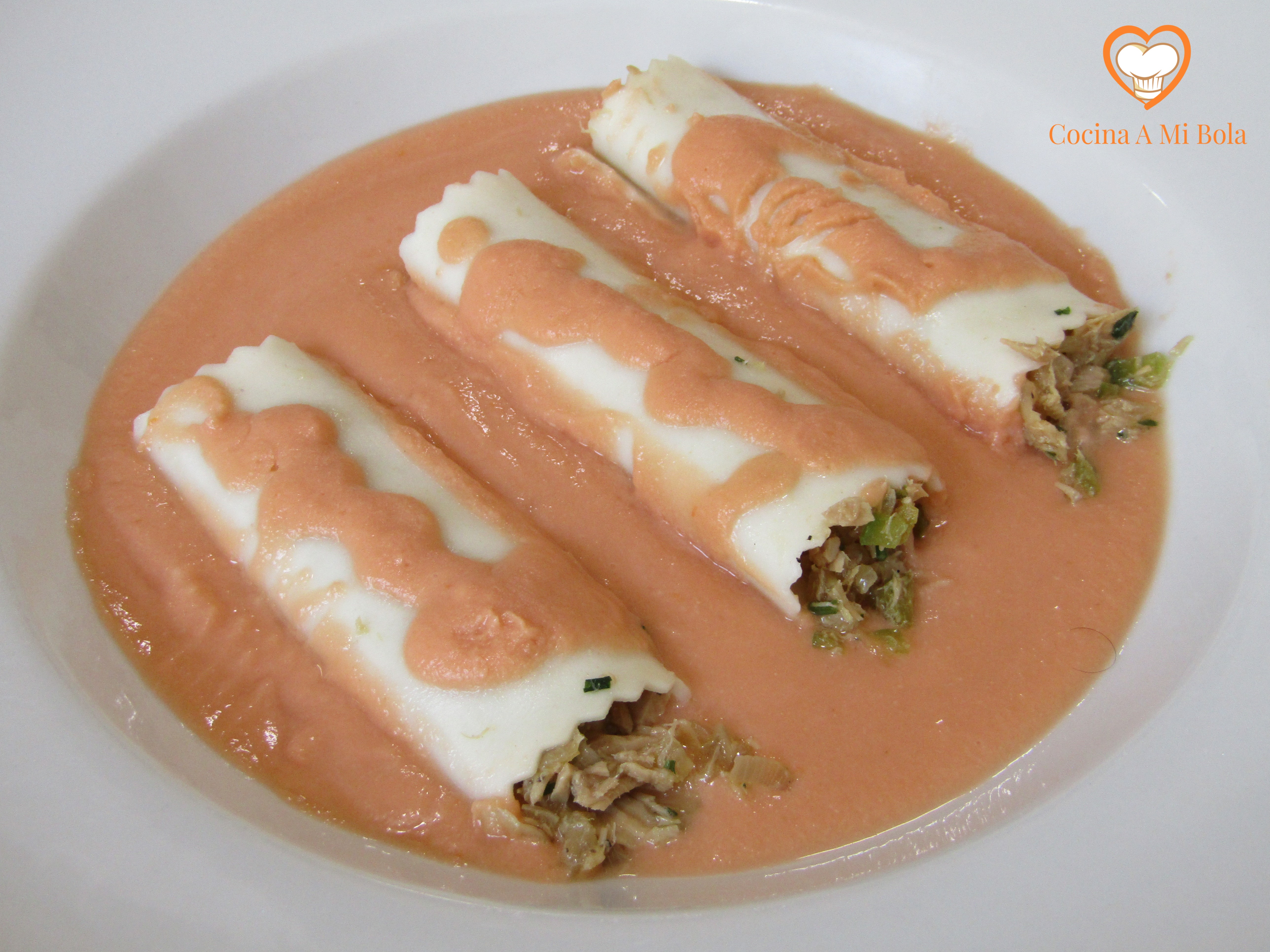 OCTAVO.- Elige una fuente en la que te quepan los canelones dispuestos por toda su superficie y vierte elsalmorejo bien repartido.