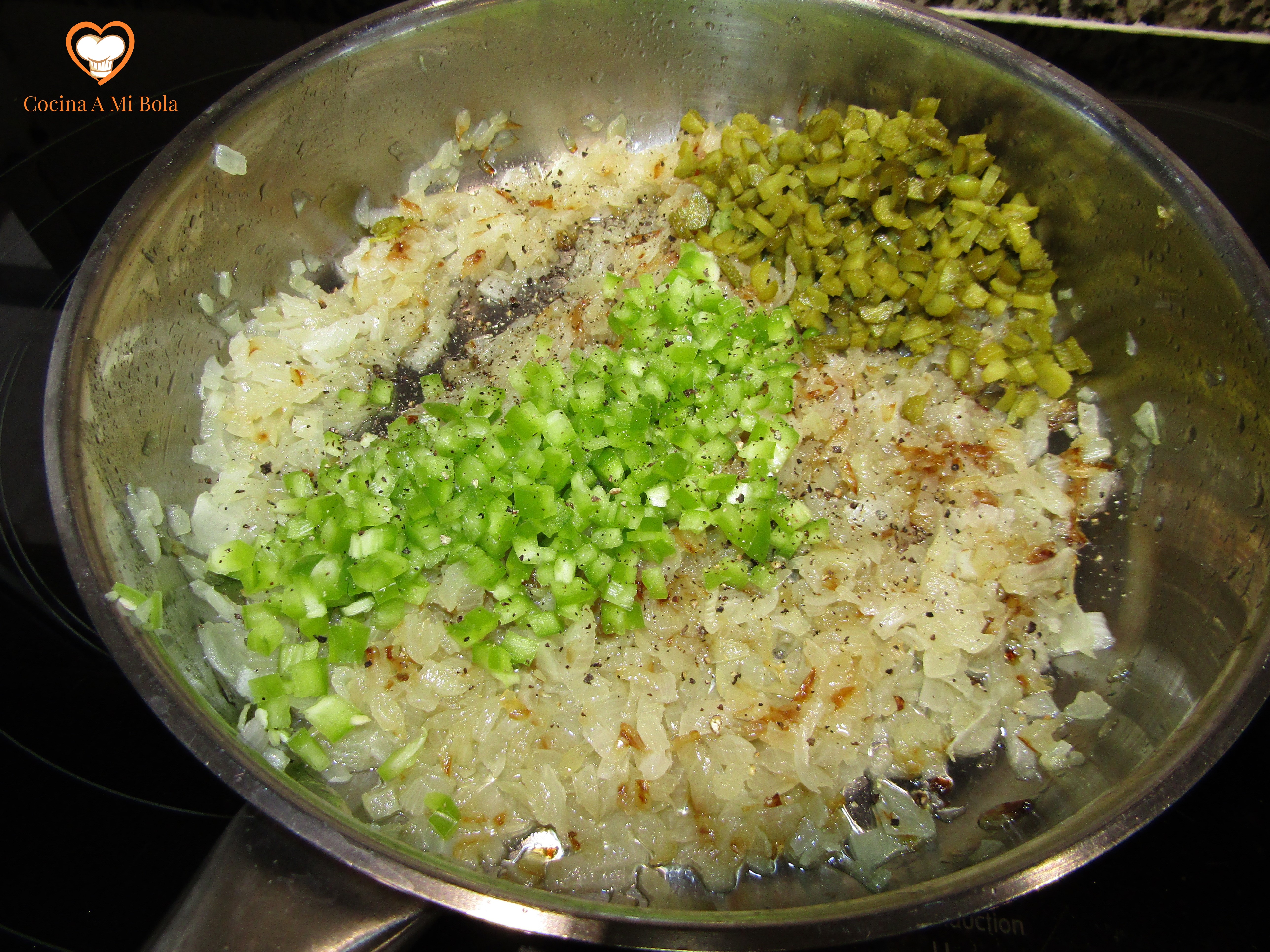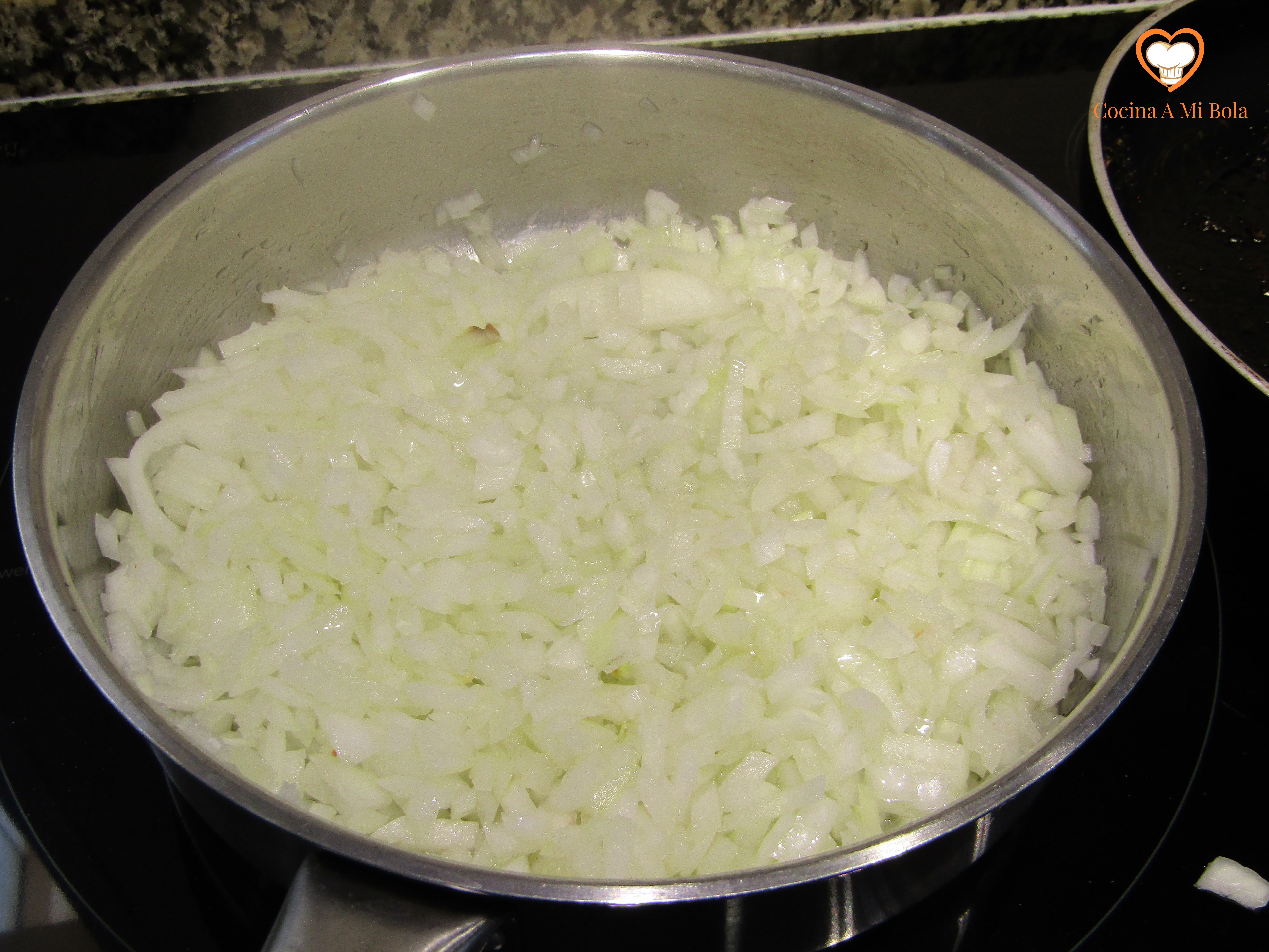 PRIMERO.- Y vamos a ello. Pela las cebollas, pícalas en trocitos menudos y ponlas a pochar en aceite de oliva. Hazlas despacio, pon un poco de pimienta negra molida y en cuanto empiecen a dorarse, apaga el fuego, sácalas a un plato bien escurridas del aceite y déjalo enfriar. Si queda un poco entera no pasa nada porque le va muy bien.