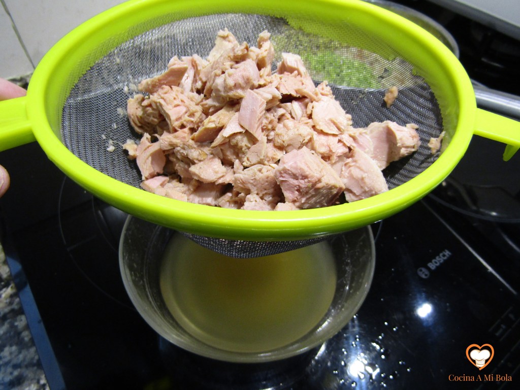 SEGUNDO.- Abre la lata o las latas de atún claro al natural y echa su contenido en un colador para que escurran el agua salina en la que se envasa.