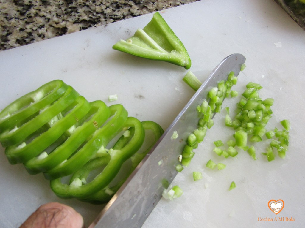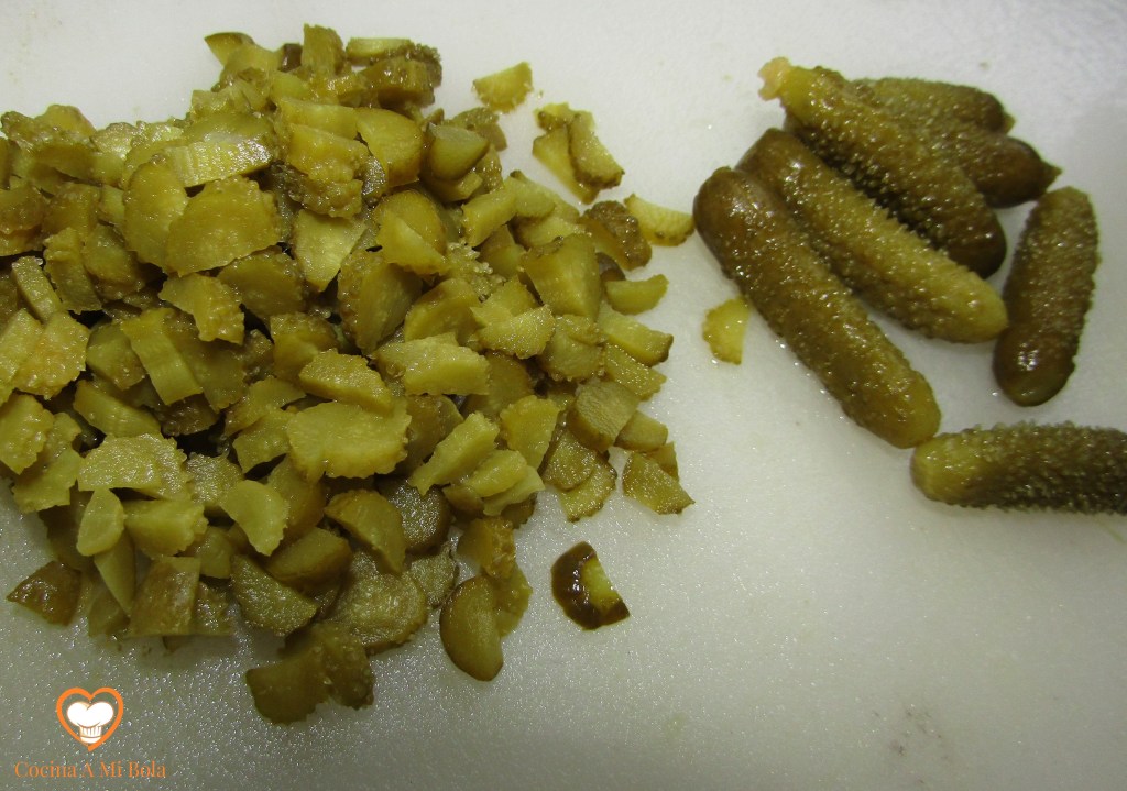TERCERO.- Lava el pimiento, elimina las partes blancas del interior y pícalo muy fino. Ahora pica también los pepinillos. Sin no te resulta agradable encontrarte trocitos de pepinillo y tener que masticarlos, tritúralos con una picadora para que queden micronizados.