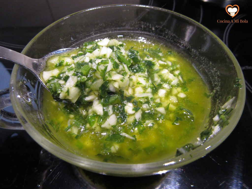 CUARTO.- Haz ahora un majado a base de ajo y perejil con el aceite de oliva virgen extra. Puedes hacerlo a mano o usar una picadora que lo hace estupendamente a no ser que te excedas y lo conviertas en puré.