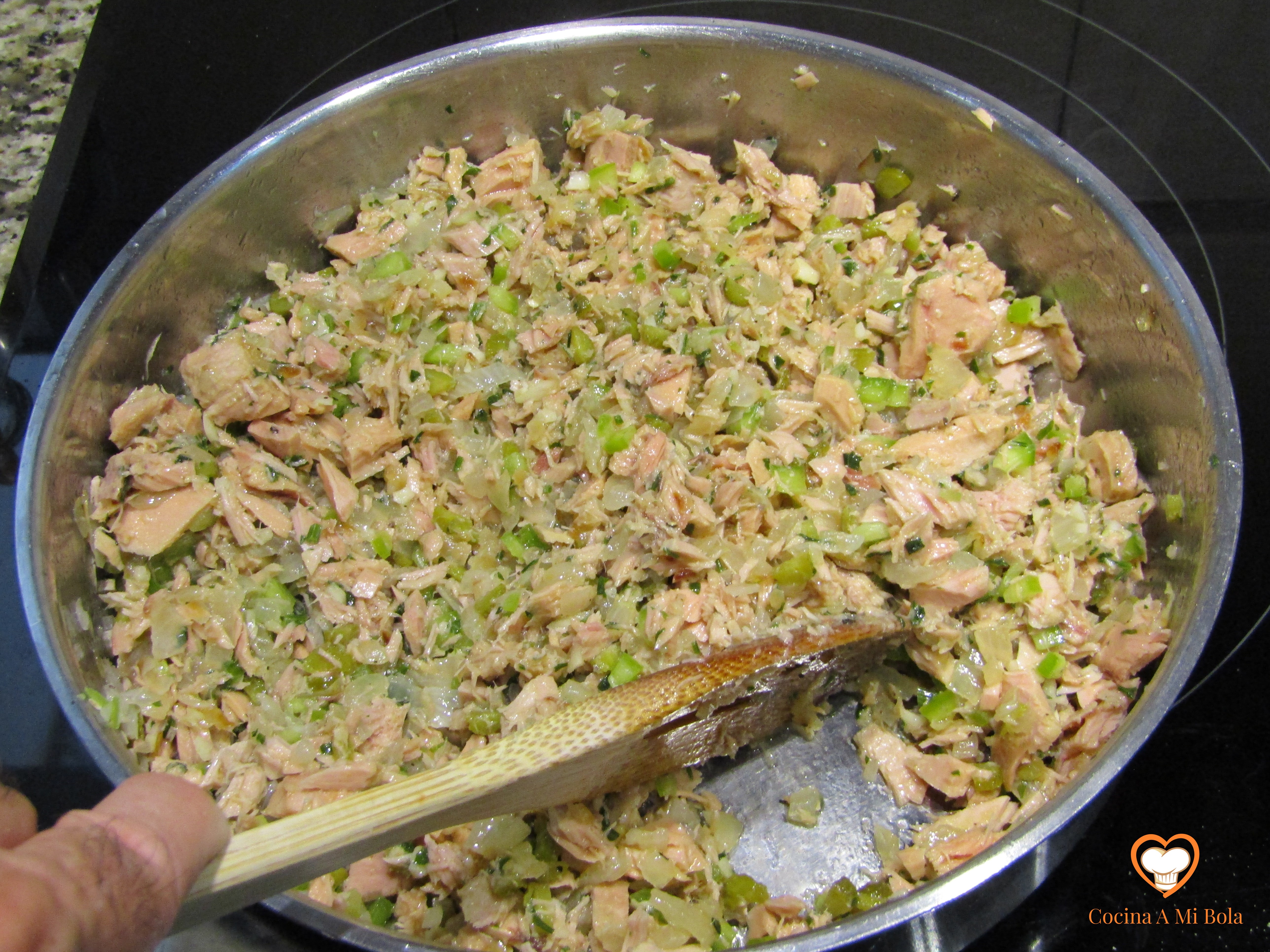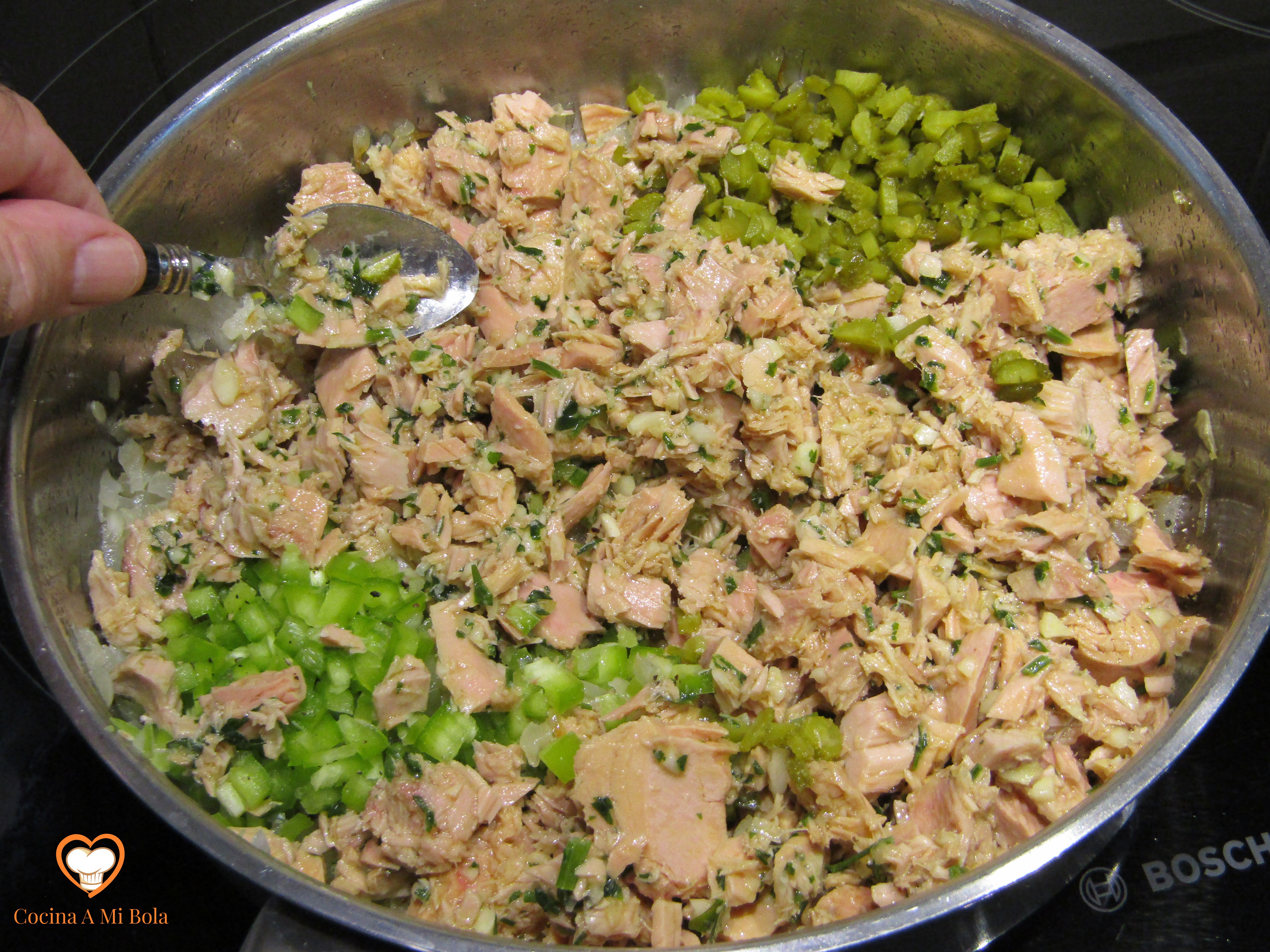 QUINTO.- Mezcla en un bol la cebolla, los pepinillos, el pimiento y el majado de ajo y perejil. Añade el atún bien escurrido y mezcla. Adereza con salsa de soja y prueba de vez en cuando hasta que -a tu juicio- no necesite más. Habrás observado que no hemos puesto sal a la cebolla y eso es porque la salsa de soja y el pepinillo cumplen esa función.