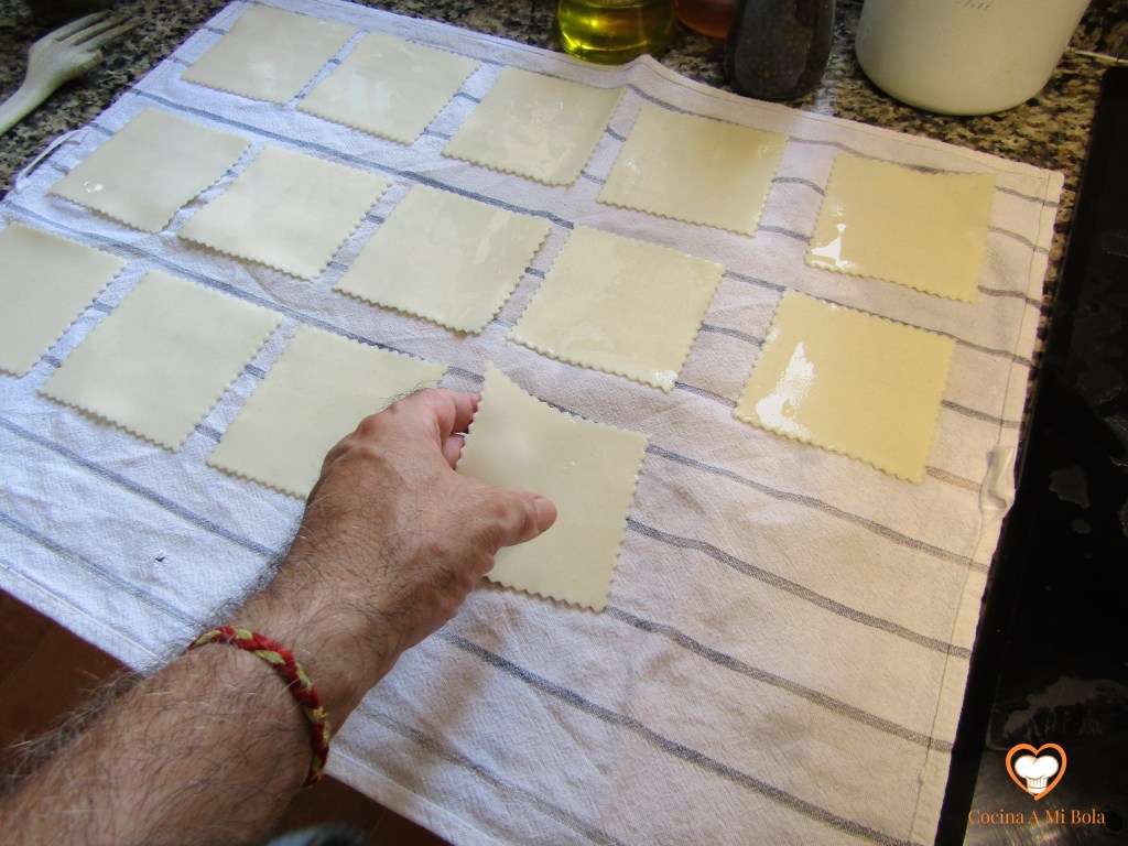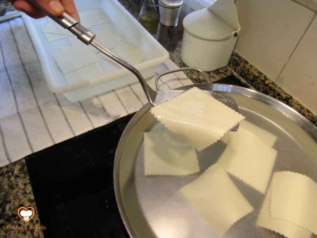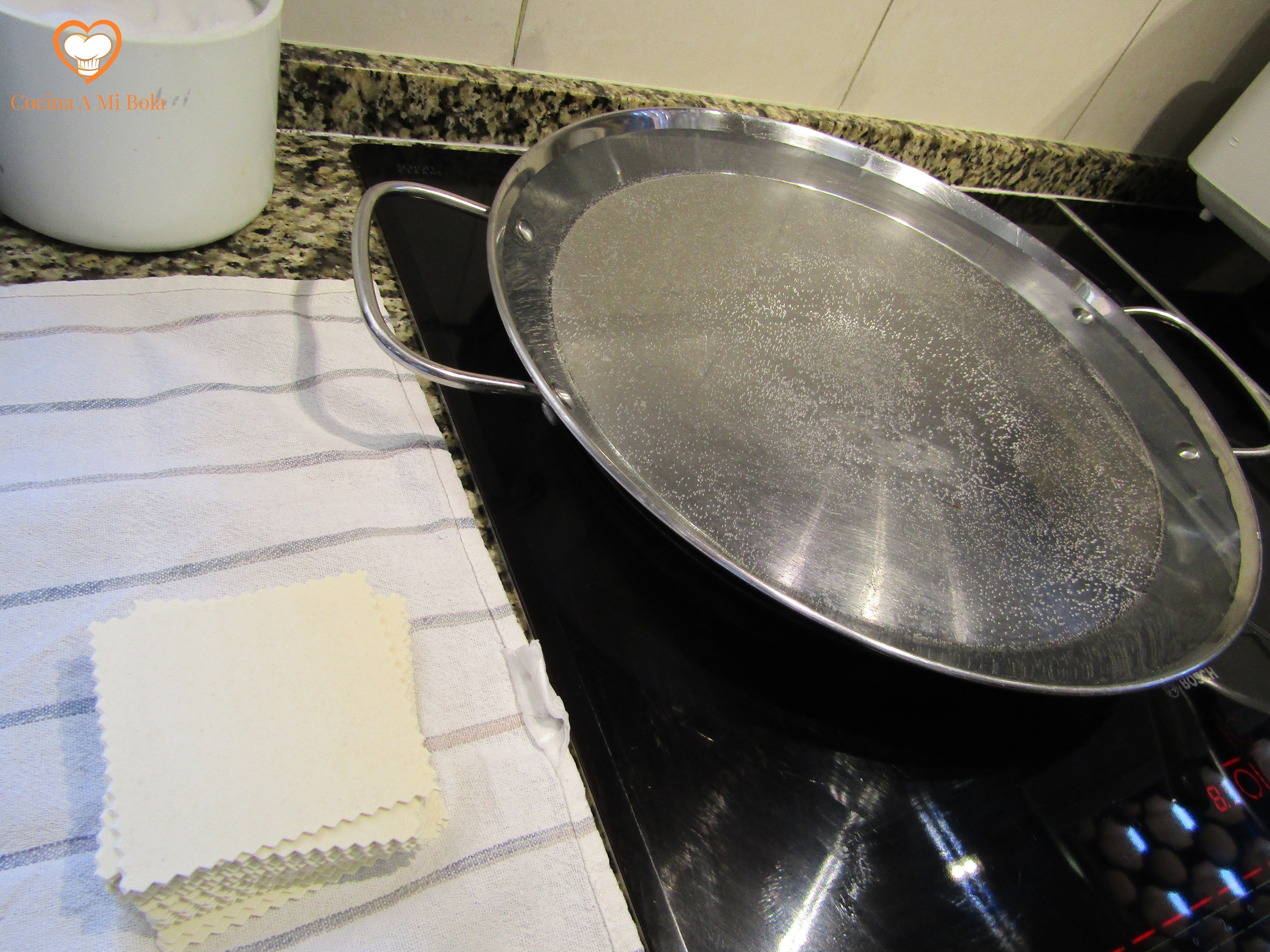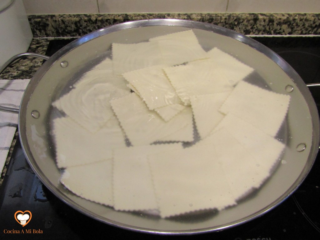 SEXTO.- Para cocer la pasta yo uso una paella. Tal vez sea exagerado, pero así tengo una superficie mayor para distribuir las placas y que no se peguen entre ellas. Pon agua a hervir y cuando lo haga, añade sal. Echa las placas y cuécelas durante el tiempo que recomiende el fabricante, serán unos 6 a 10 minutos. Y procura estar pendiente para que no se peguen, pero manipúlalas con mucho cuidado para que no se rompan. Una vez transcurrido el tiempo, échalas en un recipiente con agua fría para detener la cocción.
