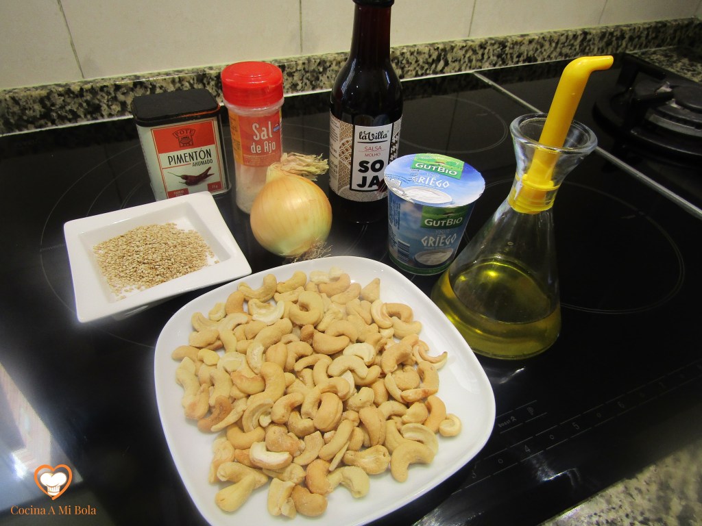 INGREDIENTES: 150 gr. anacardos tostados con sal, 1 yogur griego sin azúcar, 80 grs cebolla dulce, 3 cucharadas soperas salsa de soja, 2 cucharadas soperas semillas de sésamo, media cucharada de postre de sal de ajo, ½ cucharada postre de pimentón ahumado, 2 cucharadas de aceite de oliva virgen extra.