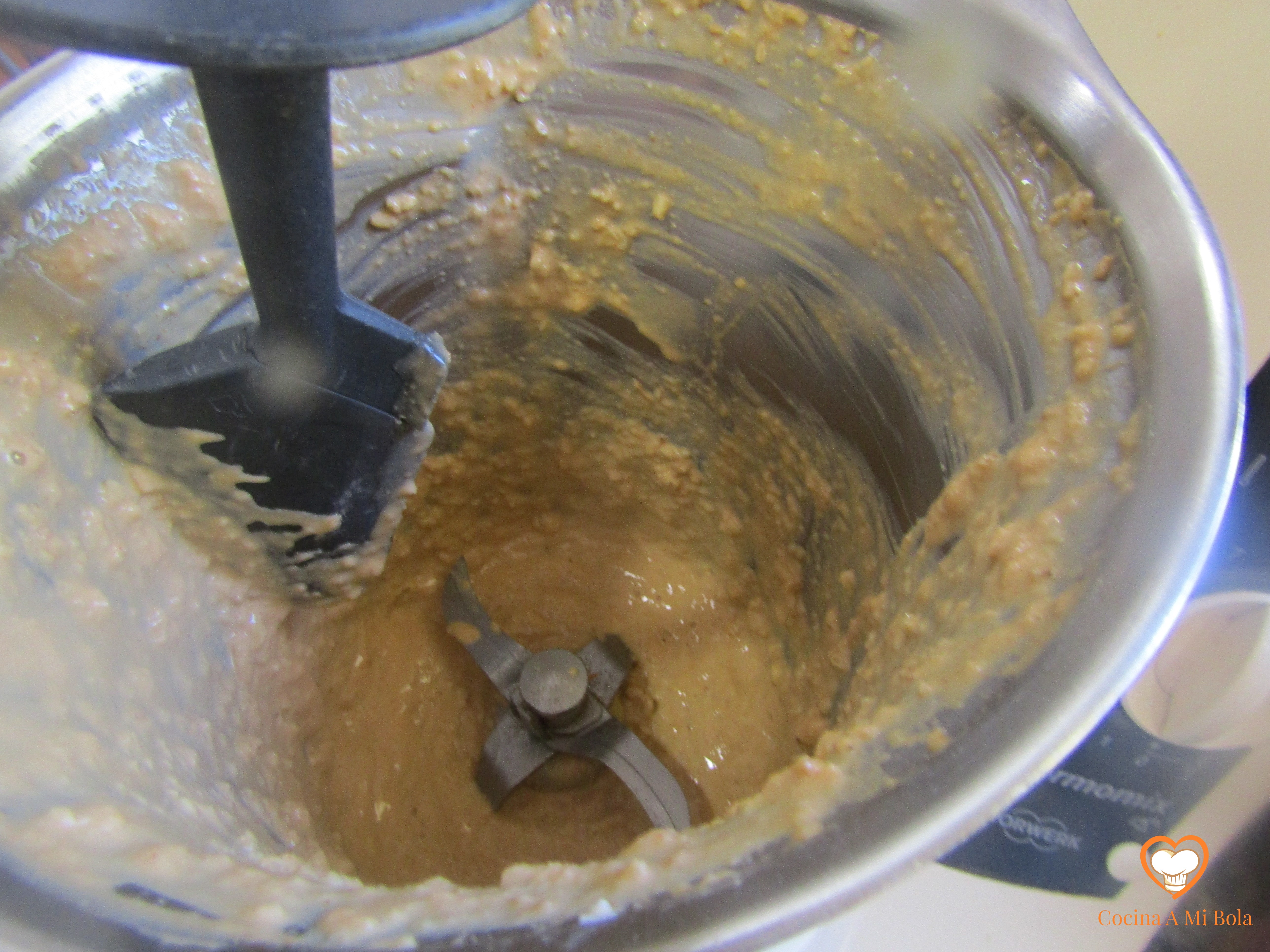 SEGUNDO.- Una vez triturado y habiendo comprobado que no han quedado trozos del fruto seco, pondremos en marcha el robot a velocidad baja-media e iremos agregando ingredientes empezando por la cebolla.