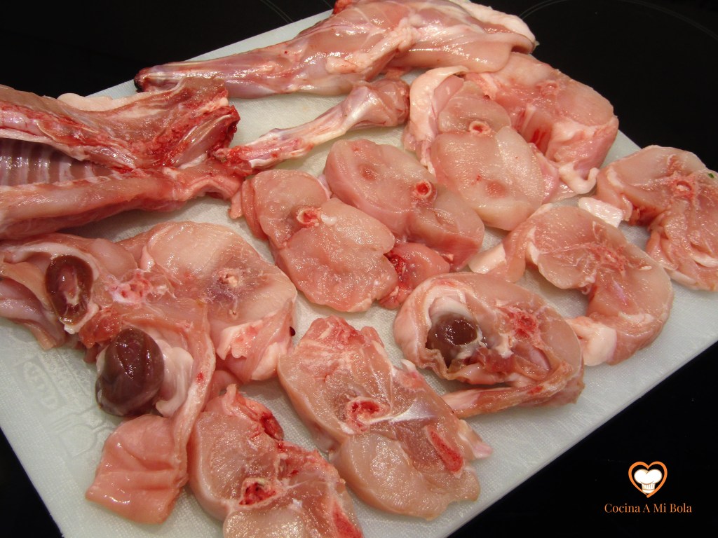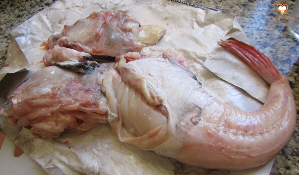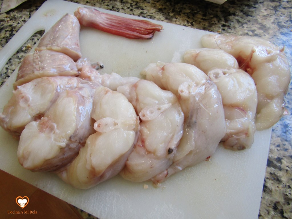 Y vamos con el plato: el rape debe estar limpio eliminando esa telilla que conforma como una segunda capa de piel (oscura por arriba y blanquecina por el vientre) de textura muy gomosa y bastante desagradable en la boca, al menos para mi gusto. Lo cortas en rodajas gorditas, pones sal y lo reservas en el frigorífico. Mira las fotos.