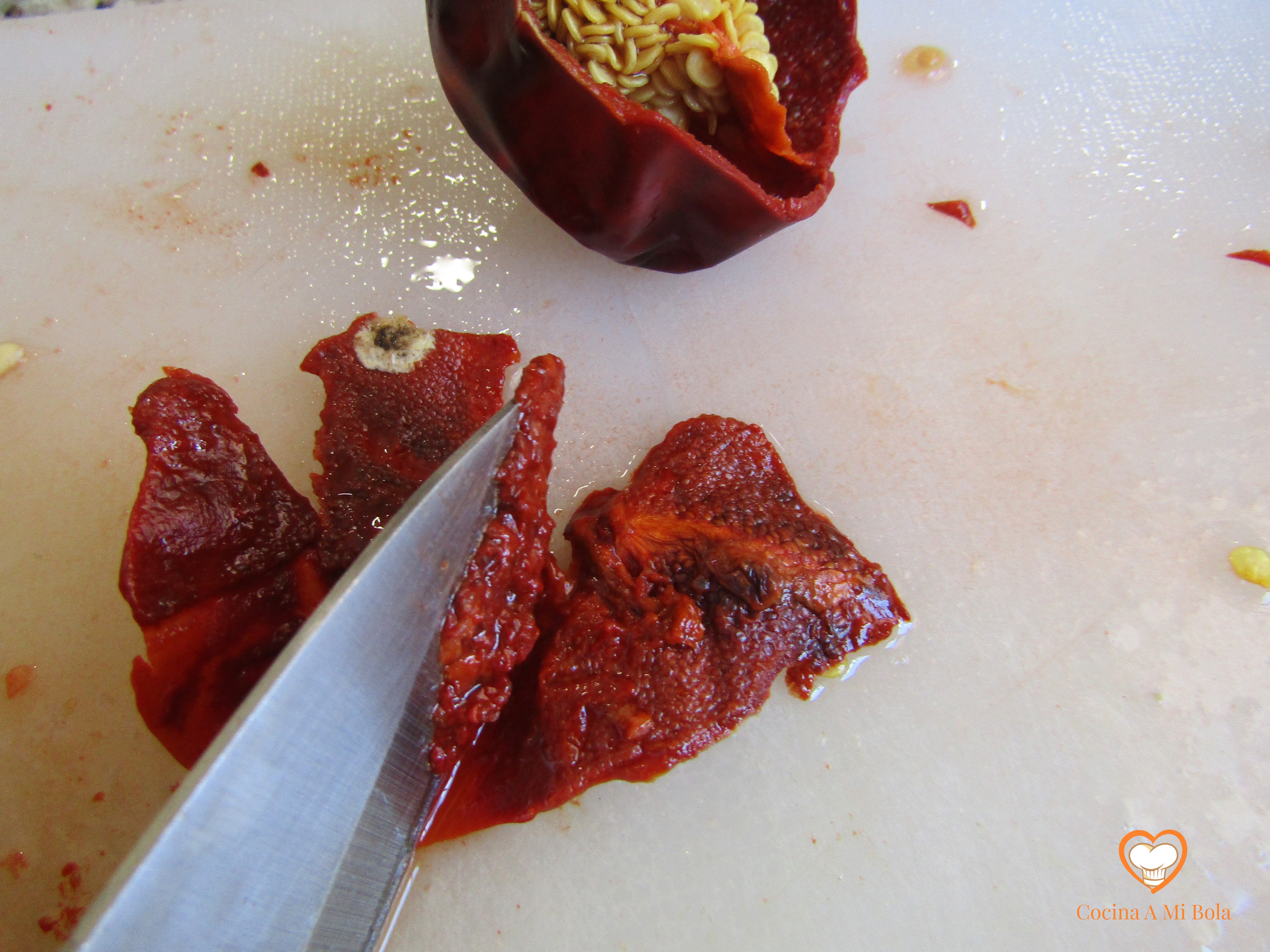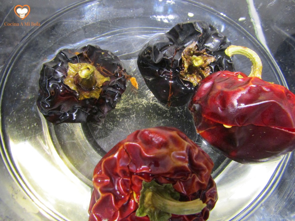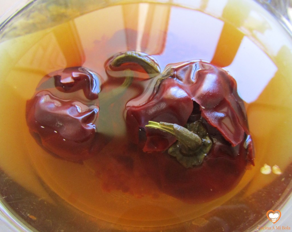 PRIMERO.- Antes de nada, lava bien las ñoras, hazles unos cortes y sumérgelas en agua procurando que se llenen para que no queden flotando. Haz esto unas dos horas antes como mínimo para que se rehidraten.