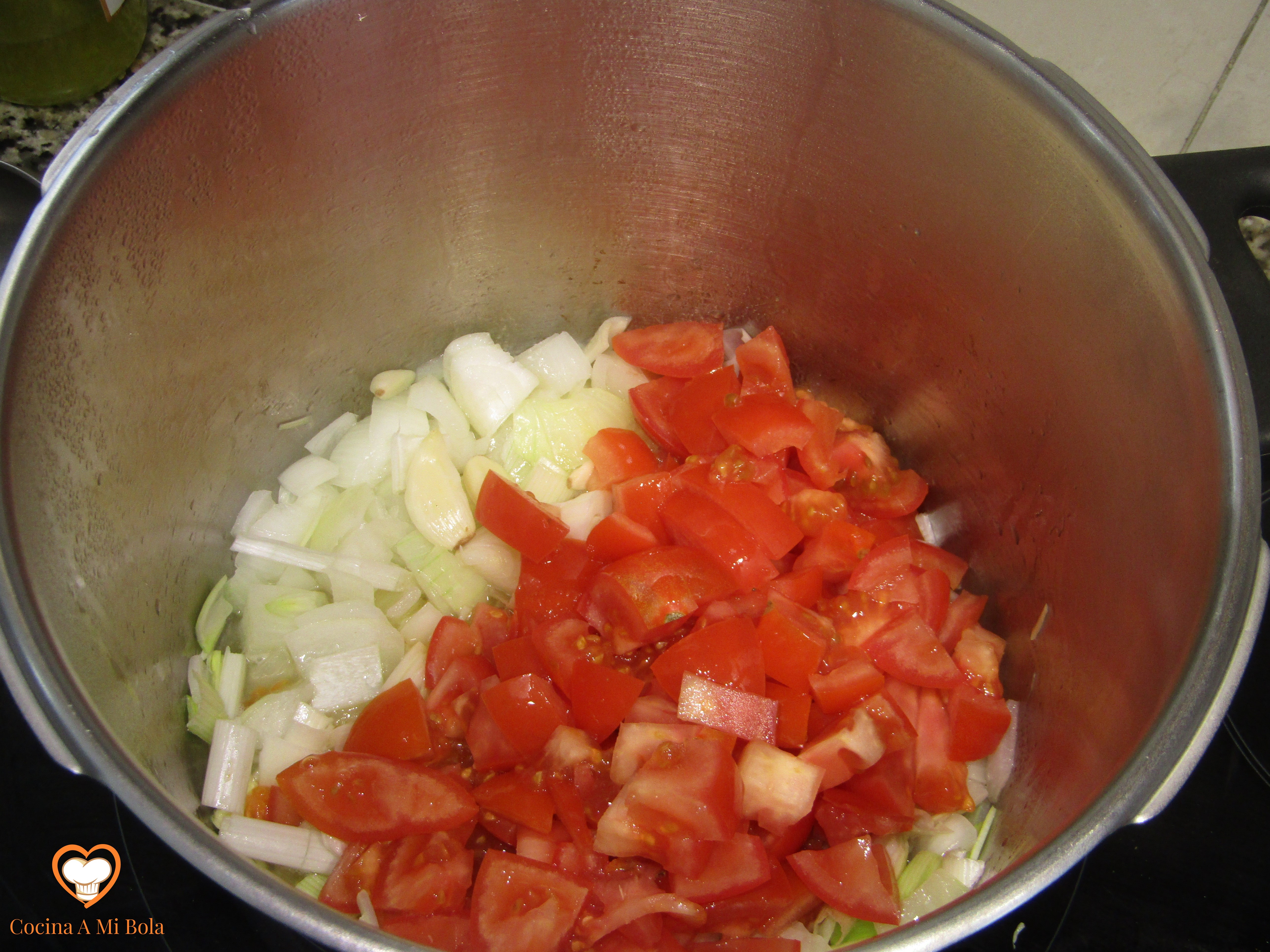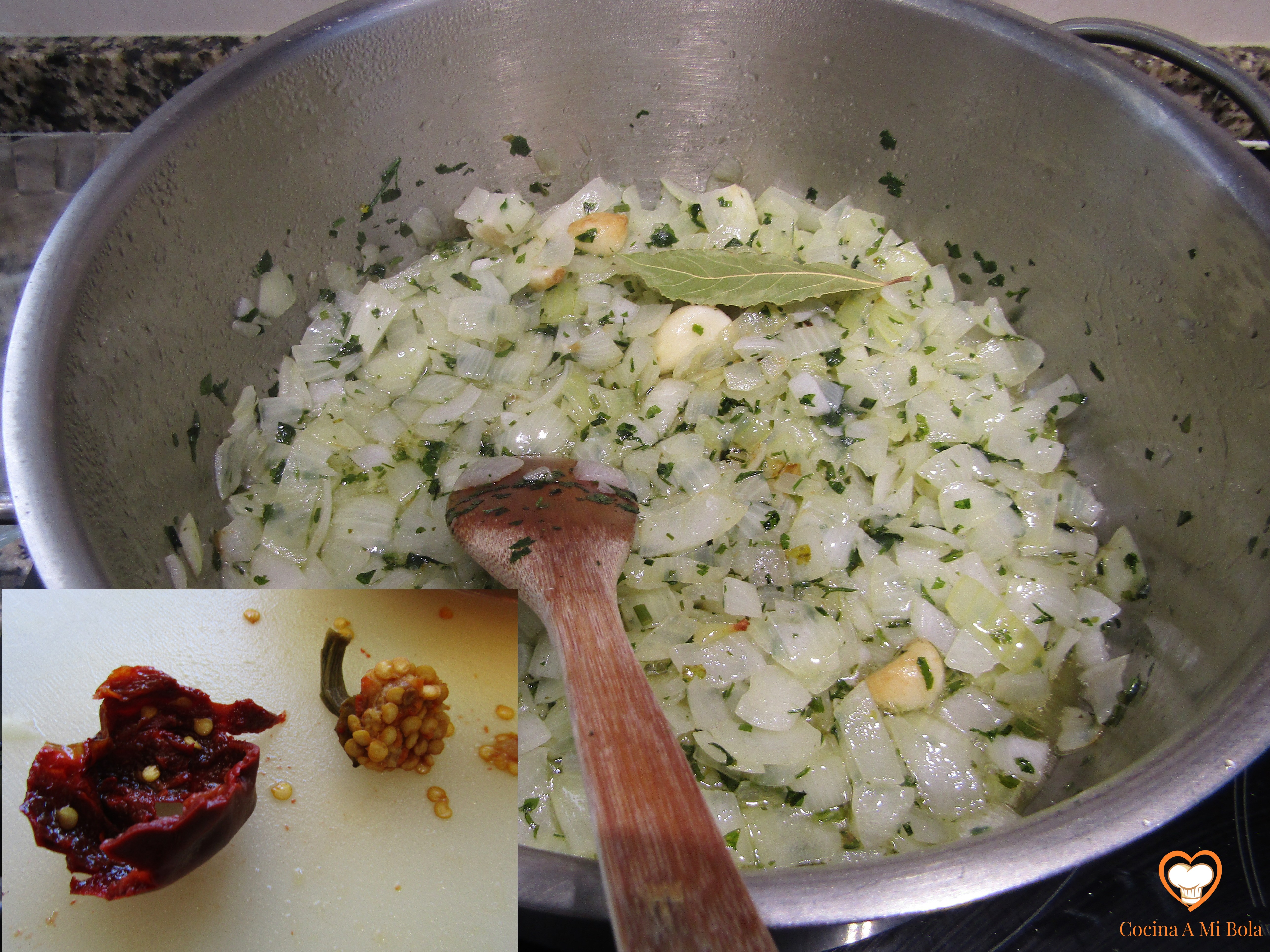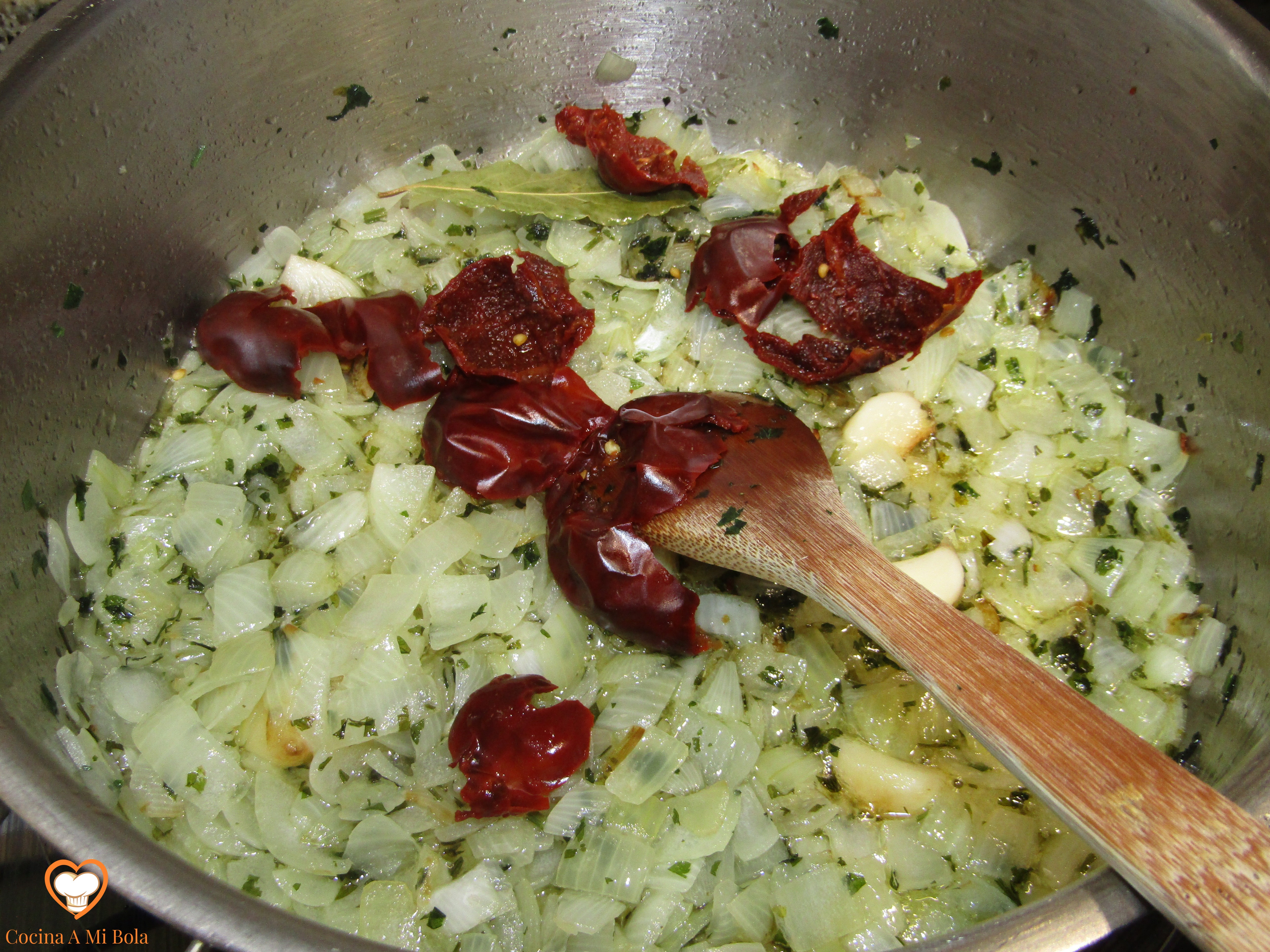 TERCERO.- Pela las cebollas y córtalas en cuadraditos no muy pequeños para que conserven buena parte de su jugo. Ponlas a pochar a fuego medio y añade todos los ajos menos 3 ó 4, el perejil (no demasiado picado), la cayena y el laurel.