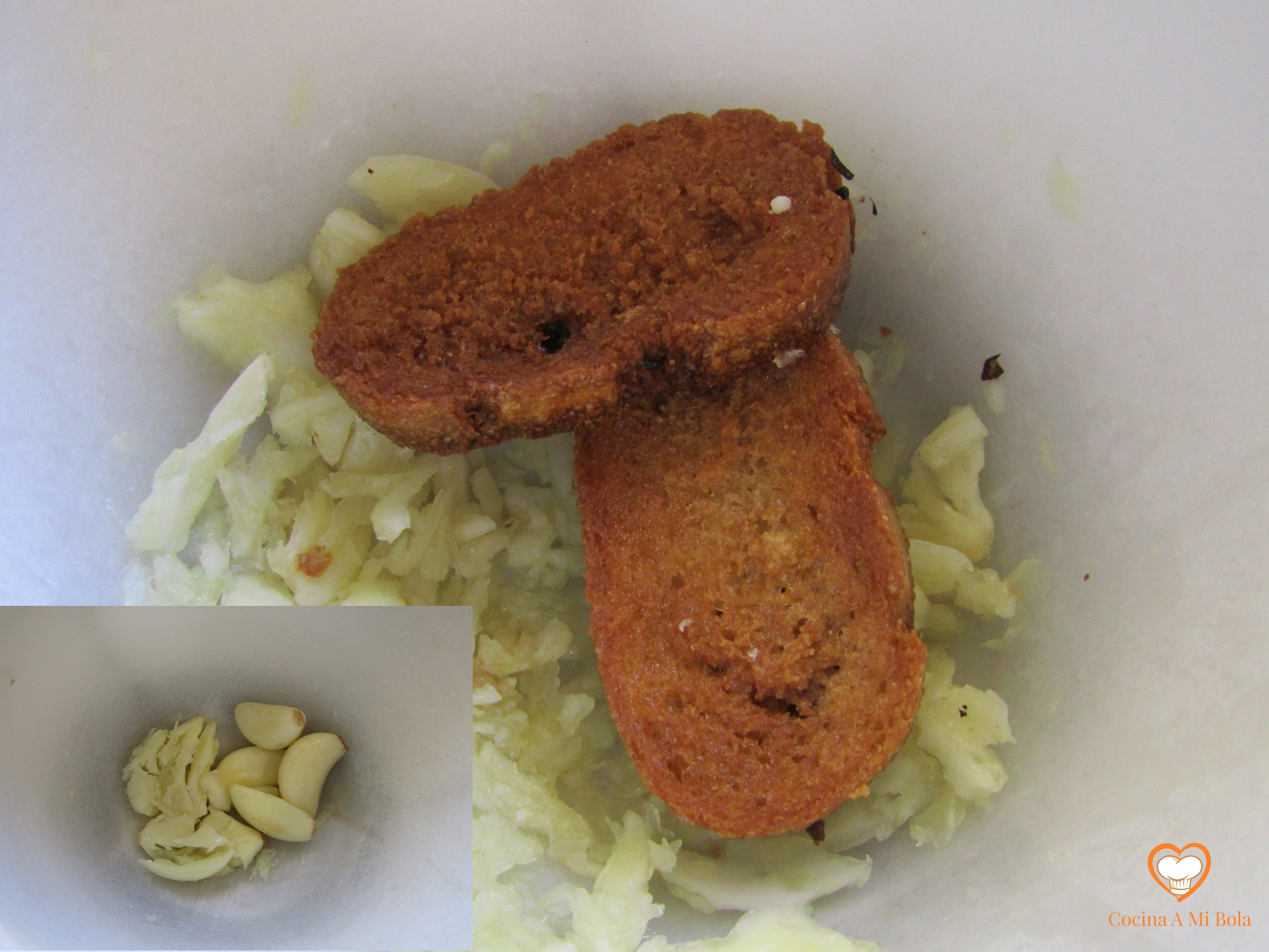 SEXTO.- Pon un pellizco de sal en el mortero y maja en él los ajos que nos habíamos reservado. Ahora ve añadiendo poco a poco las rebanadas de pan frito para que se vayan mezclando bien con el ajo. No hace falta convertirlo en harina. Unos trozos muy pequeñitos bien mezclados con el ajo nos servirán para echarlo todo en la cazuela.