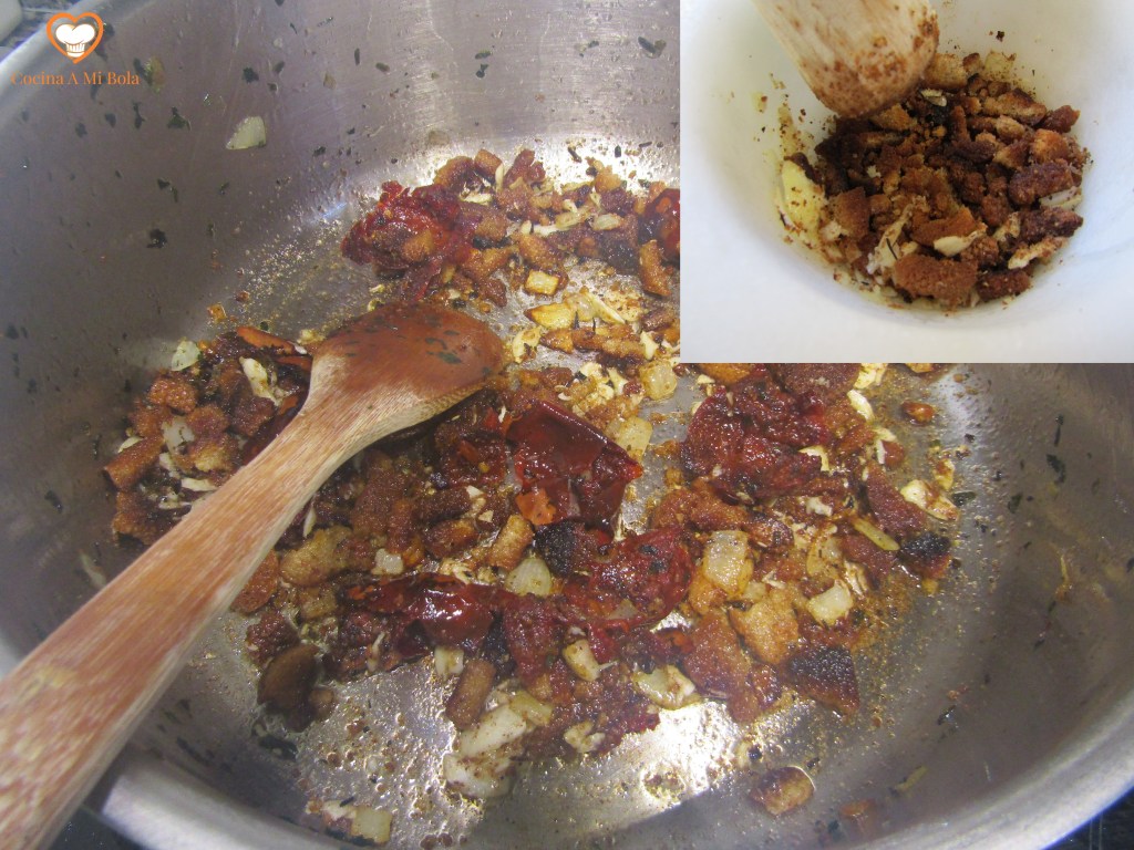 SÉPTIMO.- Ponemos de nuevo la cazuela al calor y mezclamos bien el pan frito con el ajo y las ñoras para que rehogue unos 5-7 minutos a fuego lento pero sin que deje de crepitar. A continuación, echamos el vino y le damos unos tres minutos más para que evapore el alcohol.