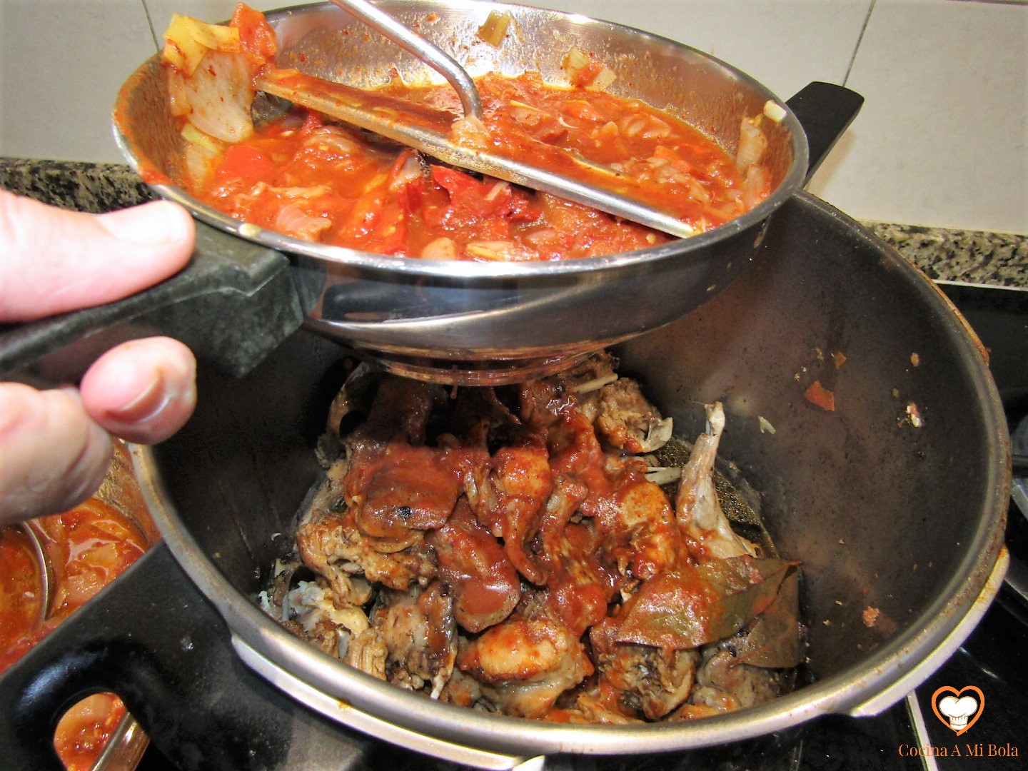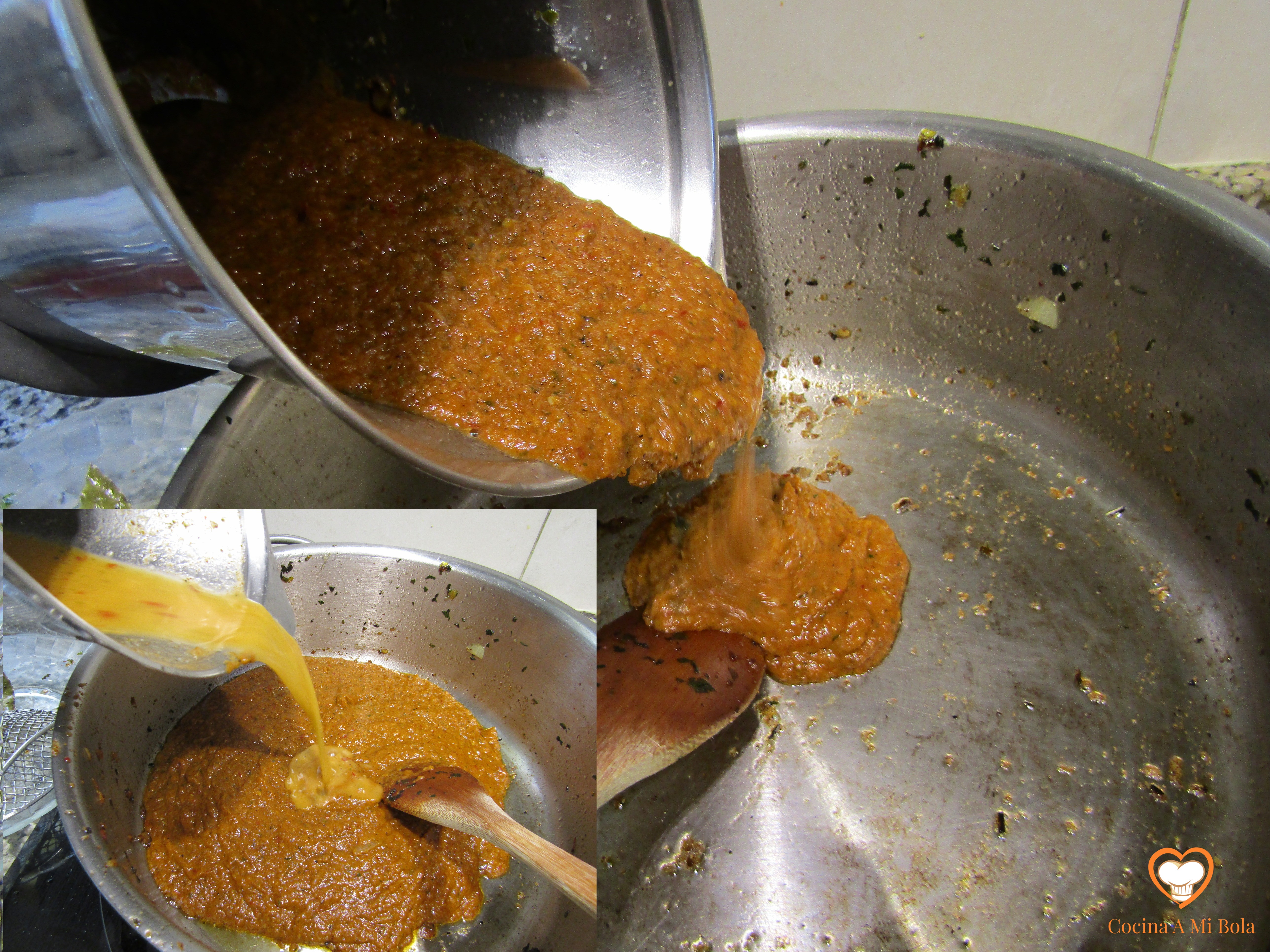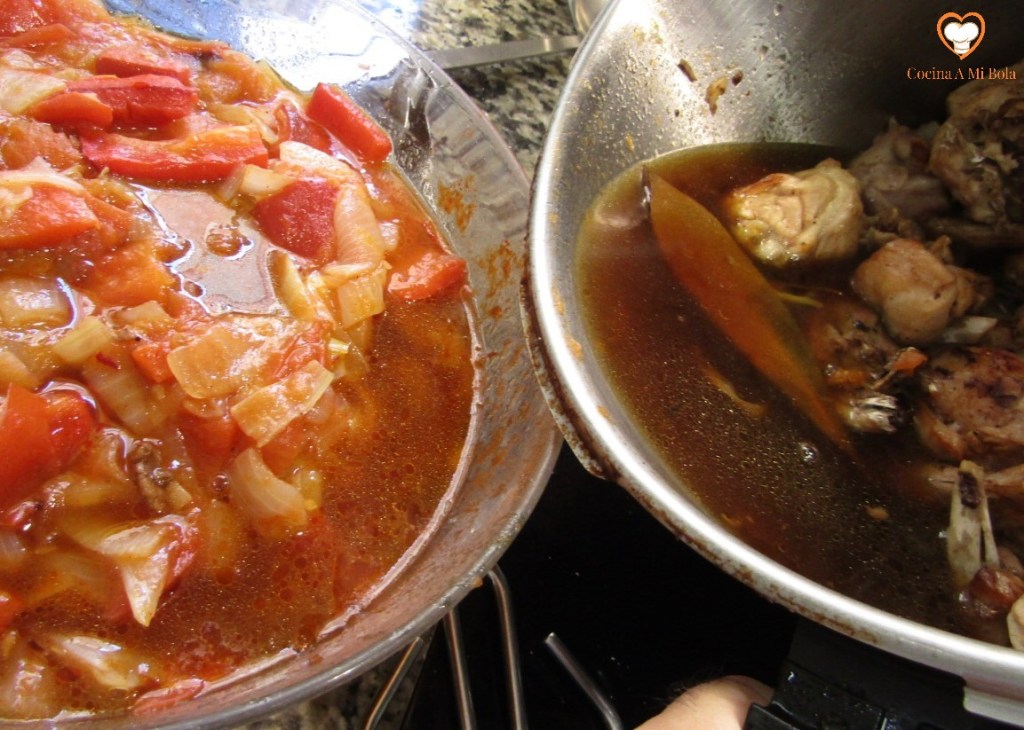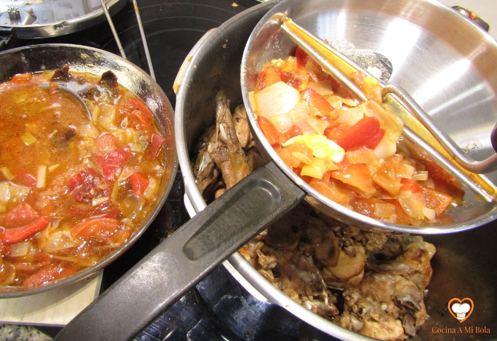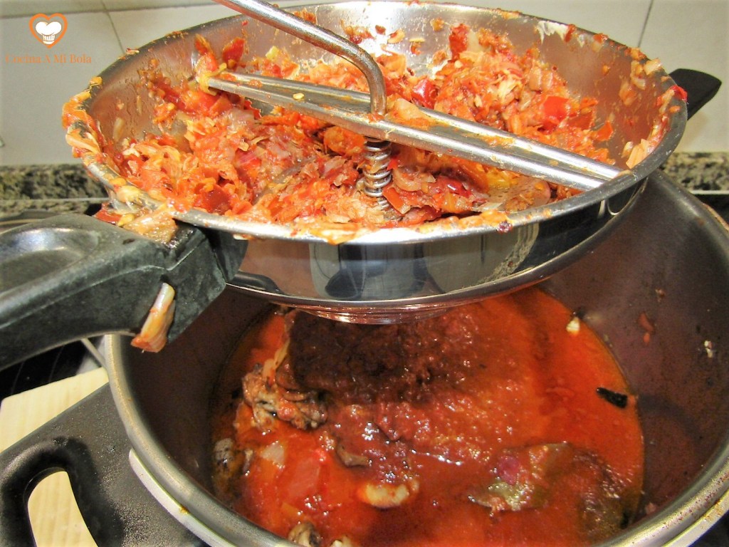 OCTAVO.- Poniendo a salvo de nuevo el laurel, echamos el contenido de la cazuela al vaso batidor que contiene la cebolla y el ajo pochados. Batimos bien y devolvemos a la cazuela junto al laurel. Añadimos unos 150cc de agua al vaso batidor para aprovechar el fondo y lo echamos a la salsa, mezclamos bien y llevamos a ebullición lentamente. Pon atención porque tenderá a pegarse al fondo y quemarse, así que mantenlo a fuego mínimo pero que conserve el hervor. Cuidado con la cantidad de agua que echas no vaya a ser que dejes la salsa muy líquida así que hazlo poco a poco para ir calculando. Por otra parte y con independencia de su densidad, soy consciente que con estas cantidades sale bastante salsa, pero es una manía que me domina desde hace años: no soporto que falte salsa y lo cierto es que hacer más cantidad es prácticamente gratis y si te sobra, seguro que le darás buen uso al día siguiente…. cocina de aprovechamiento, jejeje.