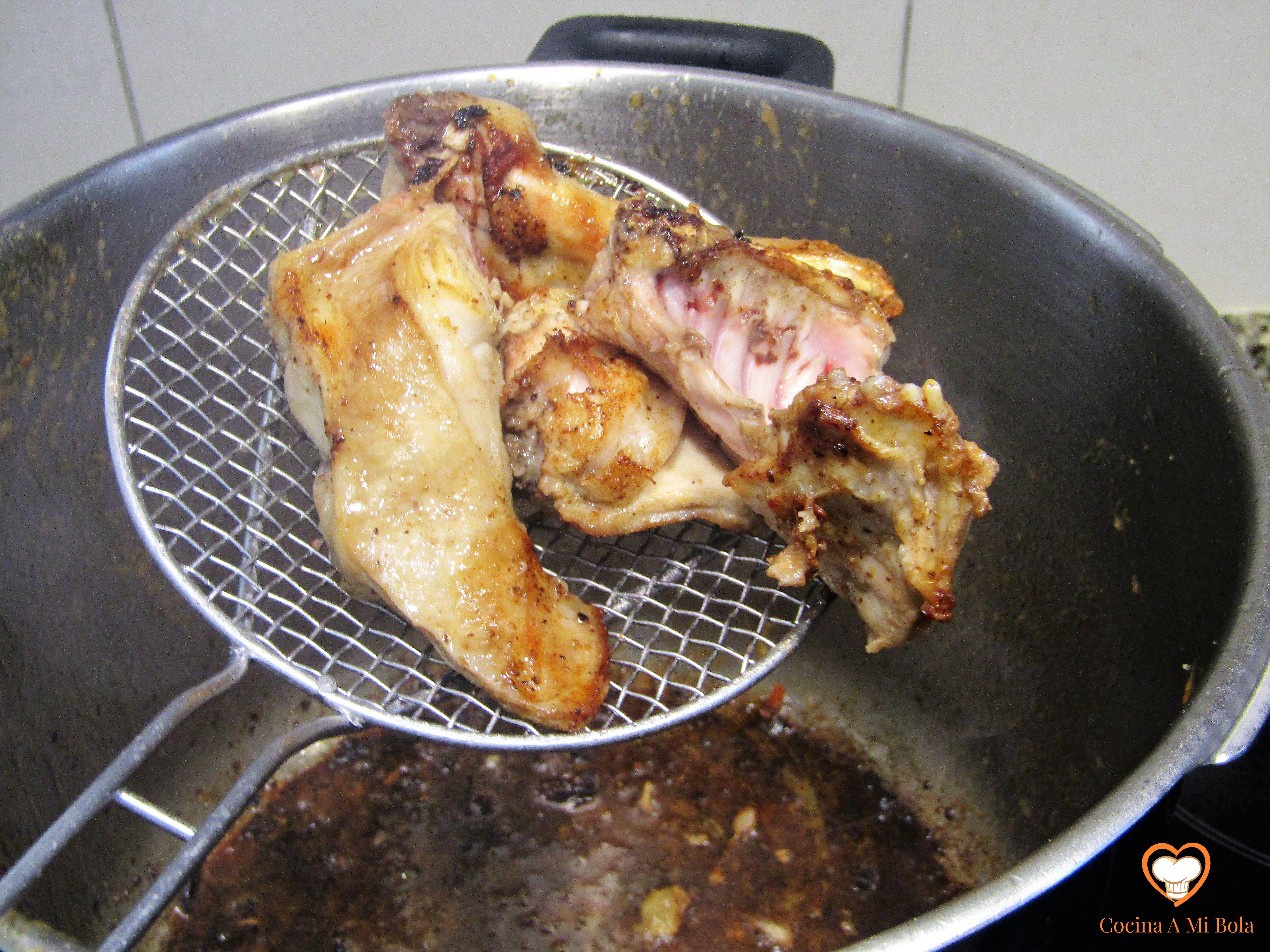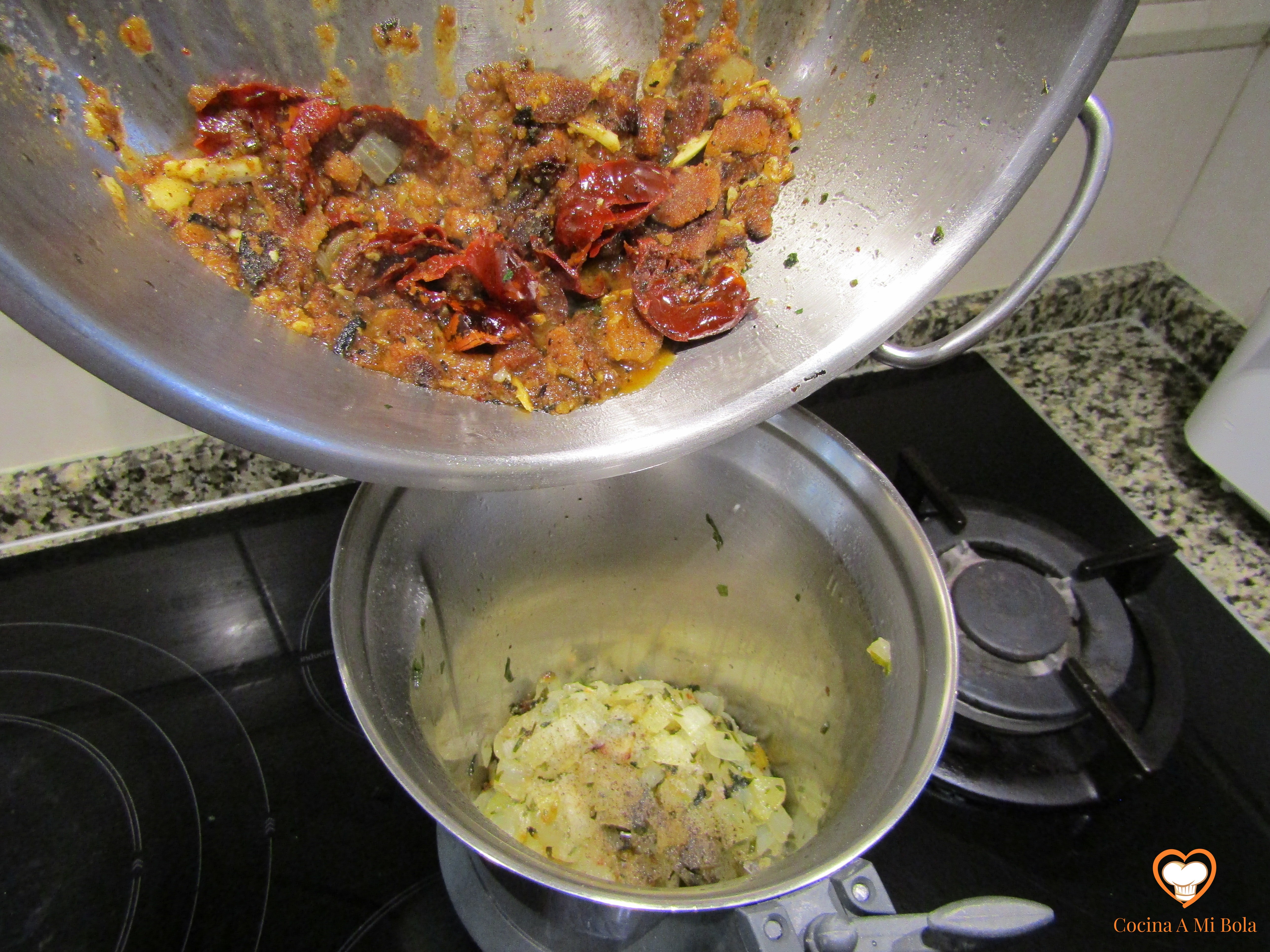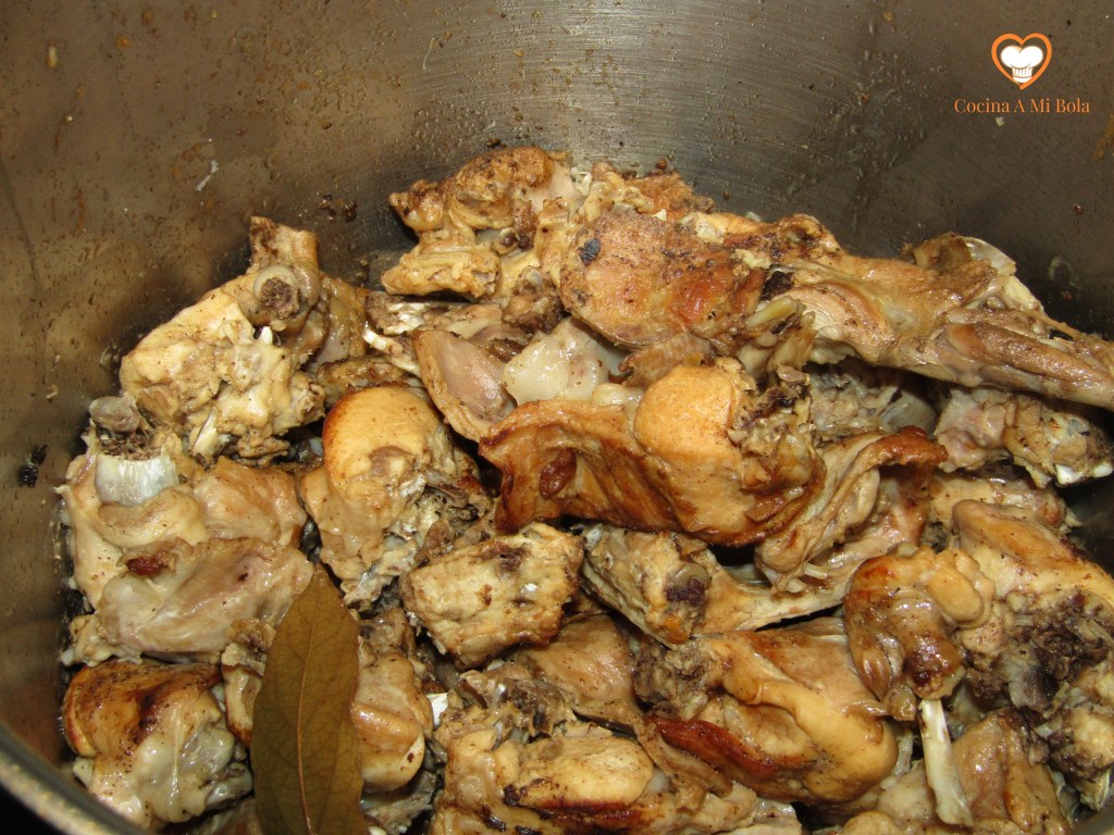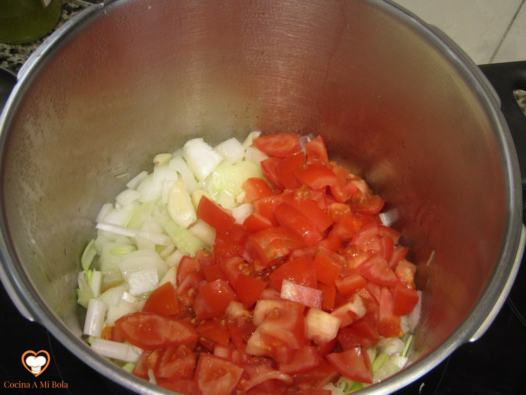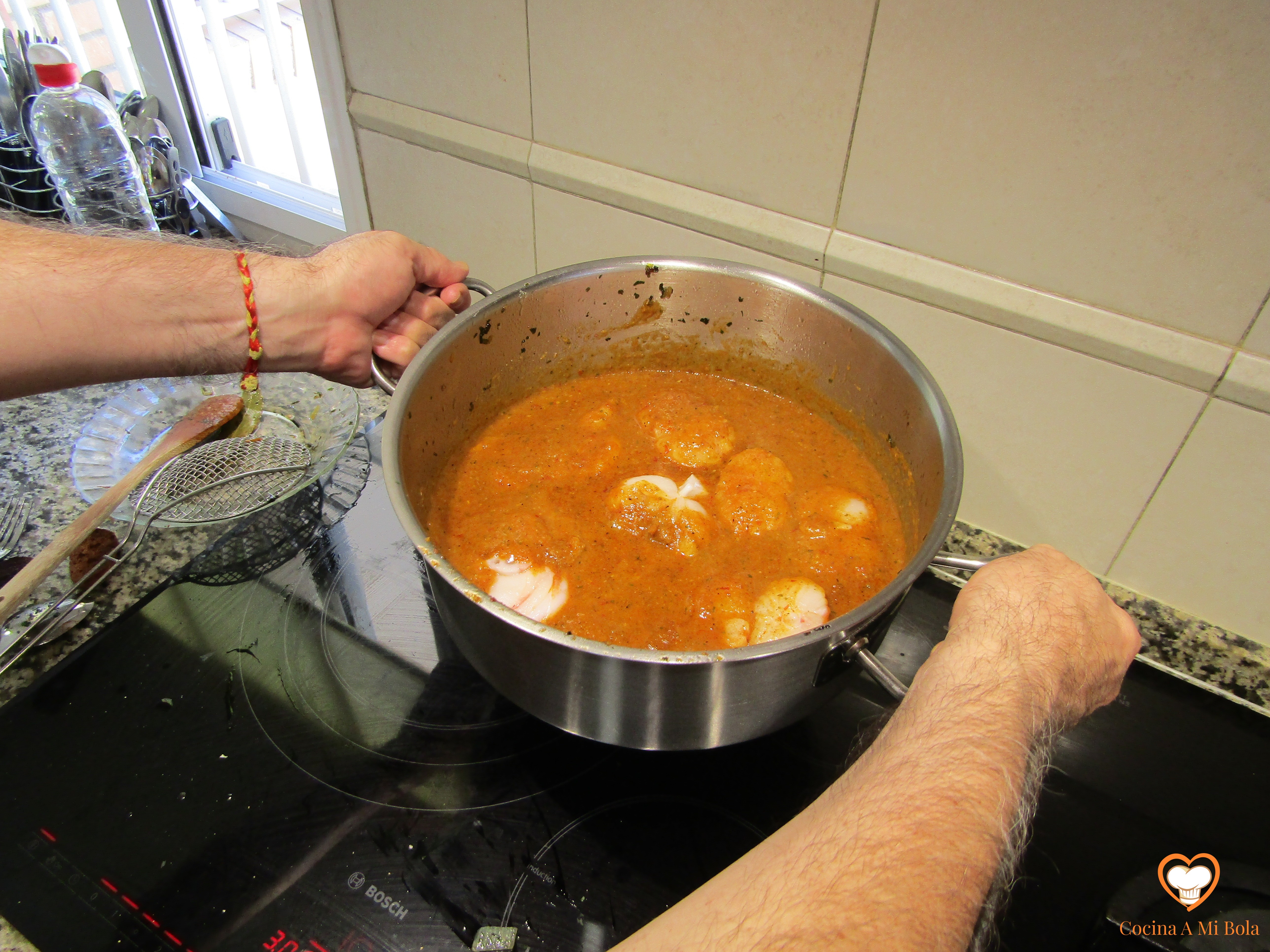 OCTAVO.- Poniendo a salvo de nuevo el laurel, echamos el contenido de la cazuela al vaso batidor que contiene la cebolla y el ajo pochados. Batimos bien y devolvemos a la cazuela junto al laurel. Añadimos unos 150cc de agua al vaso batidor para aprovechar el fondo y lo echamos a la salsa, mezclamos bien y llevamos a ebullición lentamente. Pon atención porque tenderá a pegarse al fondo y quemarse, así que mantenlo a fuego mínimo pero que conserve el hervor. Cuidado con la cantidad de agua que echas no vaya a ser que dejes la salsa muy líquida así que hazlo poco a poco para ir calculando. Por otra parte y con independencia de su densidad, soy consciente que con estas cantidades sale bastante salsa, pero es una manía que me domina desde hace años: no soporto que falte salsa y lo cierto es que hacer más cantidad es prácticamente gratis y si te sobra, seguro que le darás buen uso al día siguiente…. cocina de aprovechamiento, jejeje.