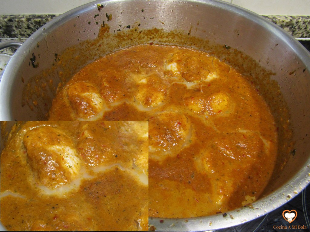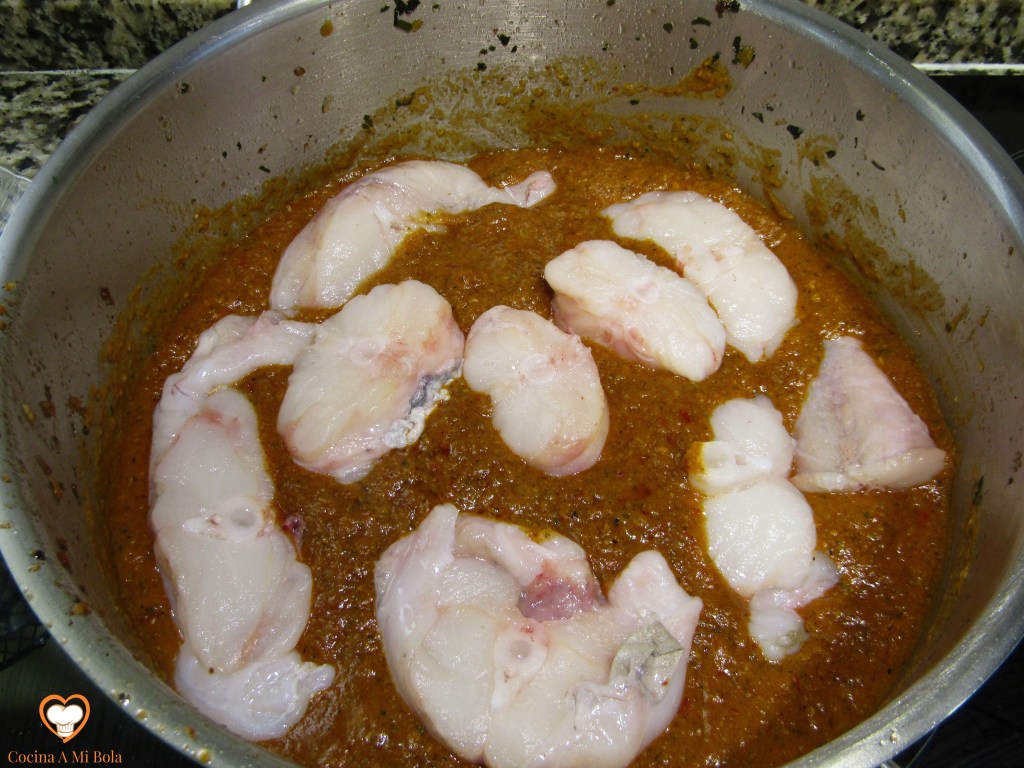 DÉCIMO.- Coloca las rodajas de rape bien repartidas por toda la superficie de la cazuela y observa cómo va soltando su propio jugo. Mira en las fotos ese líquido blanquecino que se forma alrededor de cada rodaja de pescado. Ese será el último ingrediente esencial de esta salsa. Pura esencia de rape. Toma la cazuela por ambas asas, ízala y dale movimientos circulares para que ese jugo se incorpore a la salsa sin tener que destrozar el pescado con la cuchara.