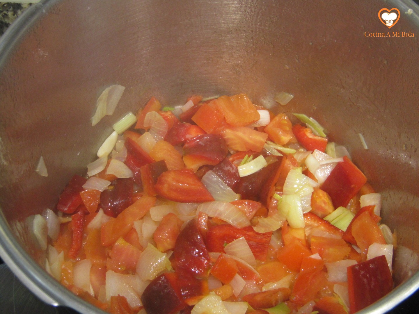 CUARTO.- En cuanto la cebolla vaya quedándose transparente, ya podemos echar las ñoras para que rehoguen con lo demás, así que quítales pedículo y semillas, y échalas a la cazuela. Salpimenta y remueve. A los 7-8 minutos aproximadamente, retiramos ñoras y laurel y echamos todo el contenido de la cazuela en el vaso batidor procurando escurrir el aceite para que quede dentro de ella y reservamos. Devuelve las ñoras y el laurel a la cazuela.