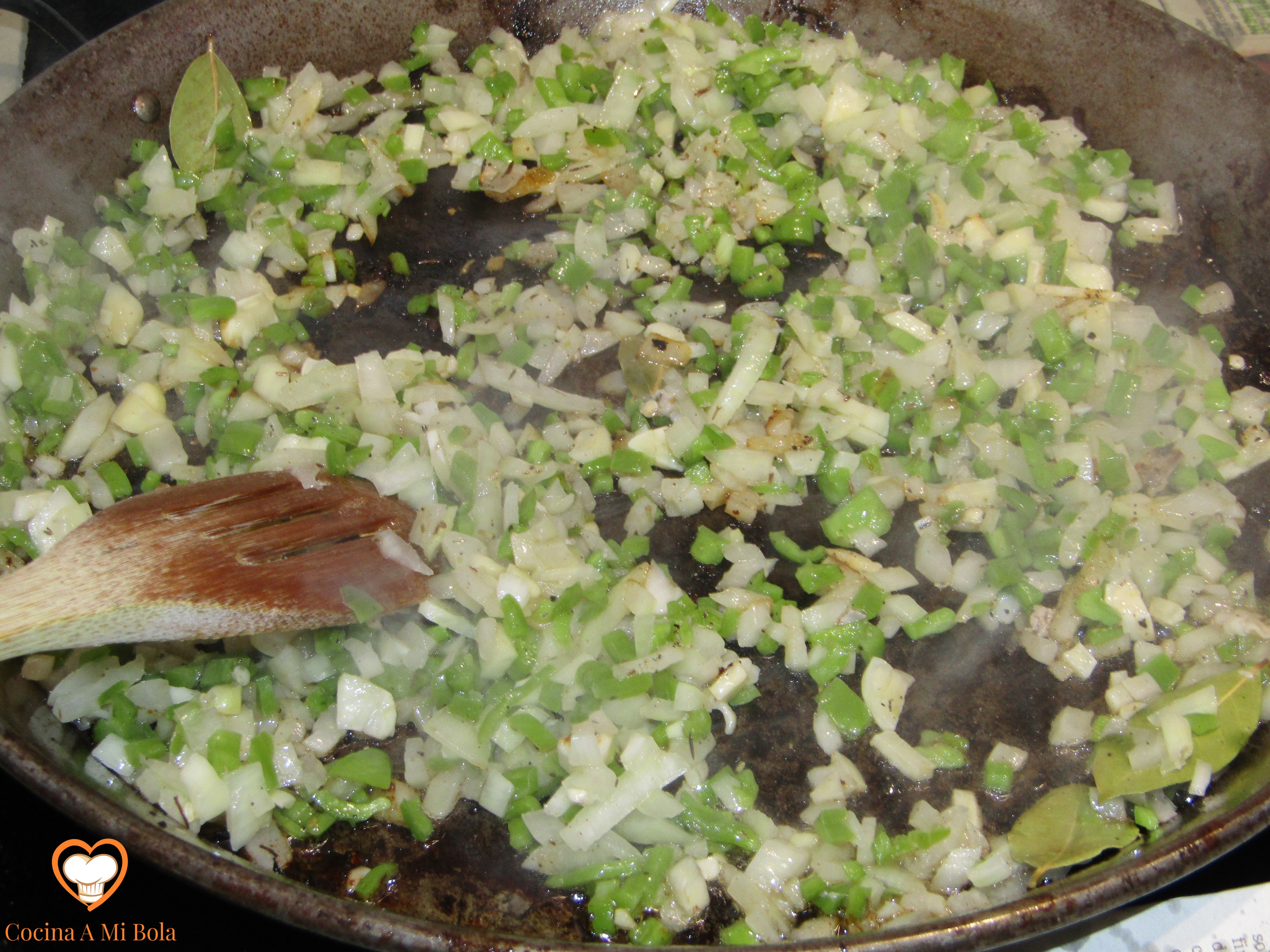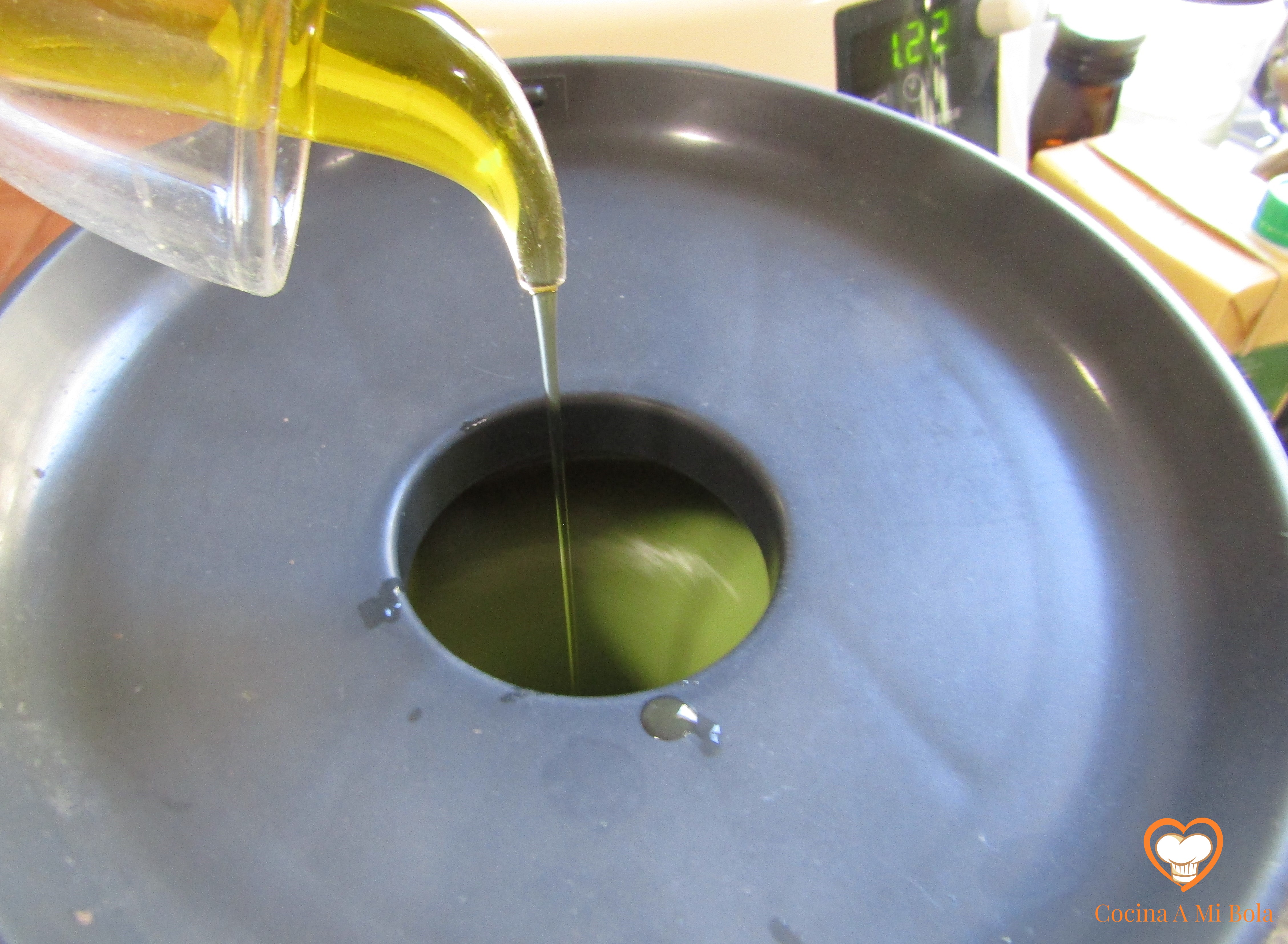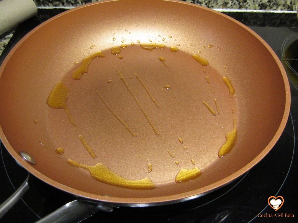 SEXTO.- Ponemos la sartén al fuego con un hilo de aceite de oliva. Mira la foto, porque no queremos aceitarlo demasiado. Y cuando esté caliente, echa el contenido del bol y no pares de remover con la cuchara de madera. Mueve también la sartén tratando de saltearlo para que se vaya troceando el huevo que se está cuajando, para que no se convierta eso en una tortilla.