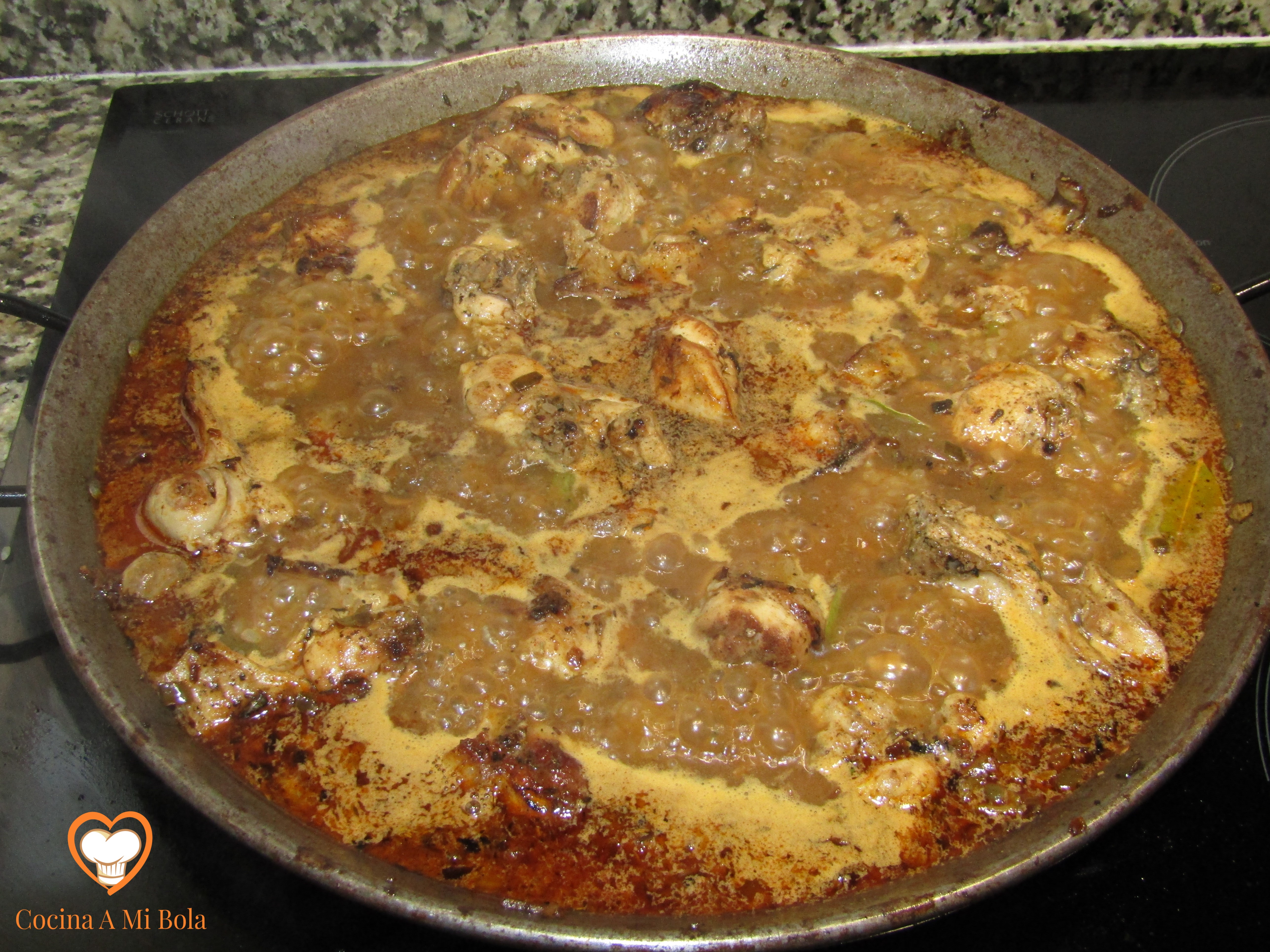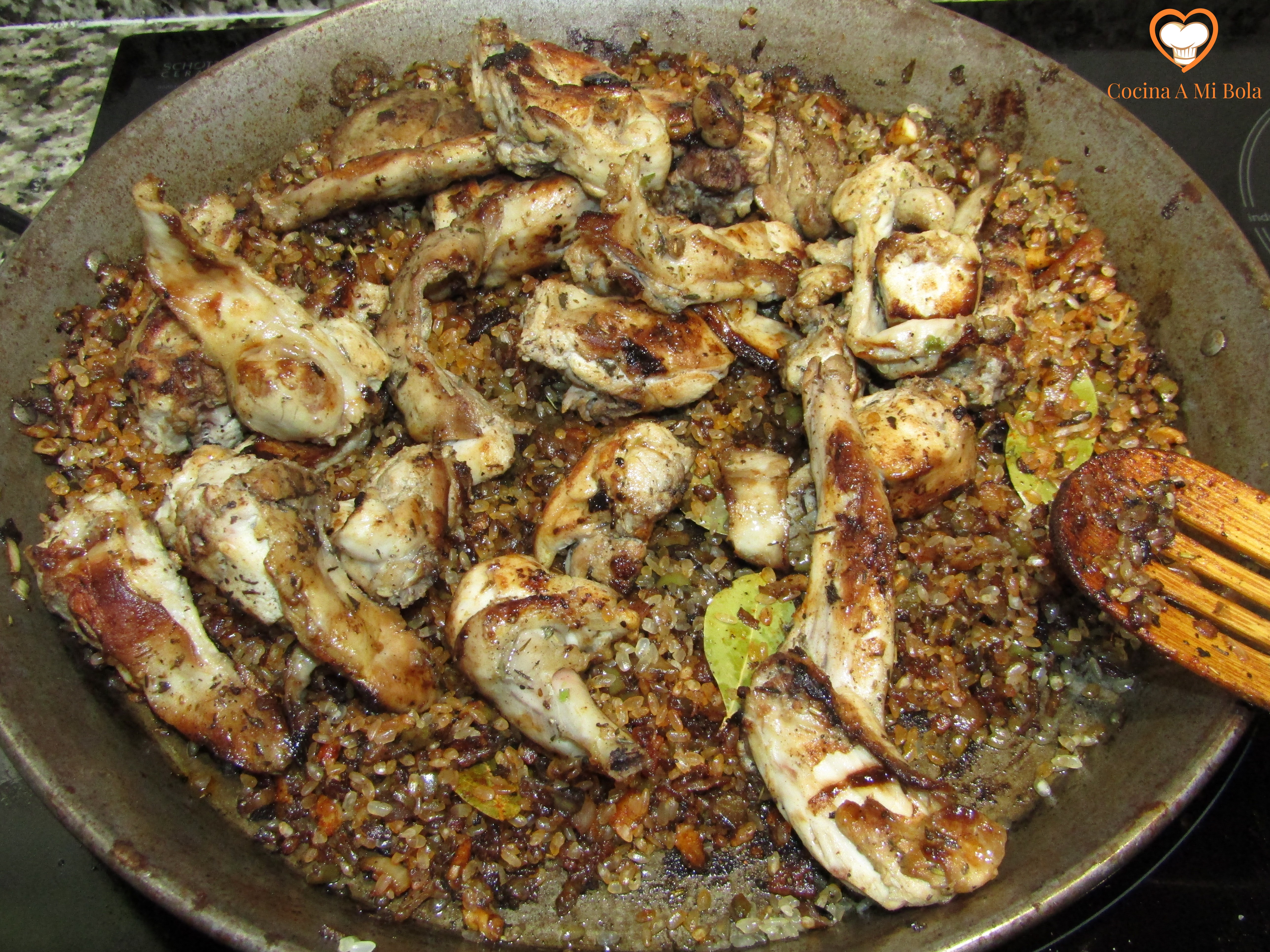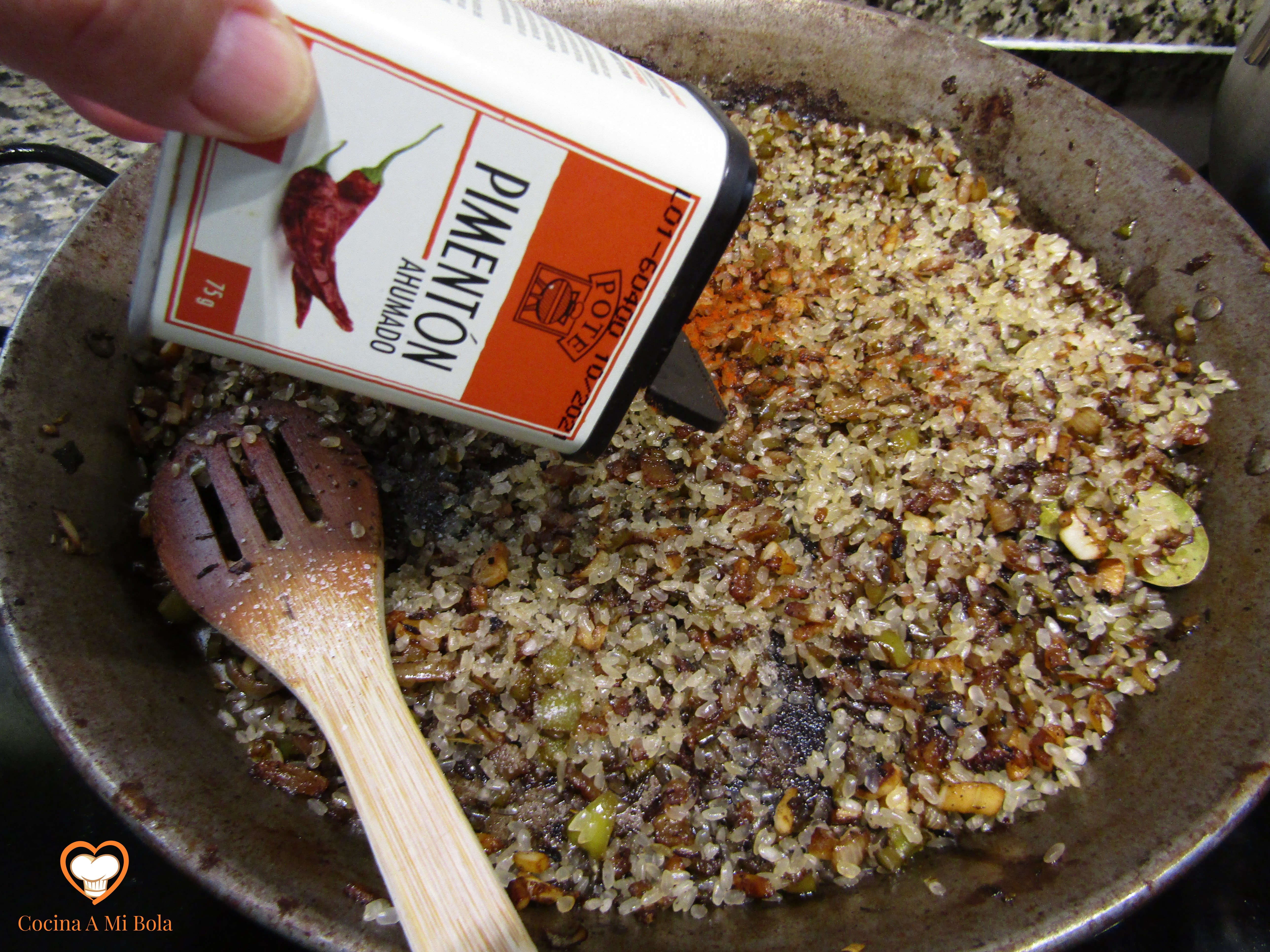SEXTO.- Ponemos la sartén al fuego con un hilo de aceite de oliva. Mira la foto, porque no queremos aceitarlo demasiado. Y cuando esté caliente, echa el contenido del bol y no pares de remover con la cuchara de madera. Mueve también la sartén tratando de saltearlo para que se vaya troceando el huevo que se está cuajando, para que no se convierta eso en una tortilla.