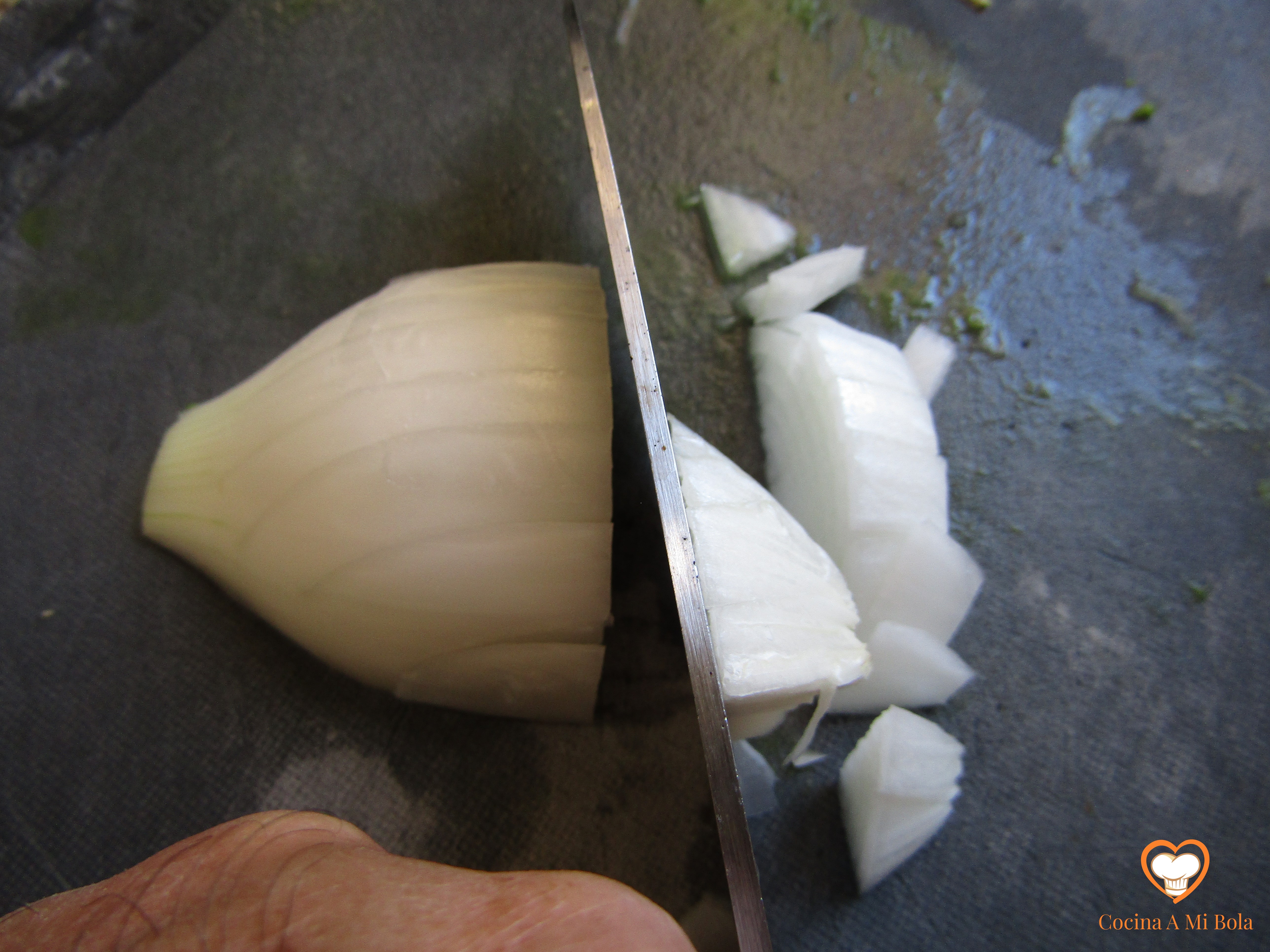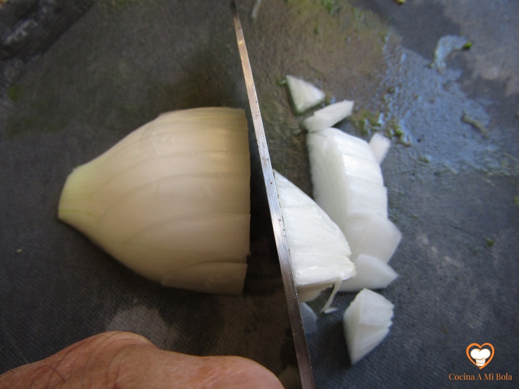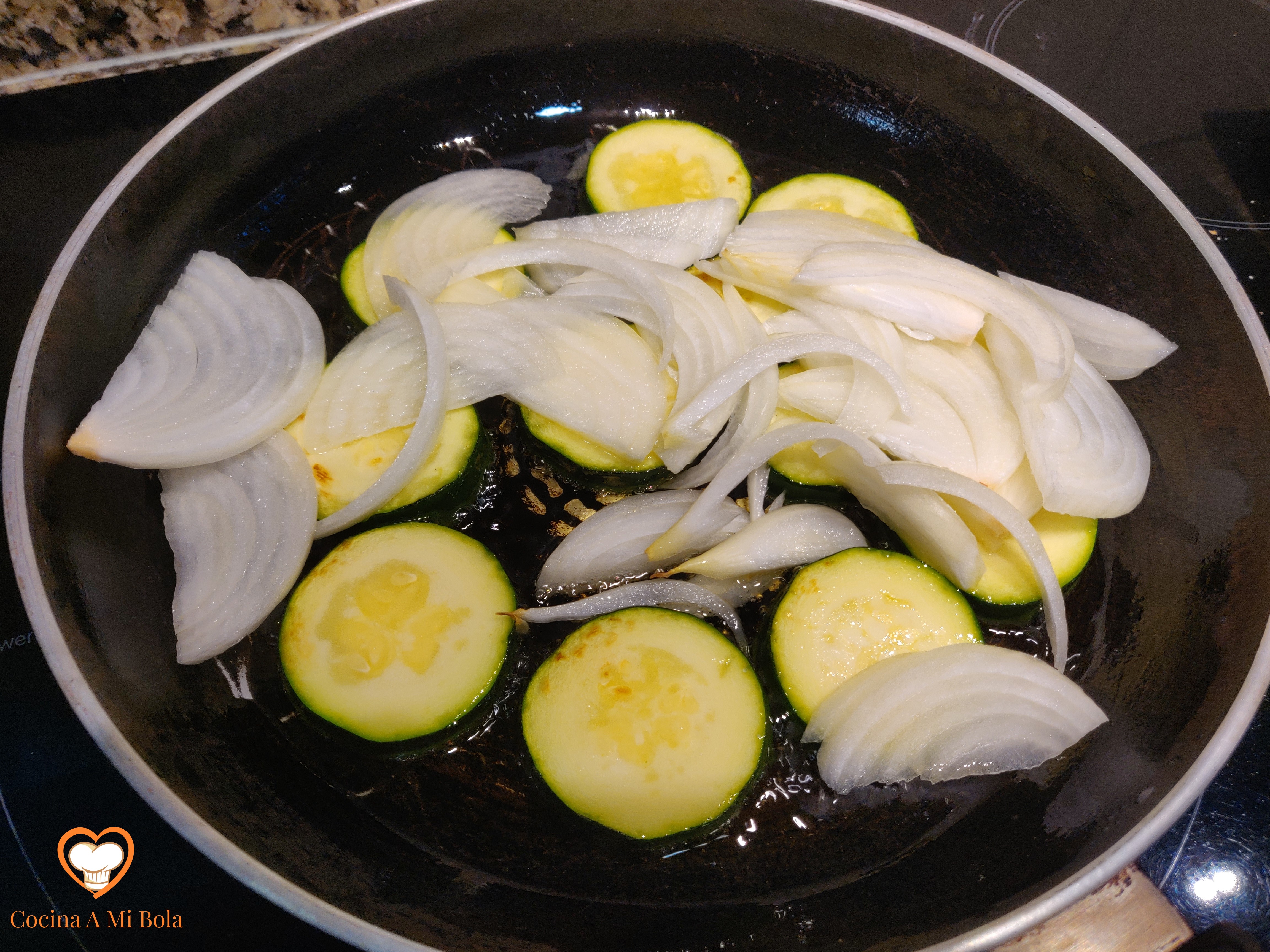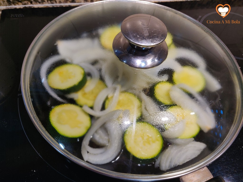 SEGUNDO.- Cuando lleve el calabacín unos cinco minutos en la sartén, pela la cebolla, córtala en juliana y únela al calabacín. Remueve para que se impregne todo del aceite. Queremos que tanto la cebolla como el calabacín queden blandos y melosos, sin que pierdan toda su agua, así que puedes tapar la sartén y poner calor al mínimo durante una buena parte del proceso. De todo modos, estate pendiente para que no se dore. Ponle sal.