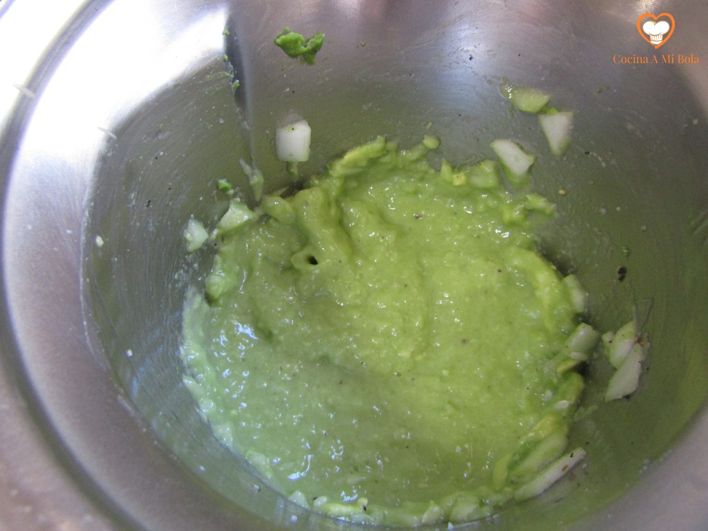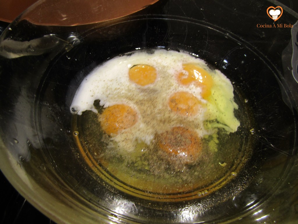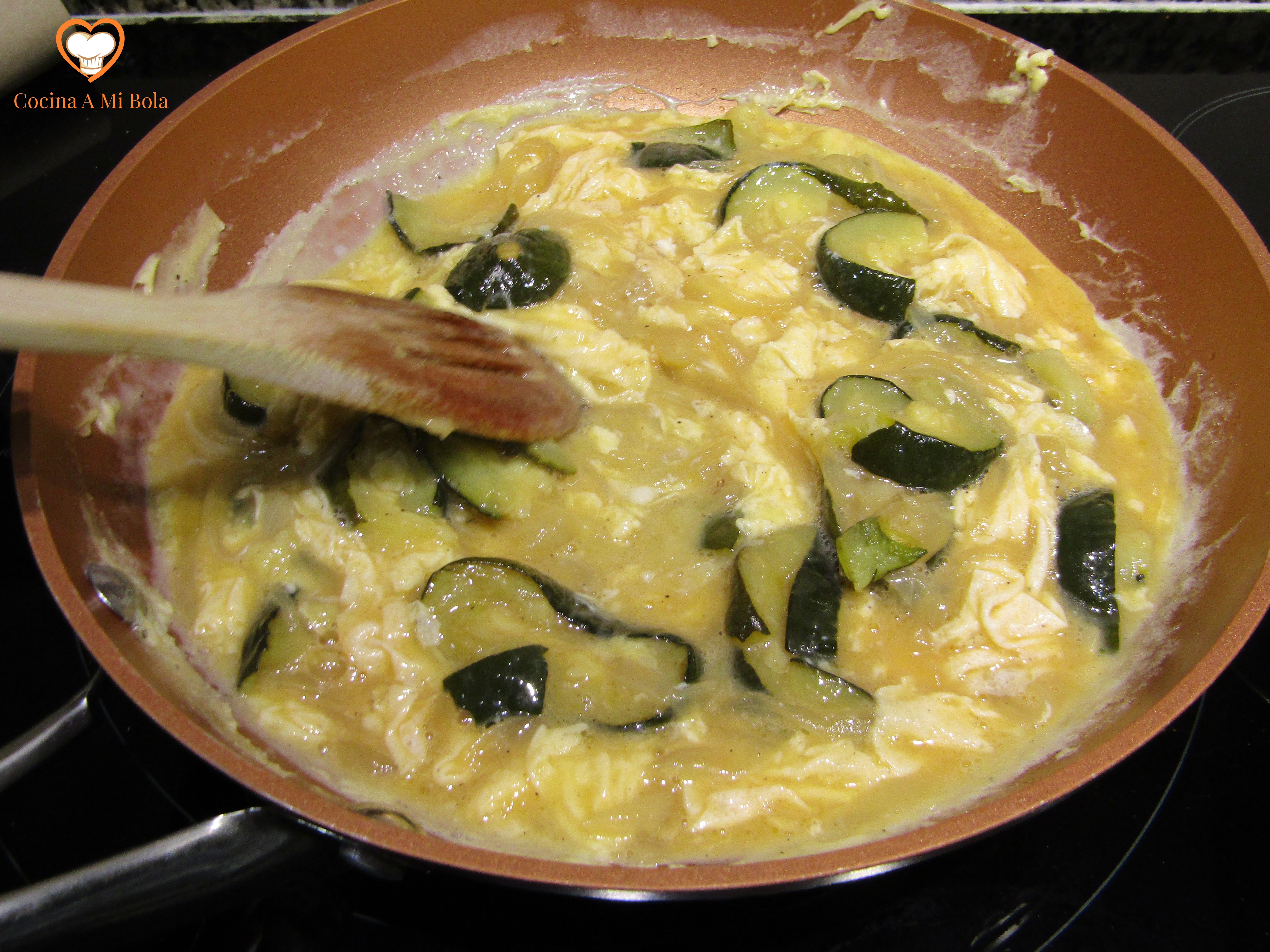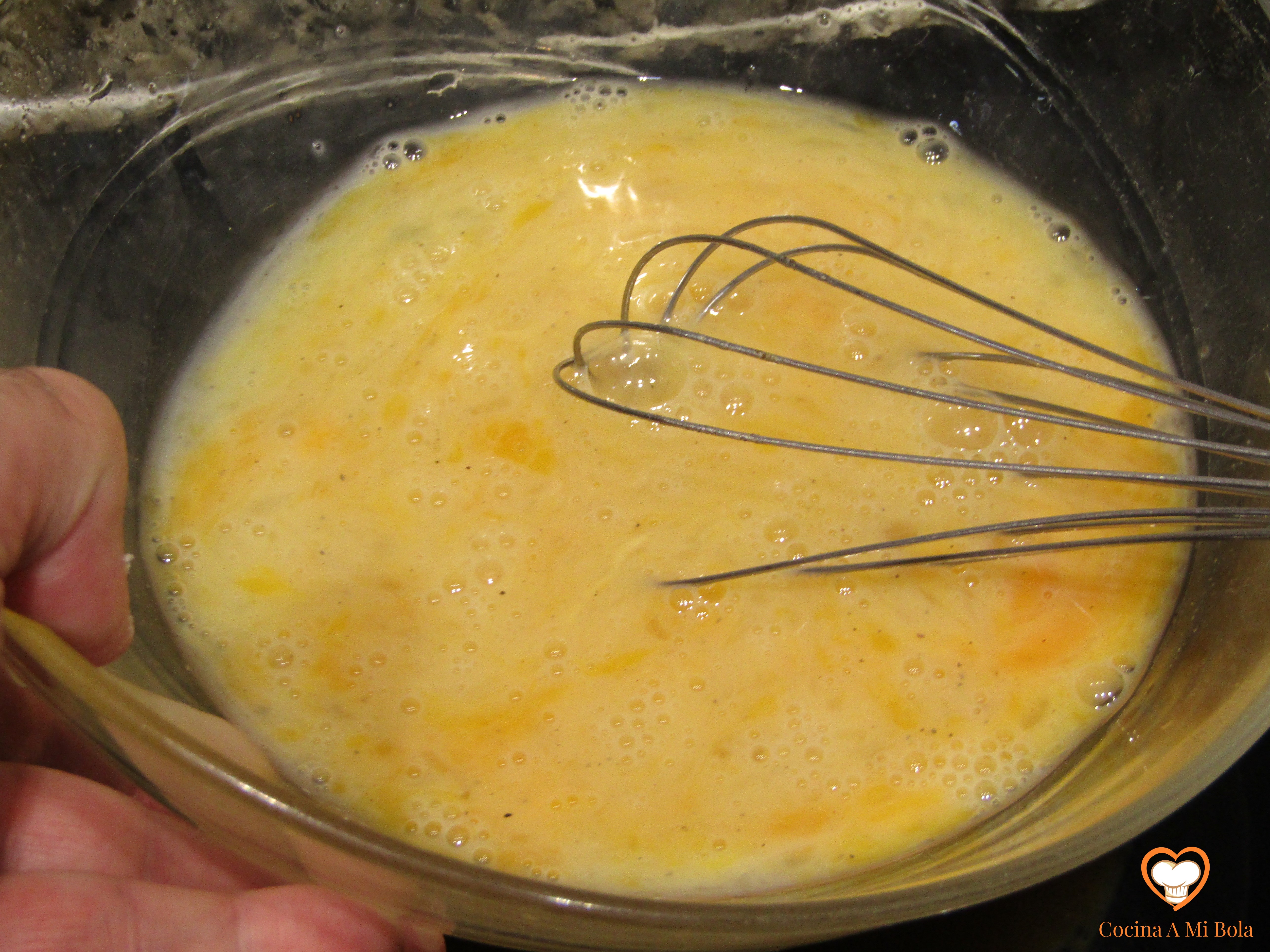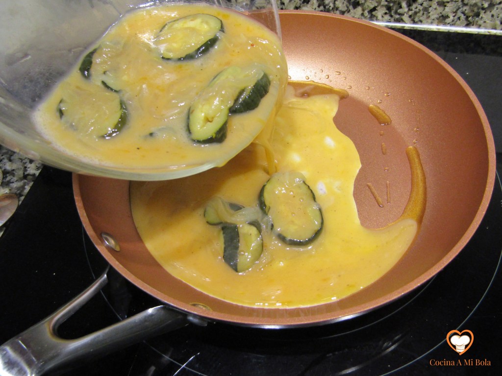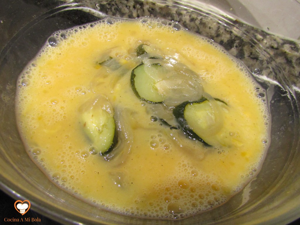 QUINTO.- Vamos ya a hacer el revuelto echando 5 huevos en un bol, la leche, sal y pimienta negra molida (con prudencia para que no mande mucho esta última). Usa la varilla para mezclar todo pero no lo batas demasiado porque resultará más seco y buscamos cierta jugosidad. Agrega ahora la cebolla y el calabacín y mezcla con mucho mimo para que no se nos haga todo un puré.