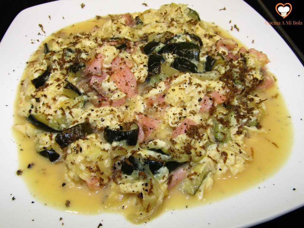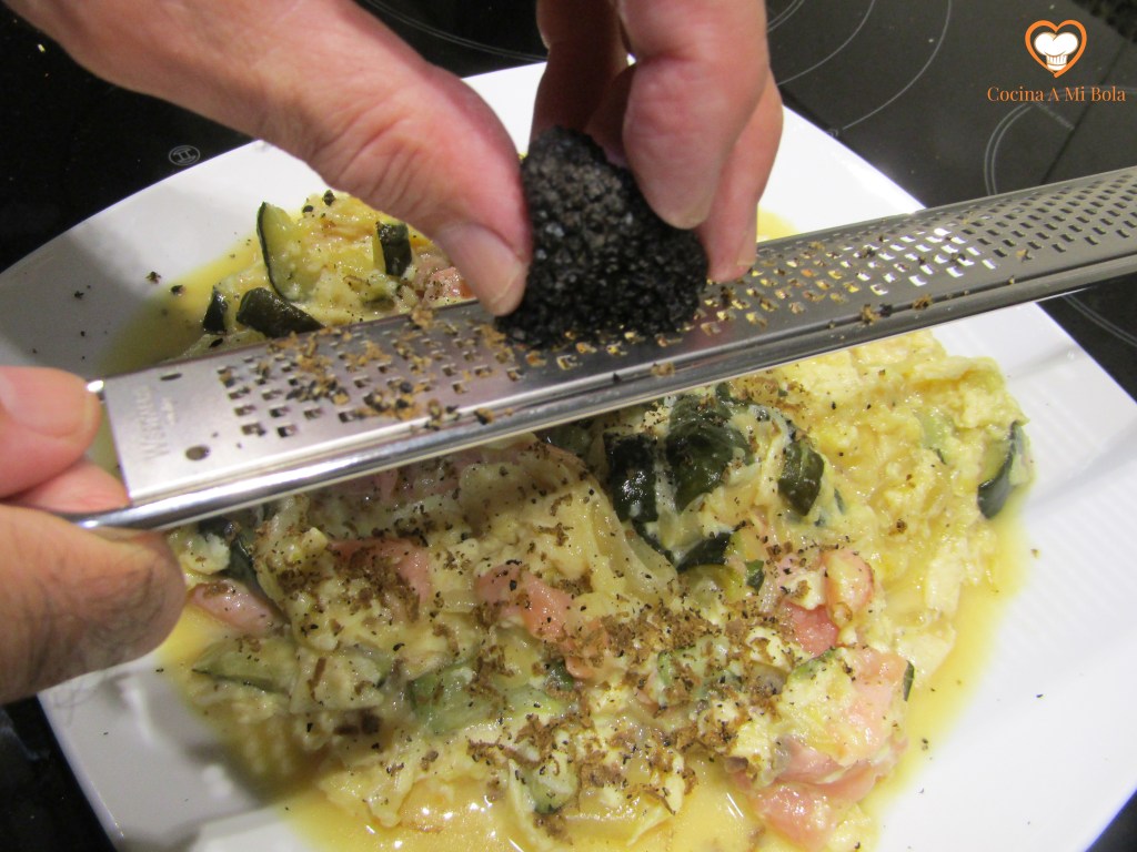 INGREDIENTES: Para 2 personas: ½ calabacín, ½ cebolla, 100 gr salmón ahumado, 5 huevos, pimienta, aceite de oliva, sal, 3 cucharadas soperas de leche y trufa rallada.