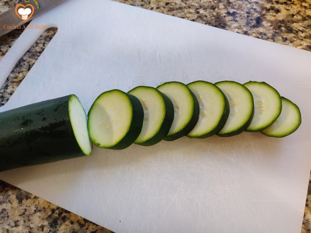 PRIMERO.- Lava el calabacín, sécalo y córtalo en rodajas de no más de 1 cm de grosor. Pon una sartén al fuego con un par de cucharadas de aceite de oliva. Vamos a pocharlo sin que llegue a tostarse, así que hazlo a fuego medio bajo.