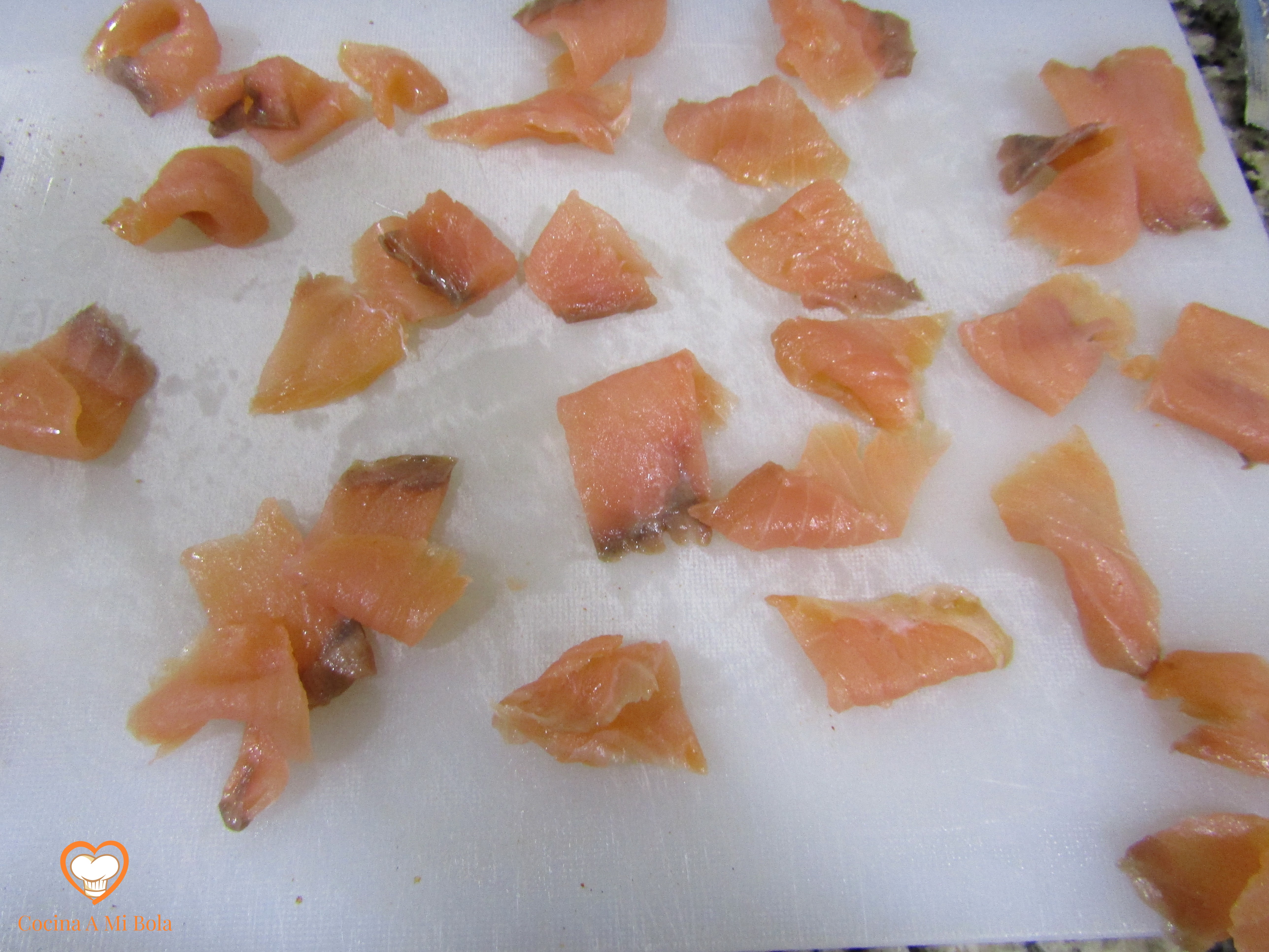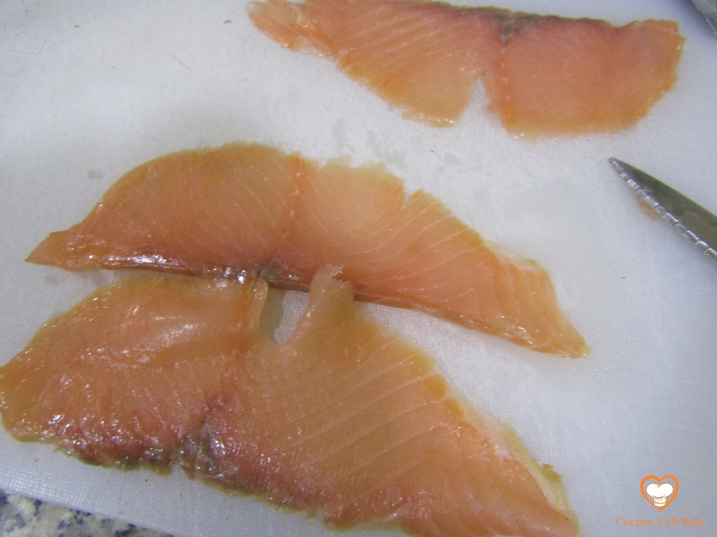 TERCERO.- Mientras se hace la verdura, corta el salmón ahumado en trozos que no sean muy pequeños. Mira la foto. Yo diría de 2×2 cm, más o menos. Resérvalo.