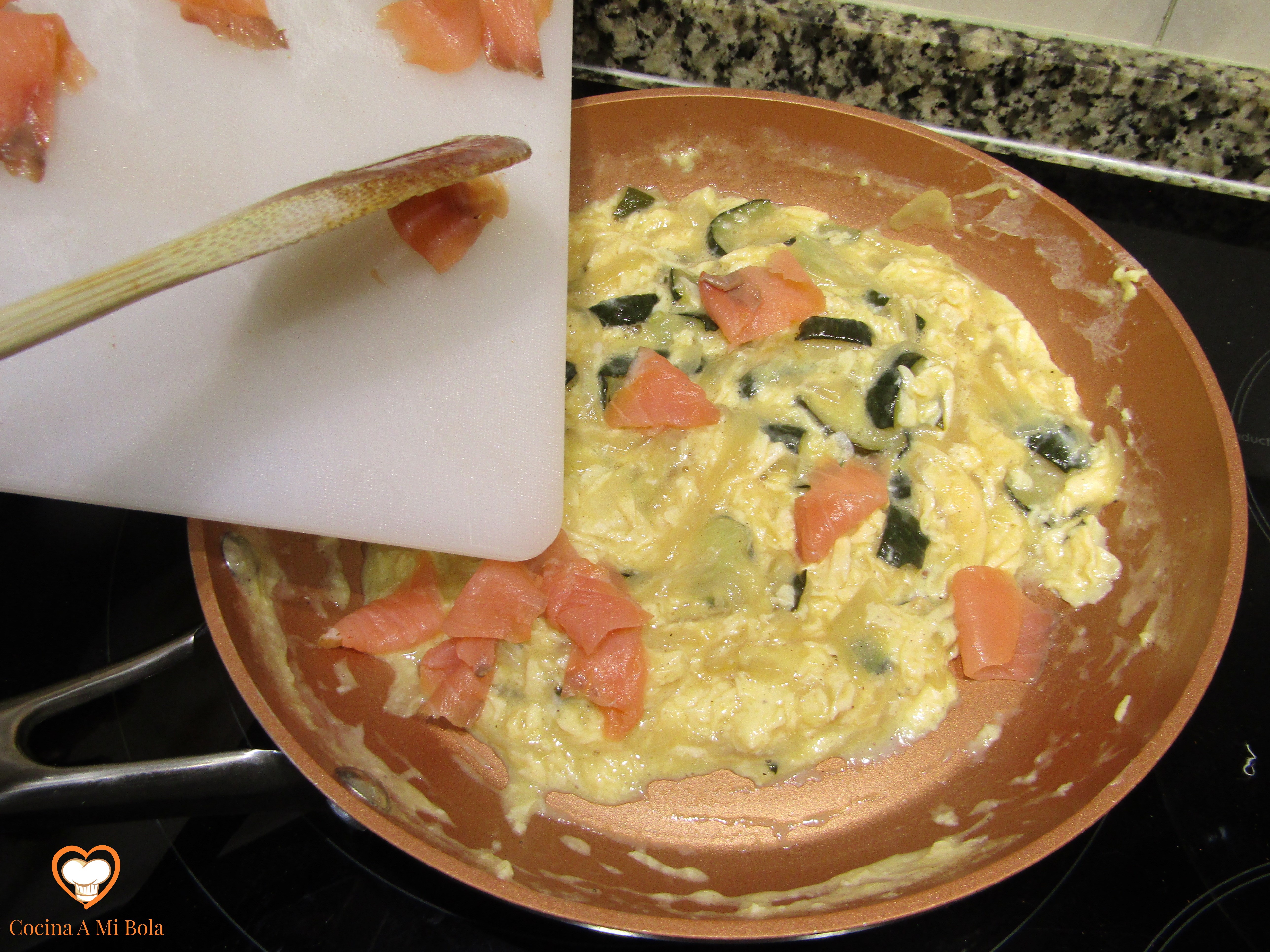 SÉPTIMO.- Como el salmón ahumado no necesita ser cocinado, échalo una vez hayas apagado el fuego y mézclalo con todo el revuelto aprovechando el calor residual.