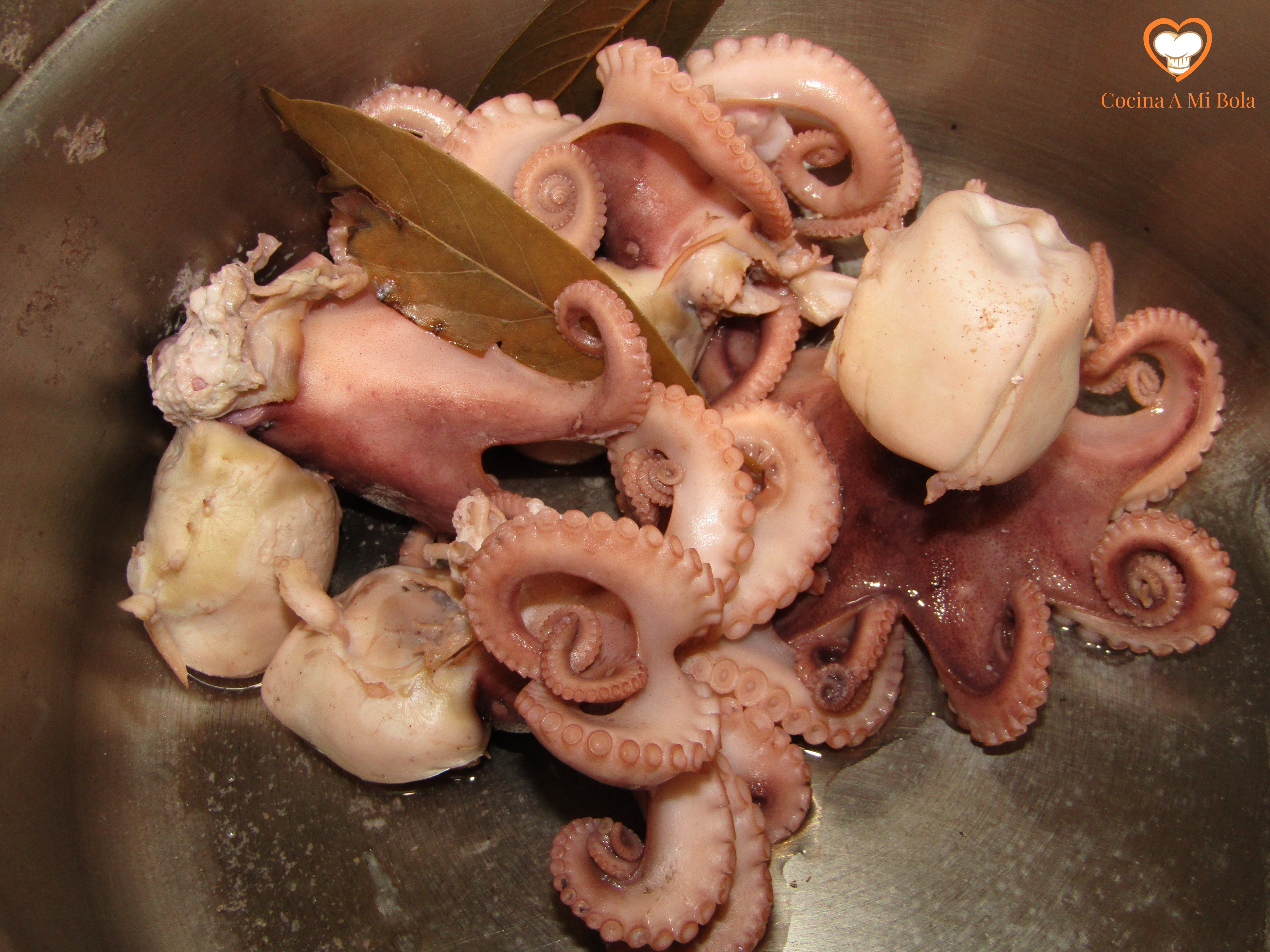 PRIMERO.- Pon a cocer una olla express rápida y abierta con agua por la mitad. Echa un par de hojas de laurel. Y mientras tanto, limpia bien los pulpos vaciándoles la cabeza y dándola del revés. Utiliza unas tijeras de cocina o un cuchillo fino para cortar una especie de nervios que te van a impedir vaciarla bien.